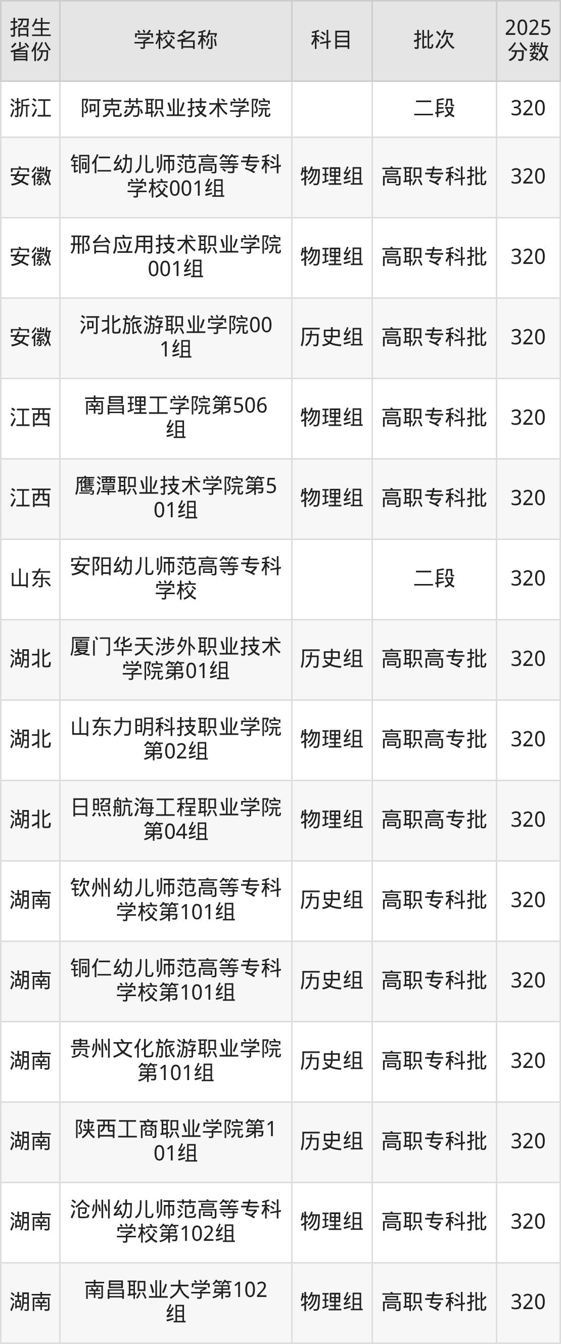 湖南省物理组分数线是320分的文科大学有:沧州幼儿师范高等专科学校、南昌职业大学、毕节幼儿师范高等专科学校。