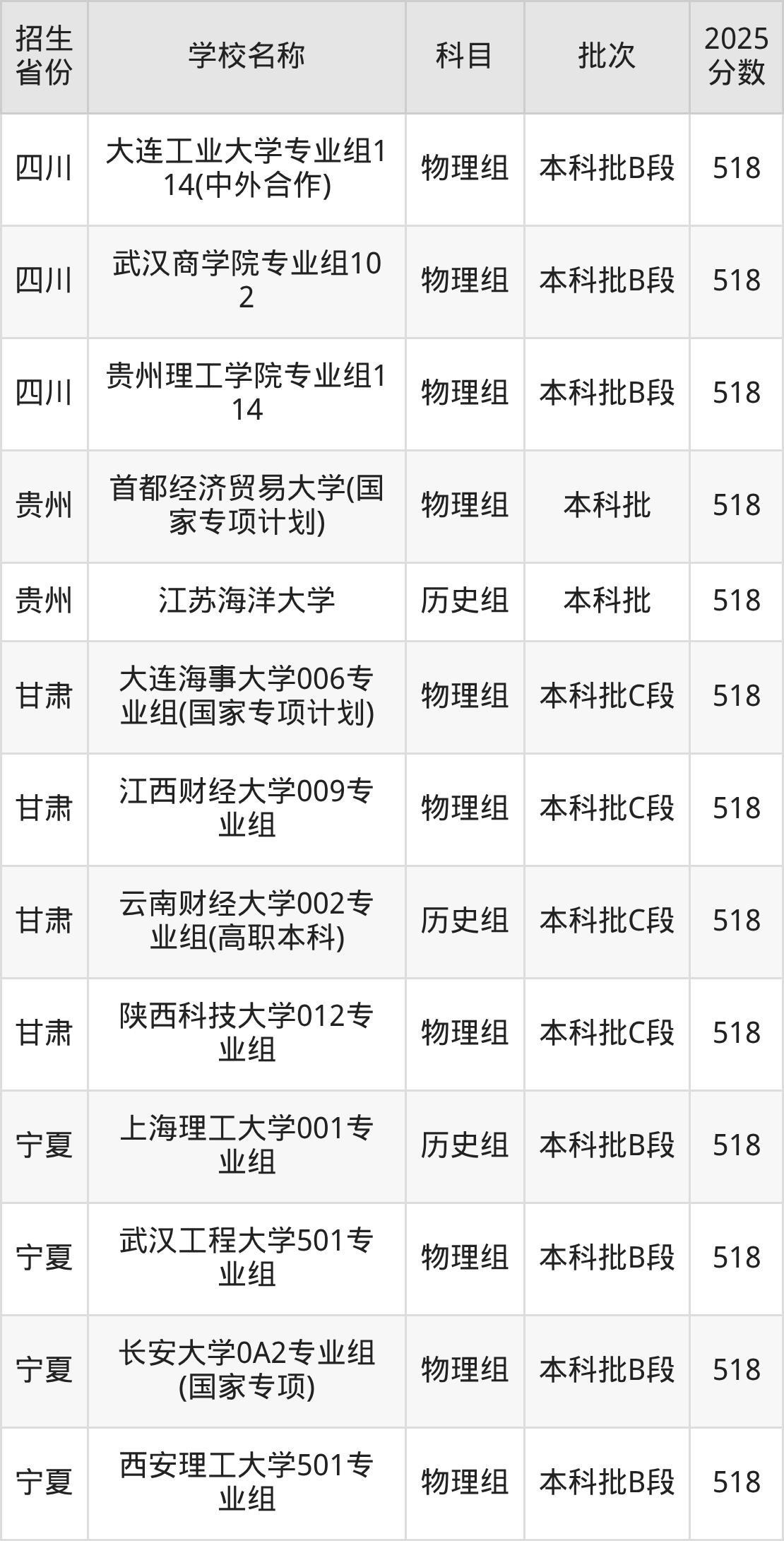 筛选全国各省2025年录取分数线为518分的理科大学如下: