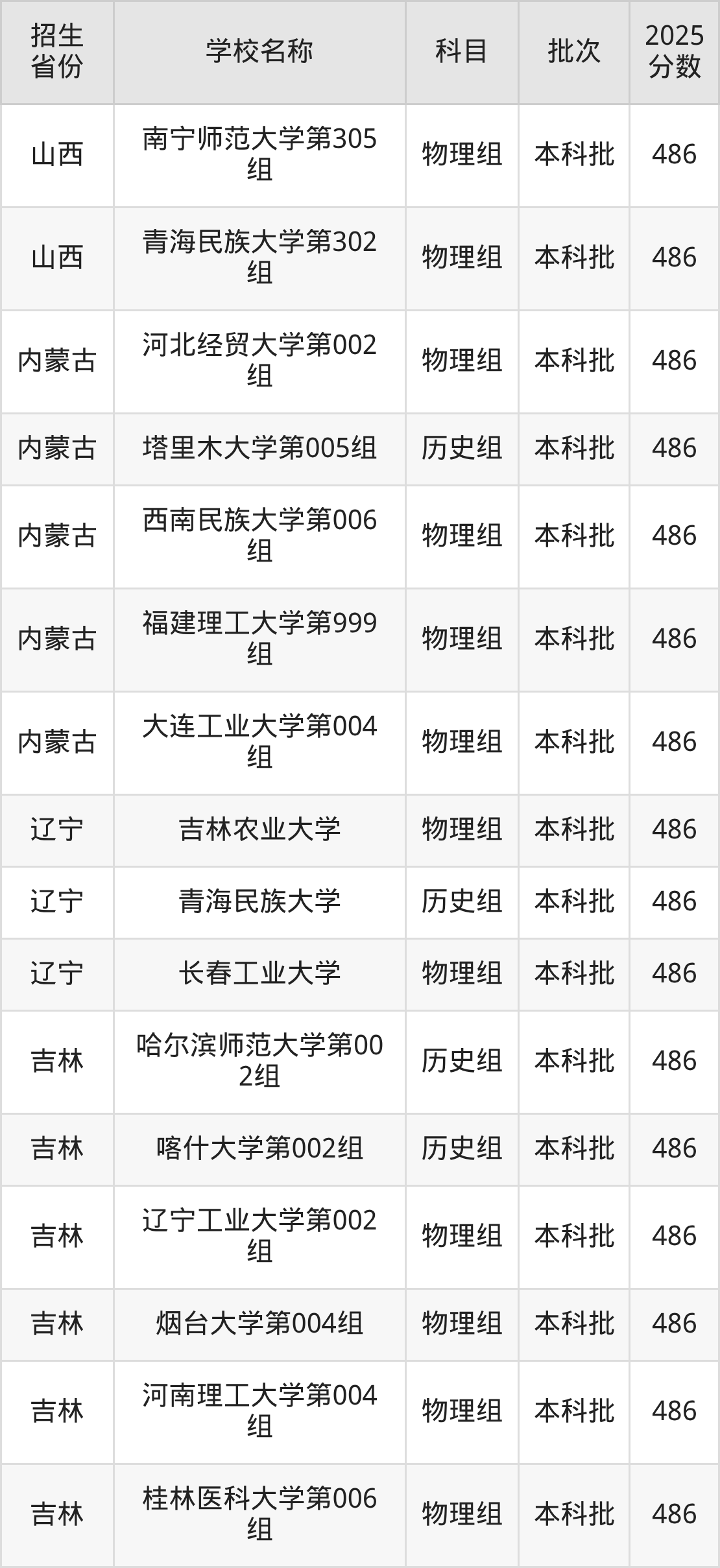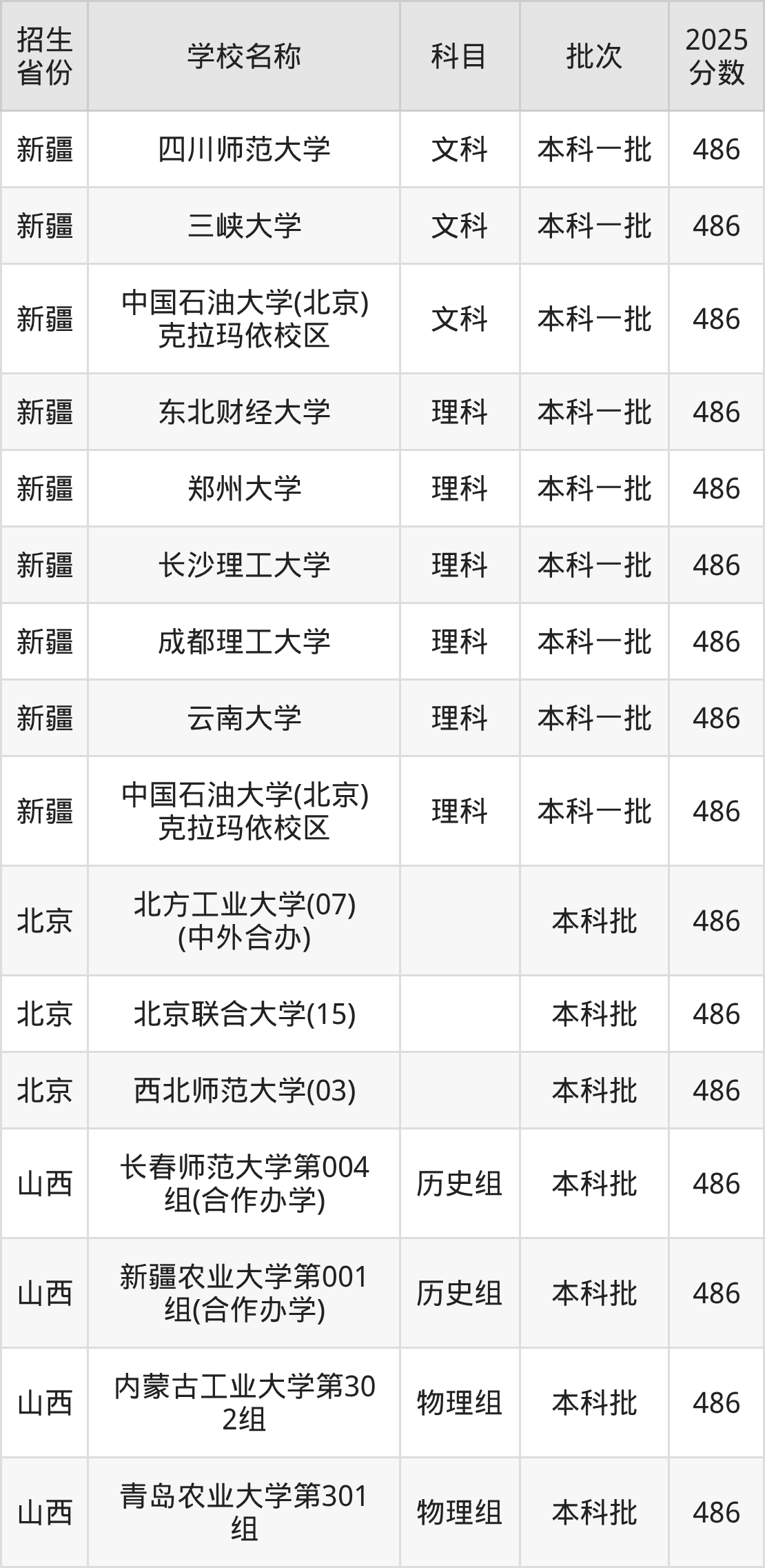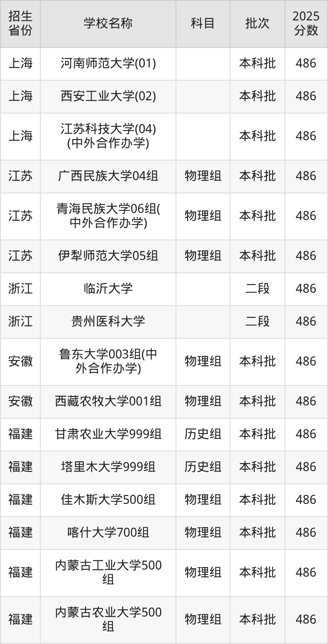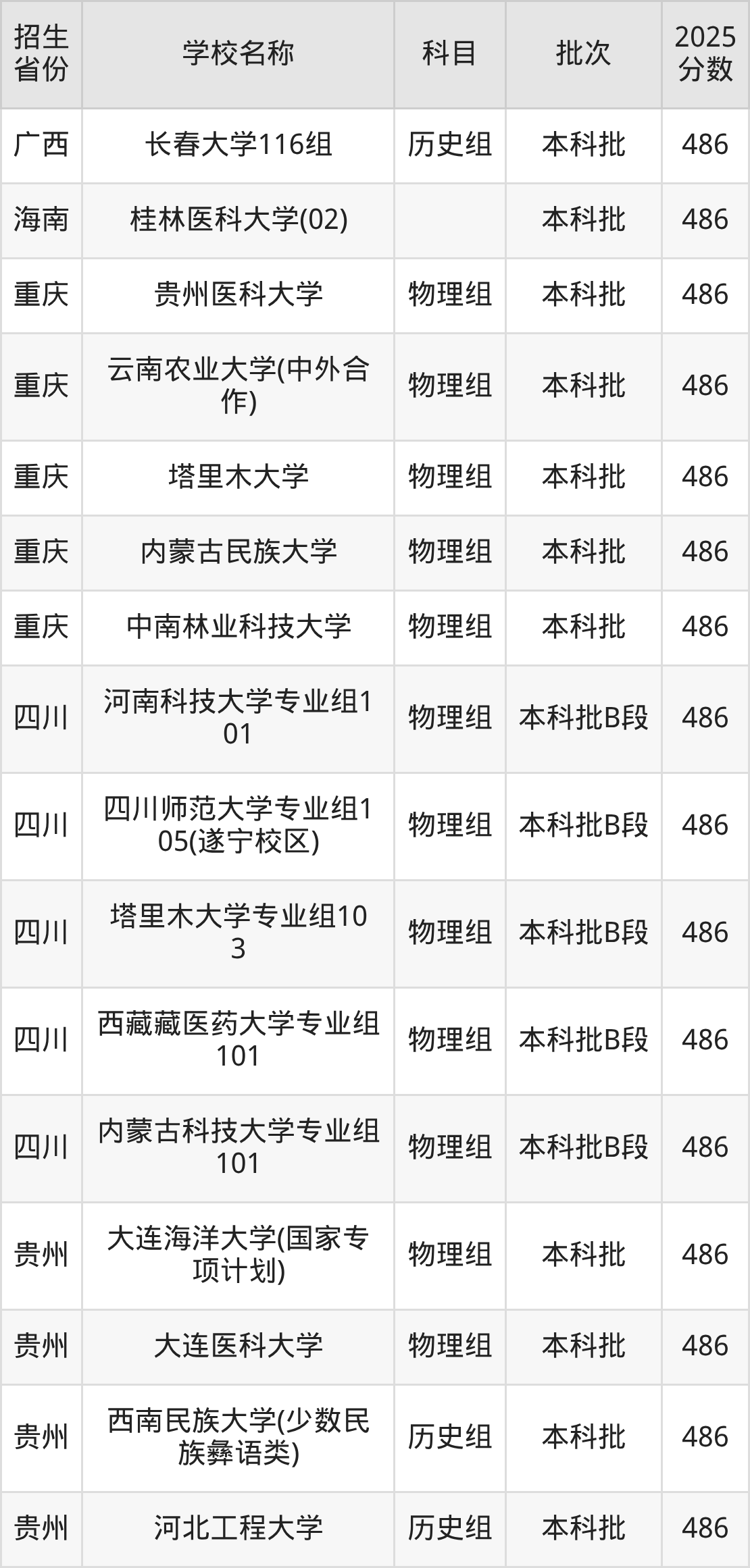 筛选全国各省2025年录取分数线为486分的一本大学如下: