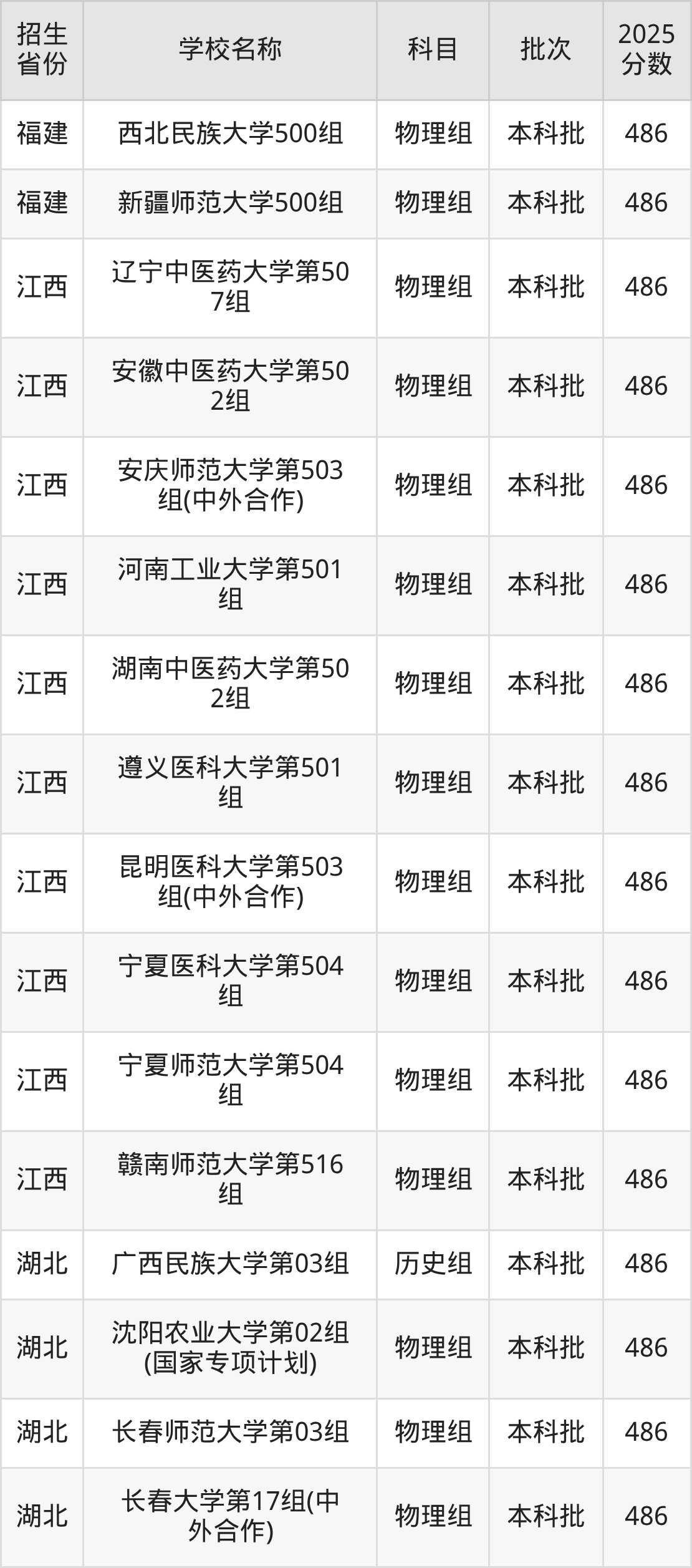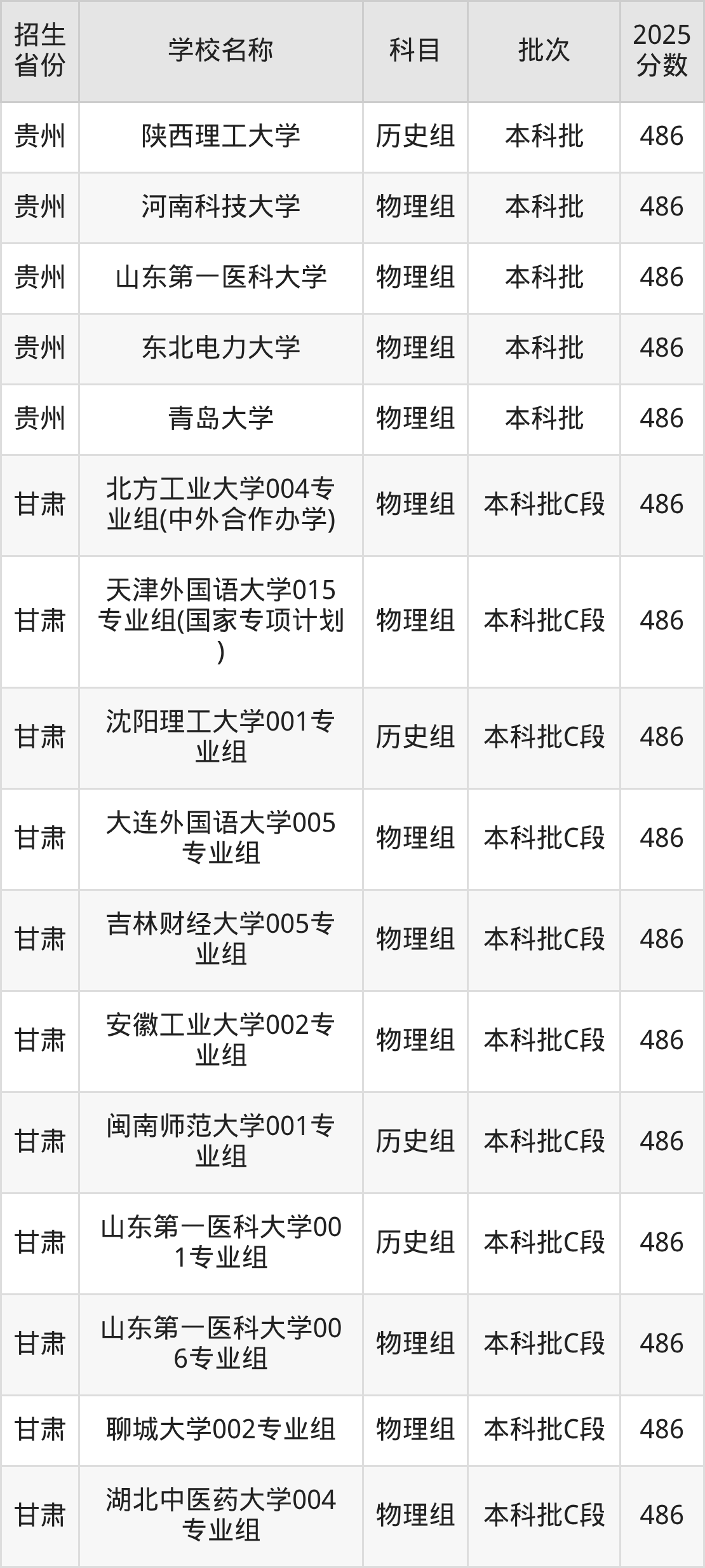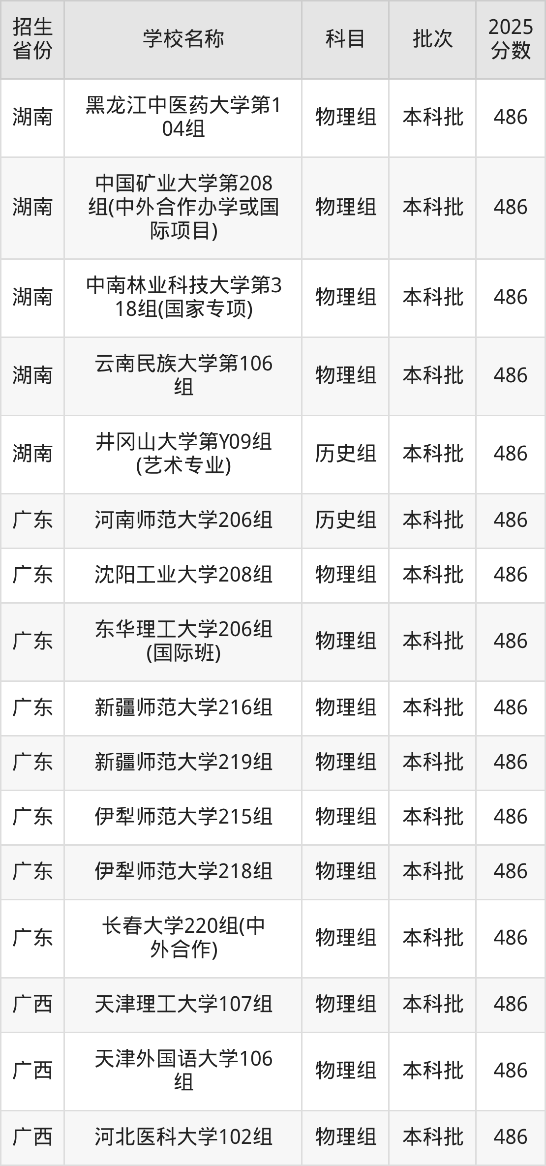 筛选全国各省2025年录取分数线为486分的一本大学如下: