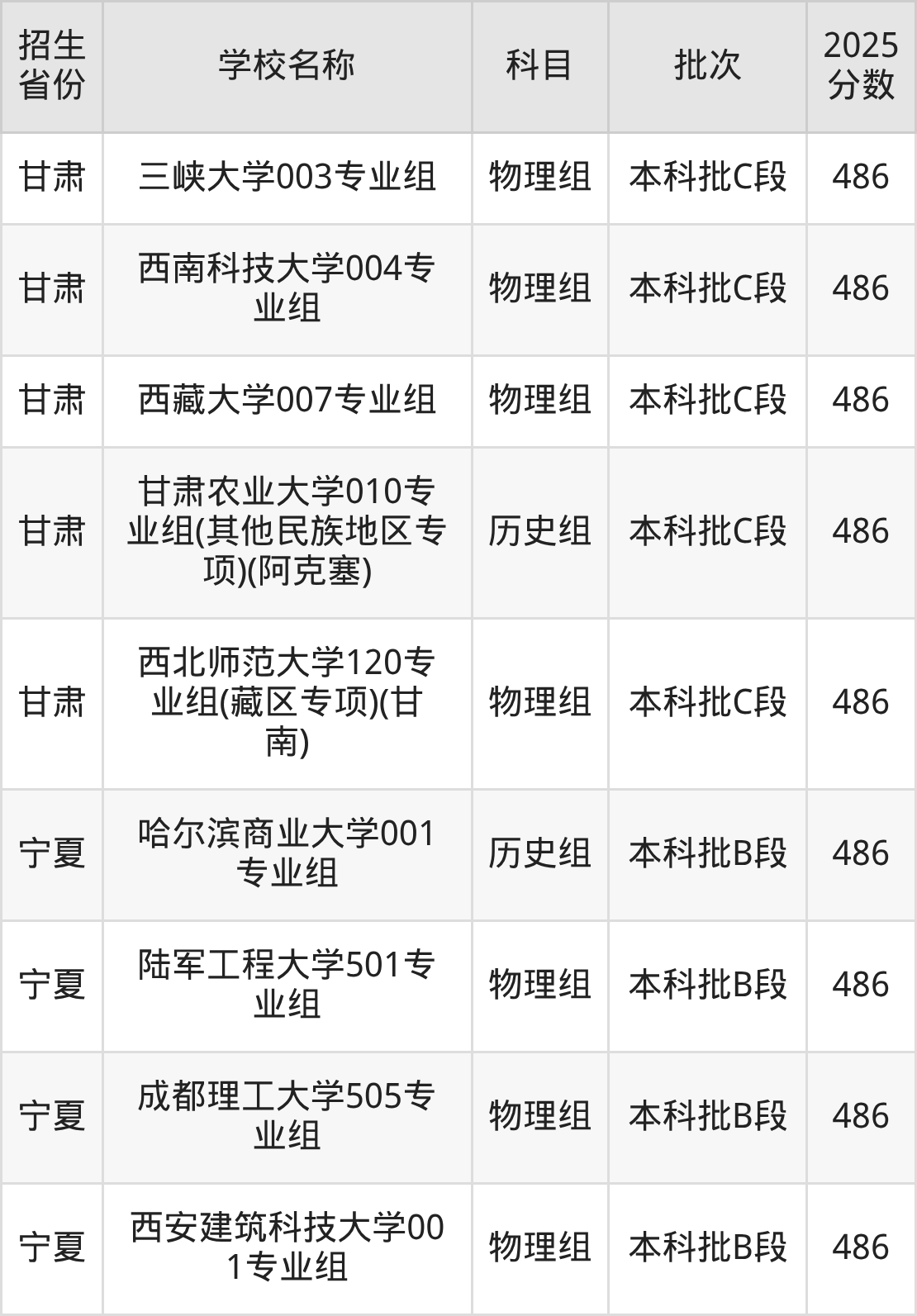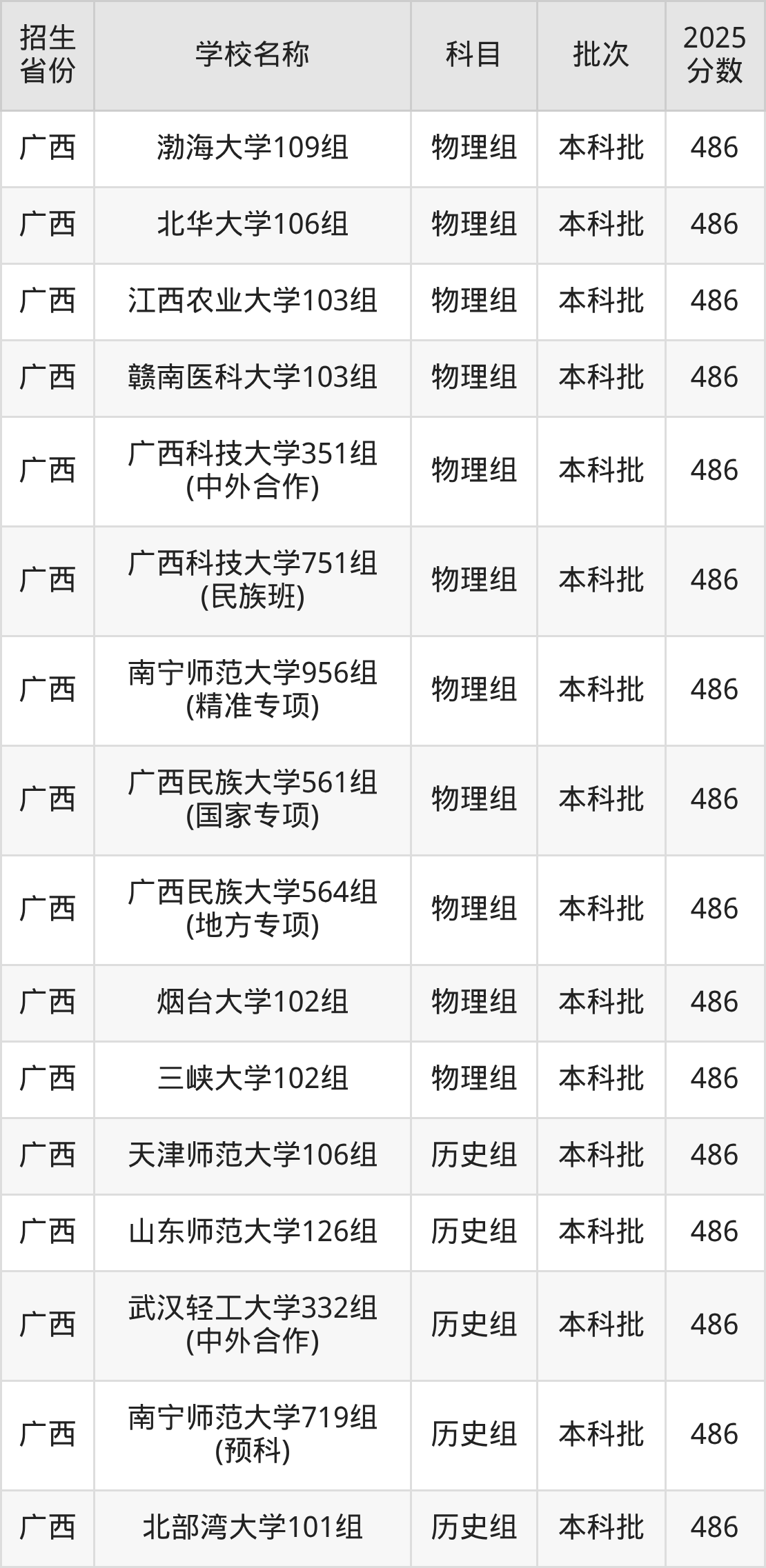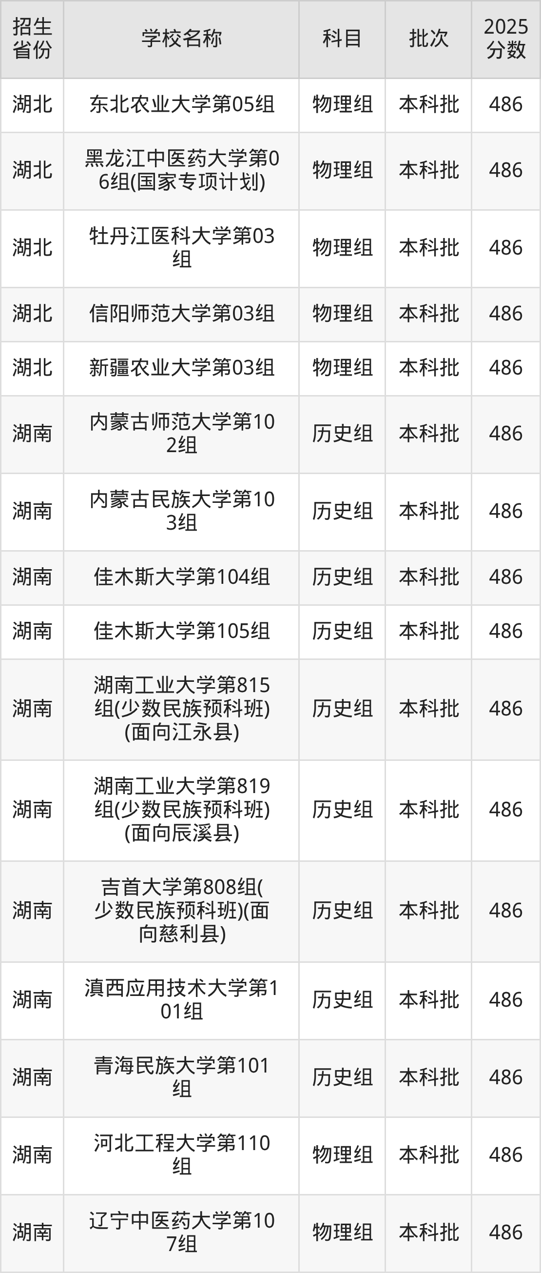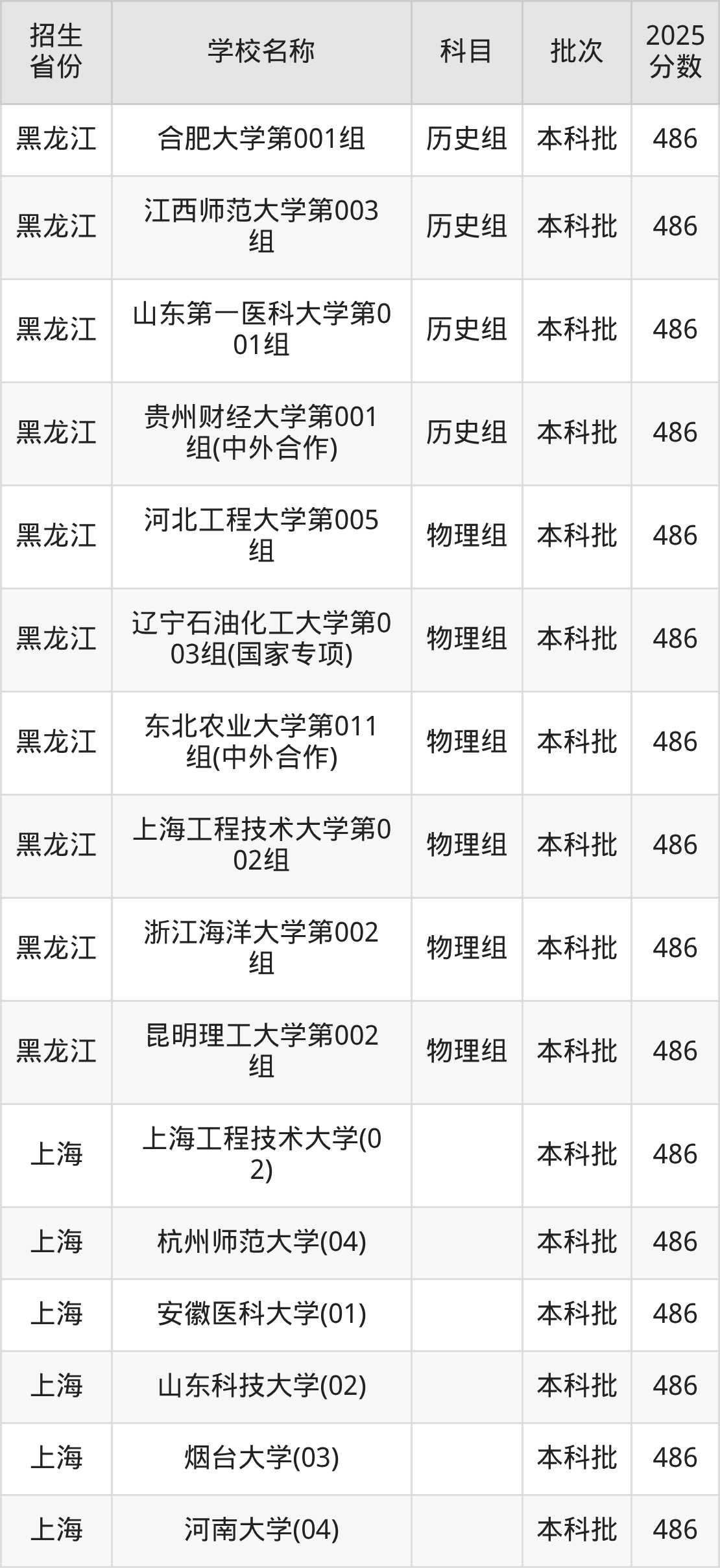筛选全国各省2025年录取分数线为486分的一本大学如下: