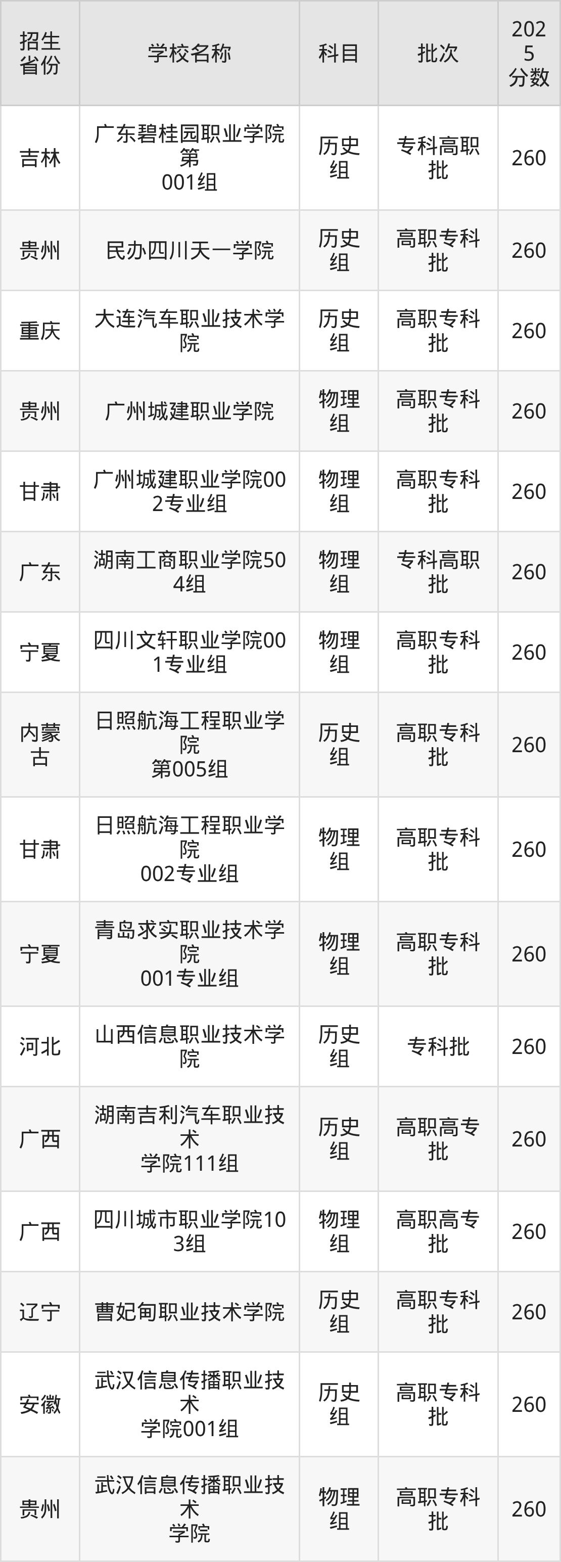 二、各省260分的民办专科学校名单