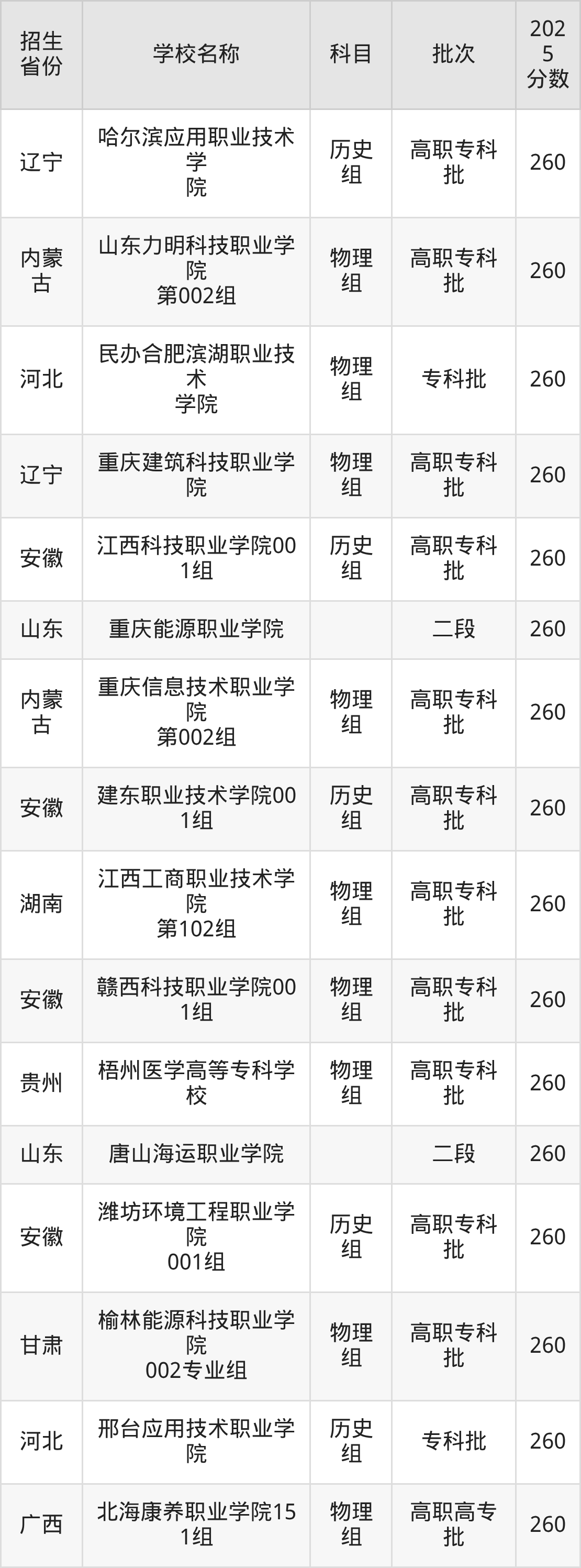 安徽省物理组分数线是260分的民办专科学校有:赣西科技职业学院。