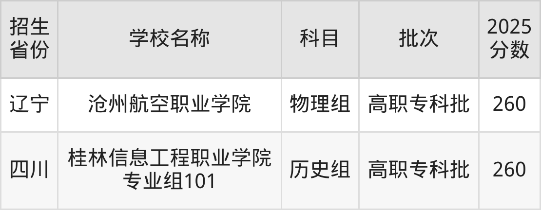 筛选全国各省2025年录取分数线为260分的民办专科学校如下: