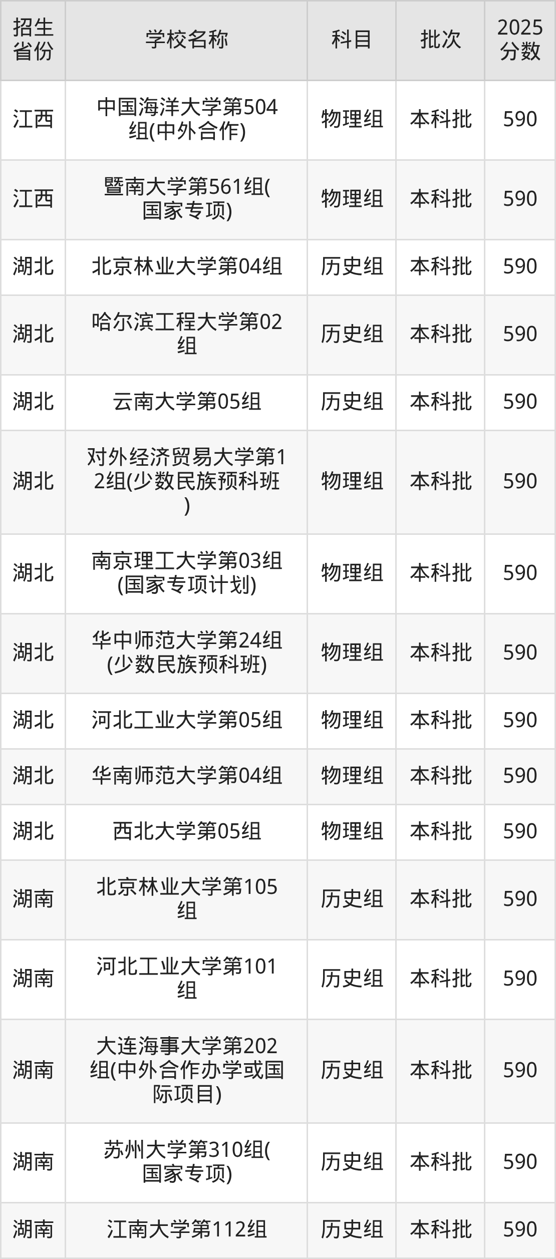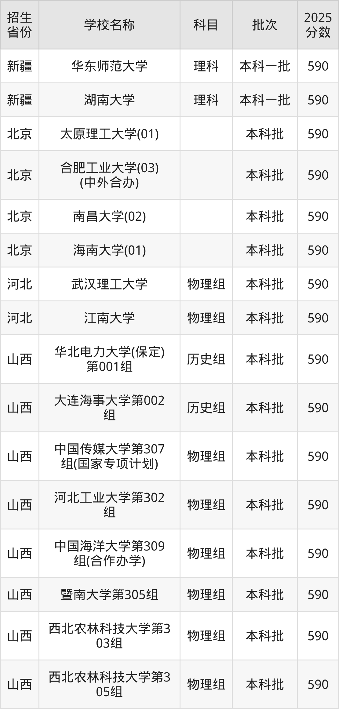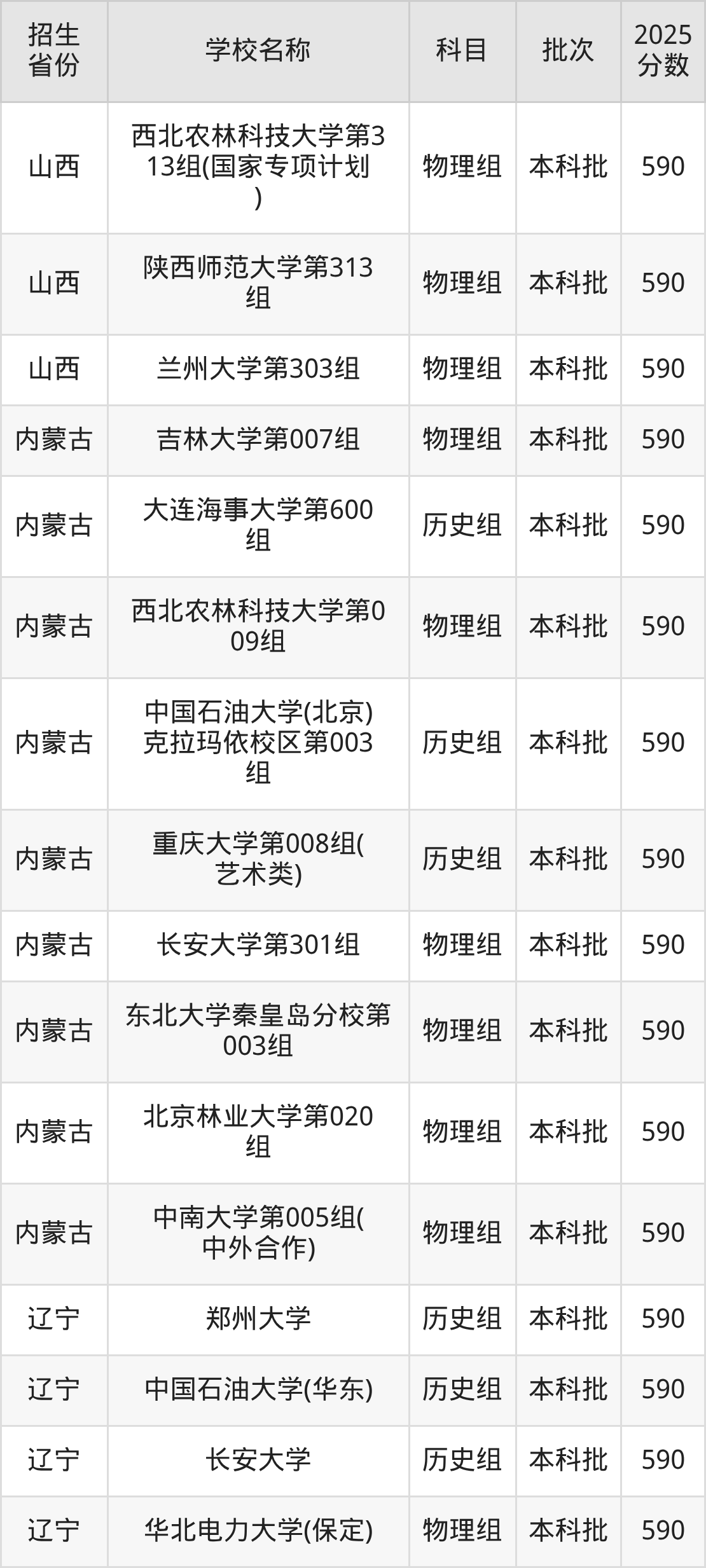 筛选全国各省2025年录取分数线为590分的211大学如下:
