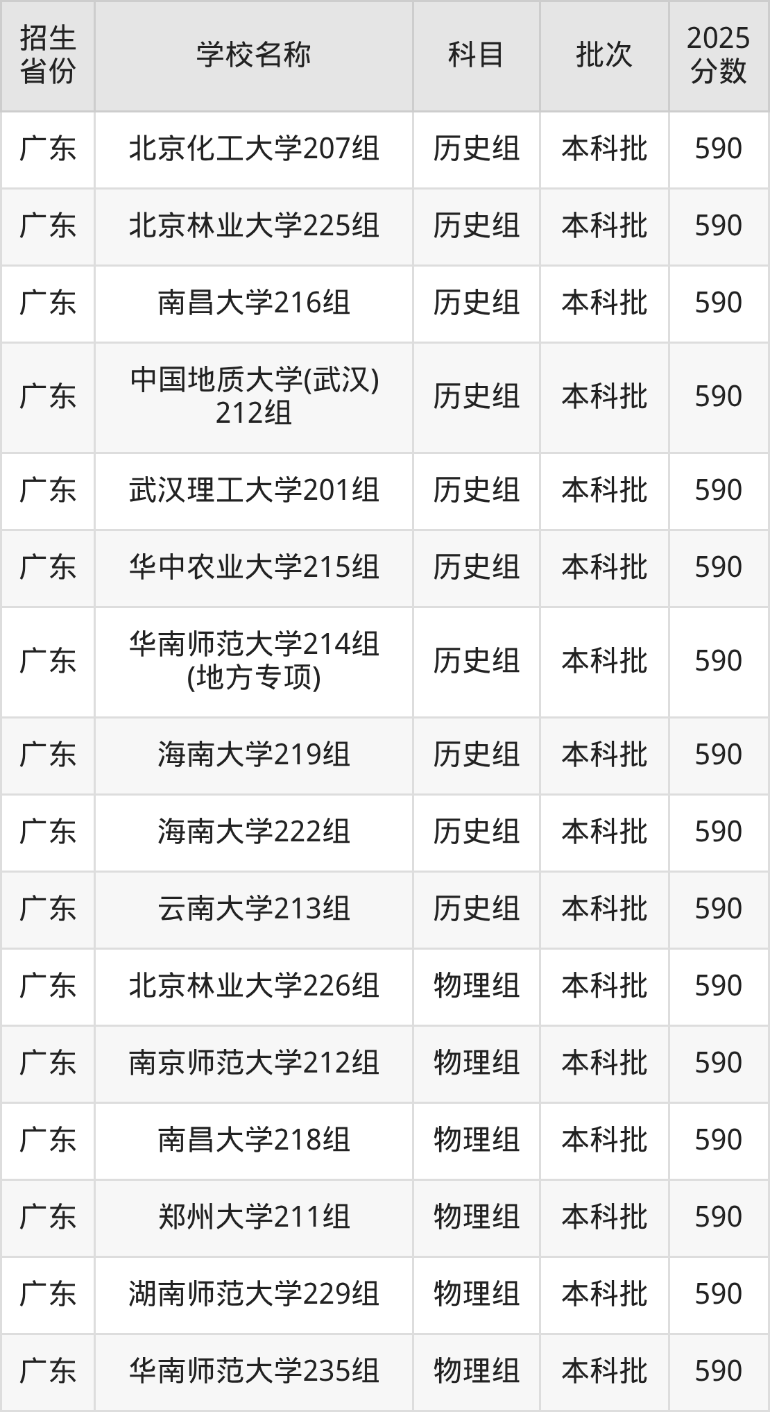 广东省历史组分数线是590分的211大学有:北京化工大学、北京林业大学、南昌大学、中国地质大学(武汉)、武汉理工大学、华中农业大学、华南师范大学、海南大学、云南大学。