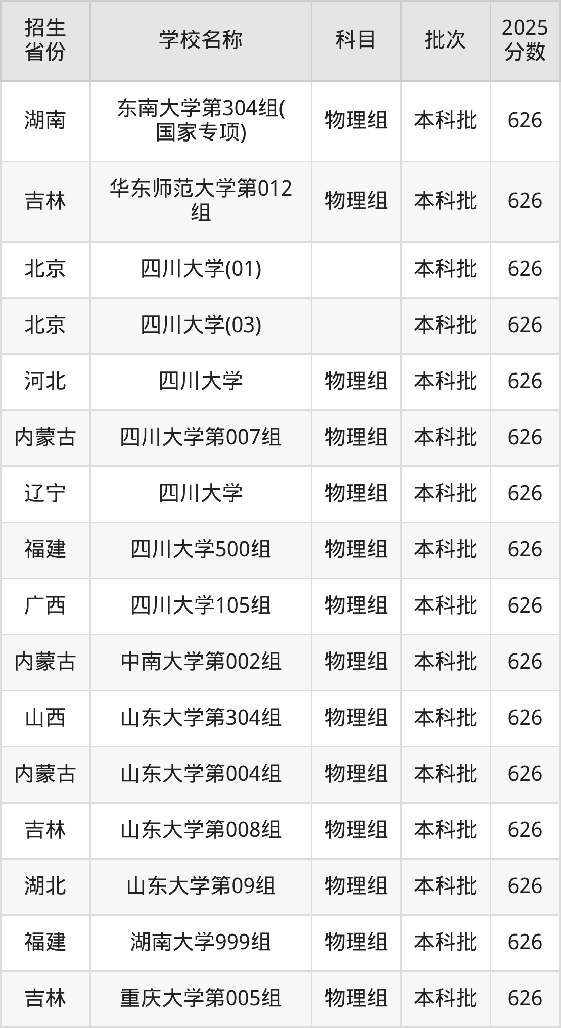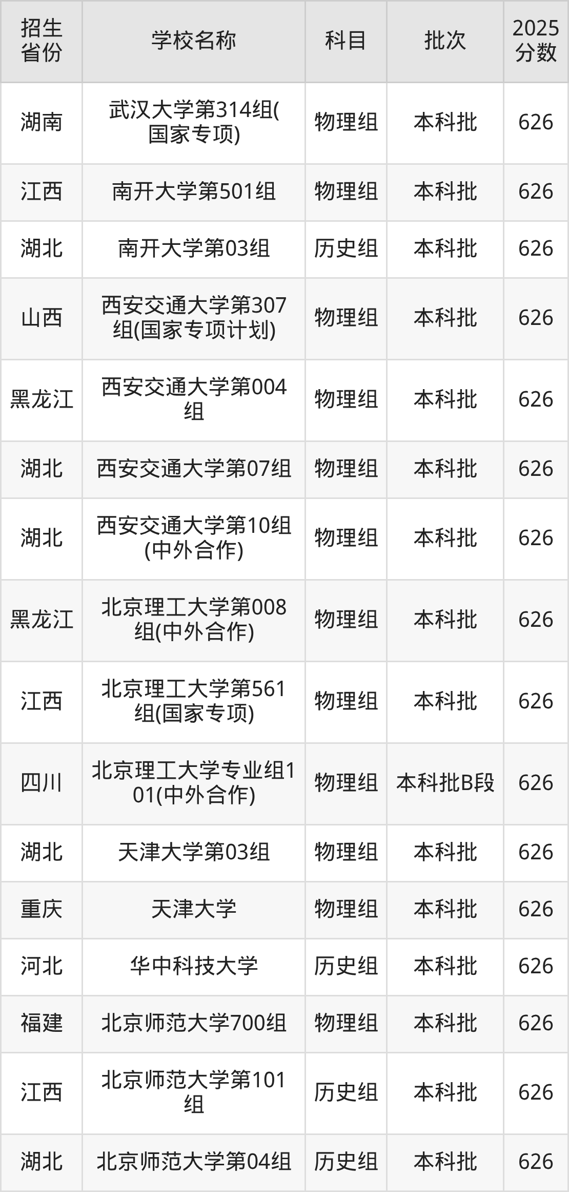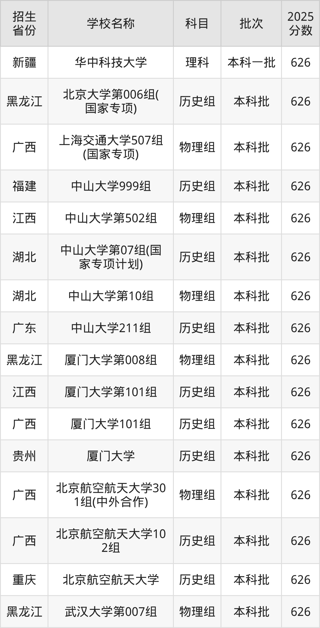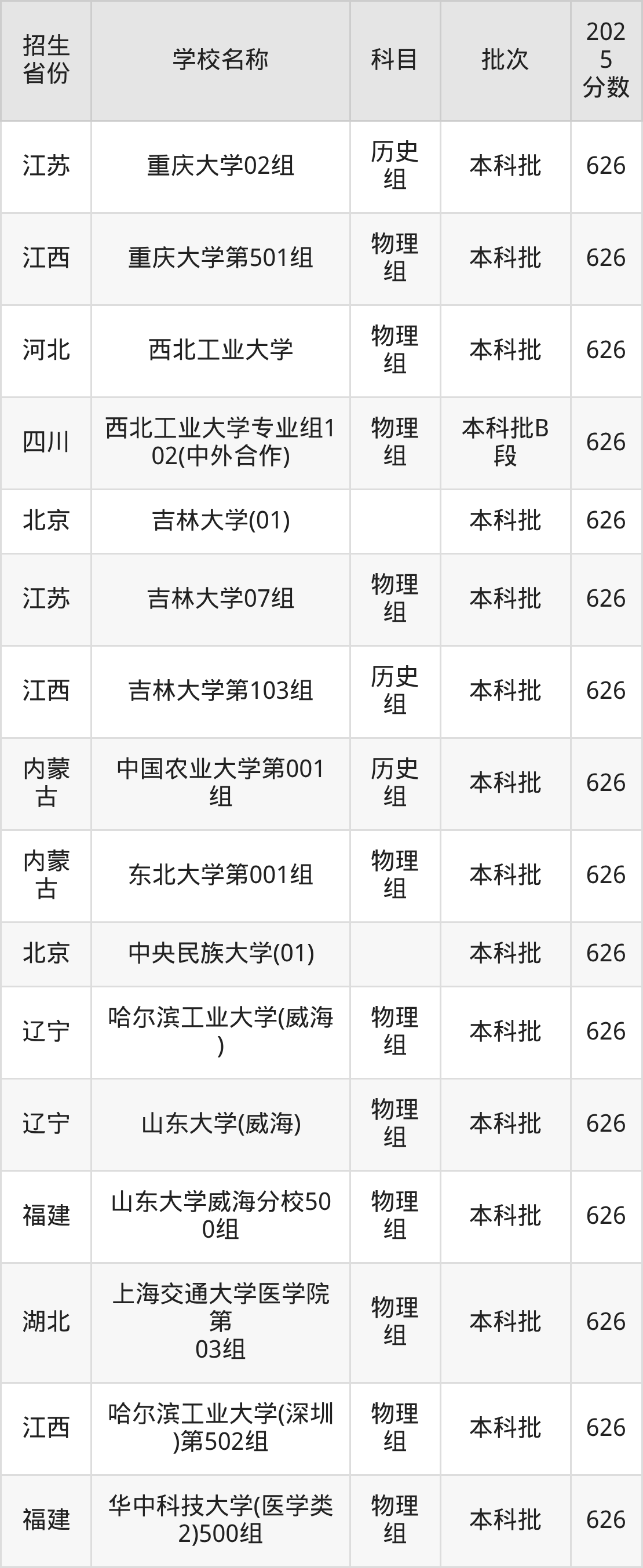 筛选全国各省2025年录取分数线为626分的985大学如下:
