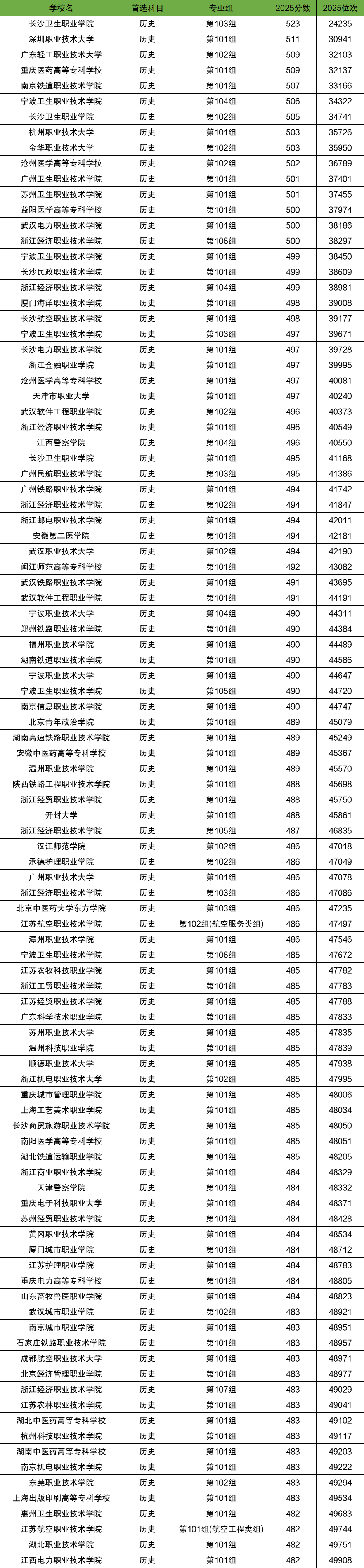 2025年江西各大学历史类专科批次分数最高的100个院校专业组如下: