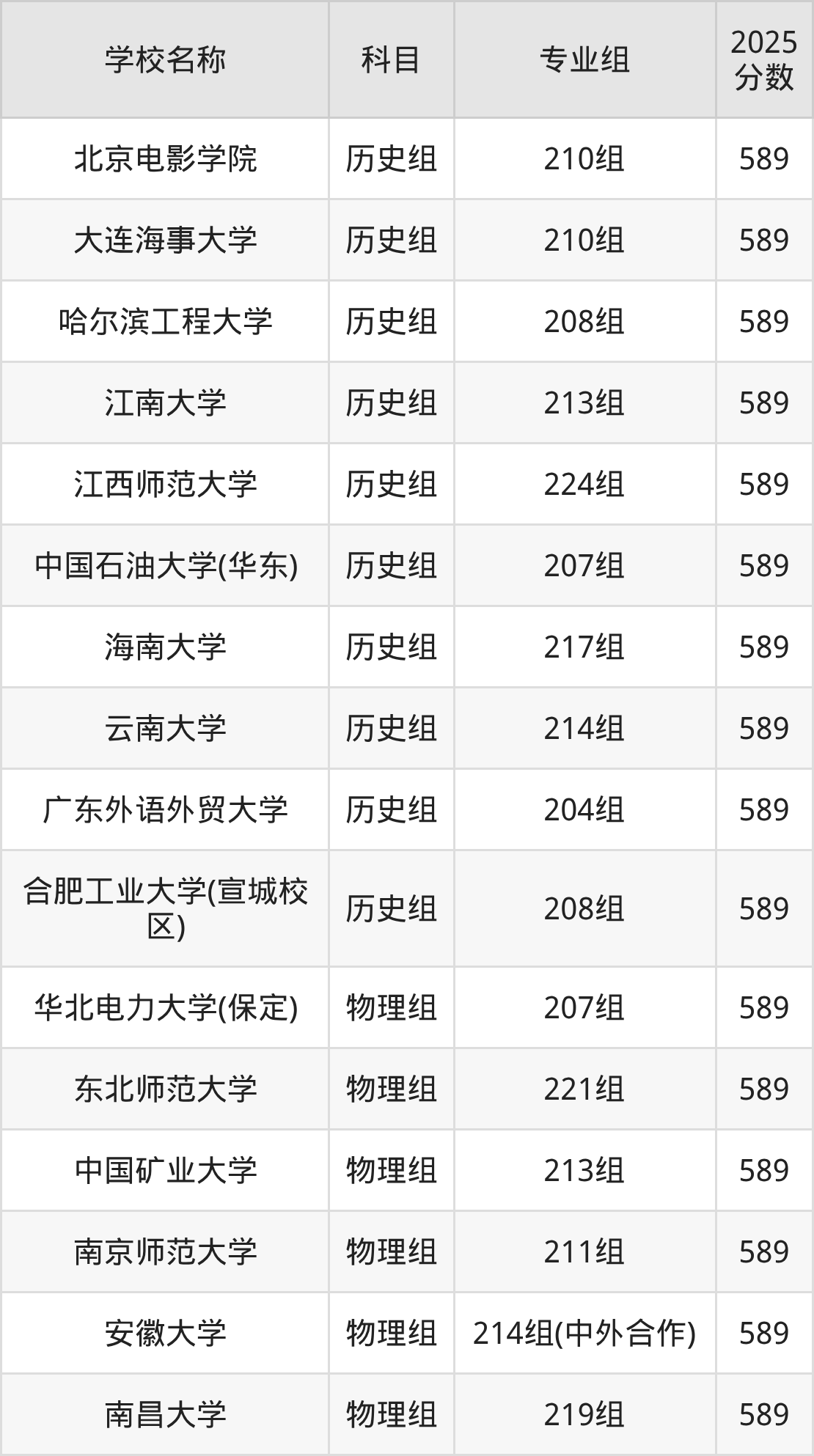 广东高考录取分数线在589分左右的公办院校专业组一共有22个,其中历史组有:北京电影学院(589分)、大连海事大学(589分)、哈尔滨工程大学(589分),物理组有:华北电力大学(保定)(589分)、东北师范大学(589分)、中国矿业大学(589分)。