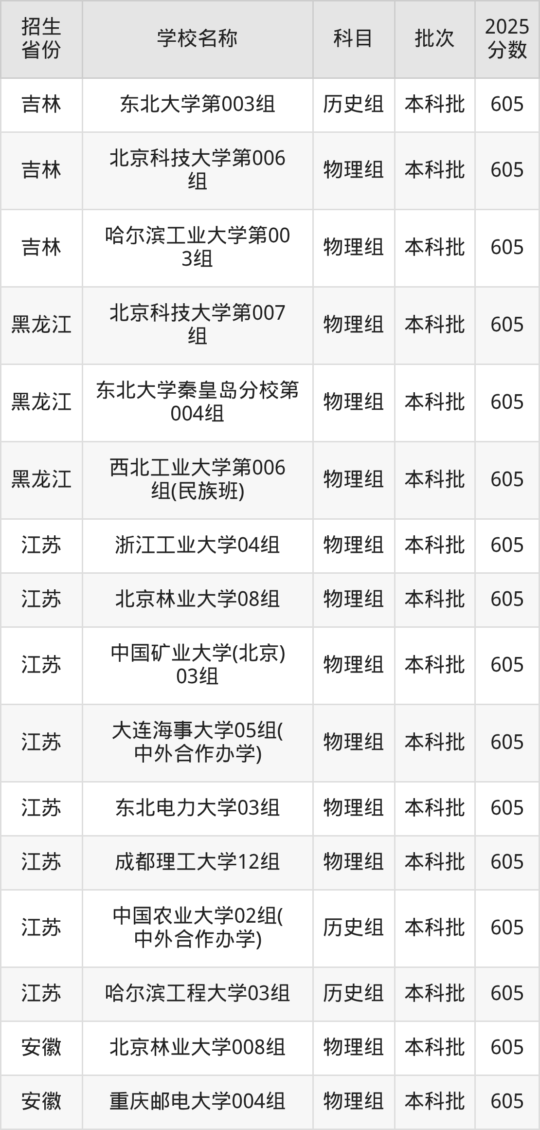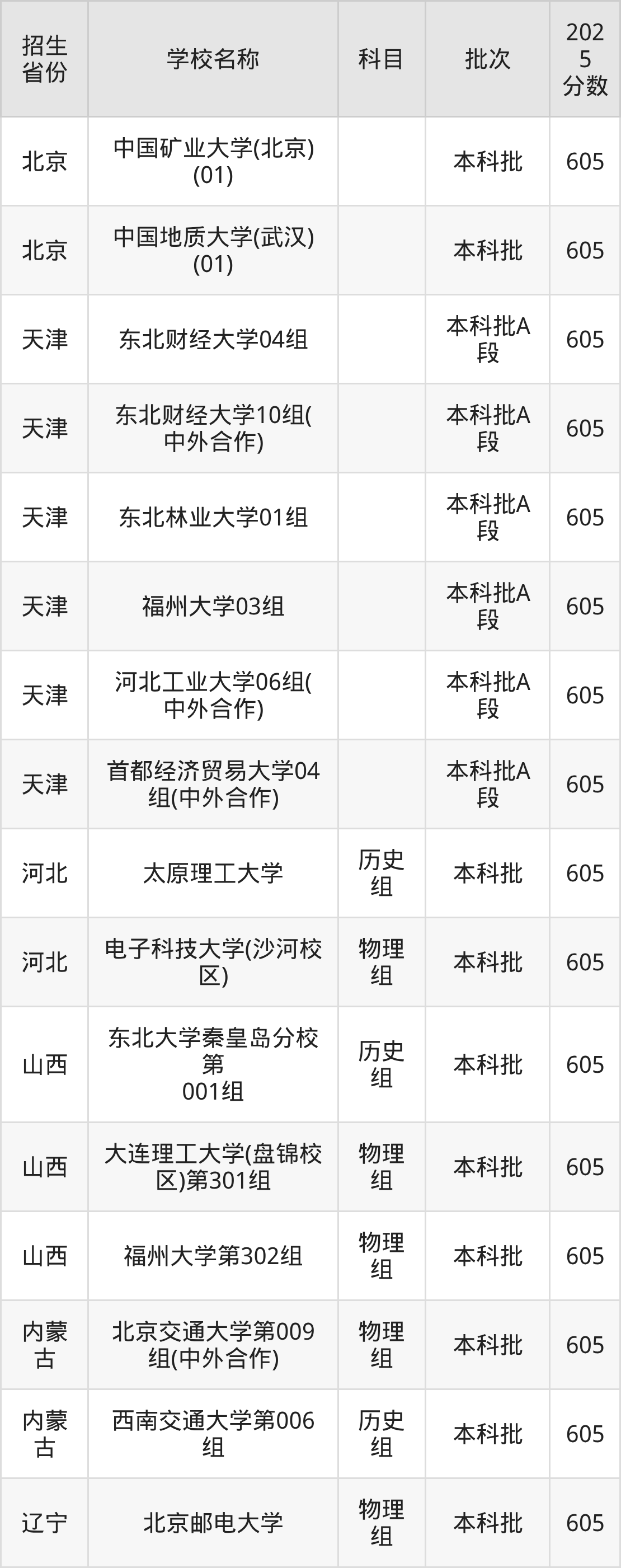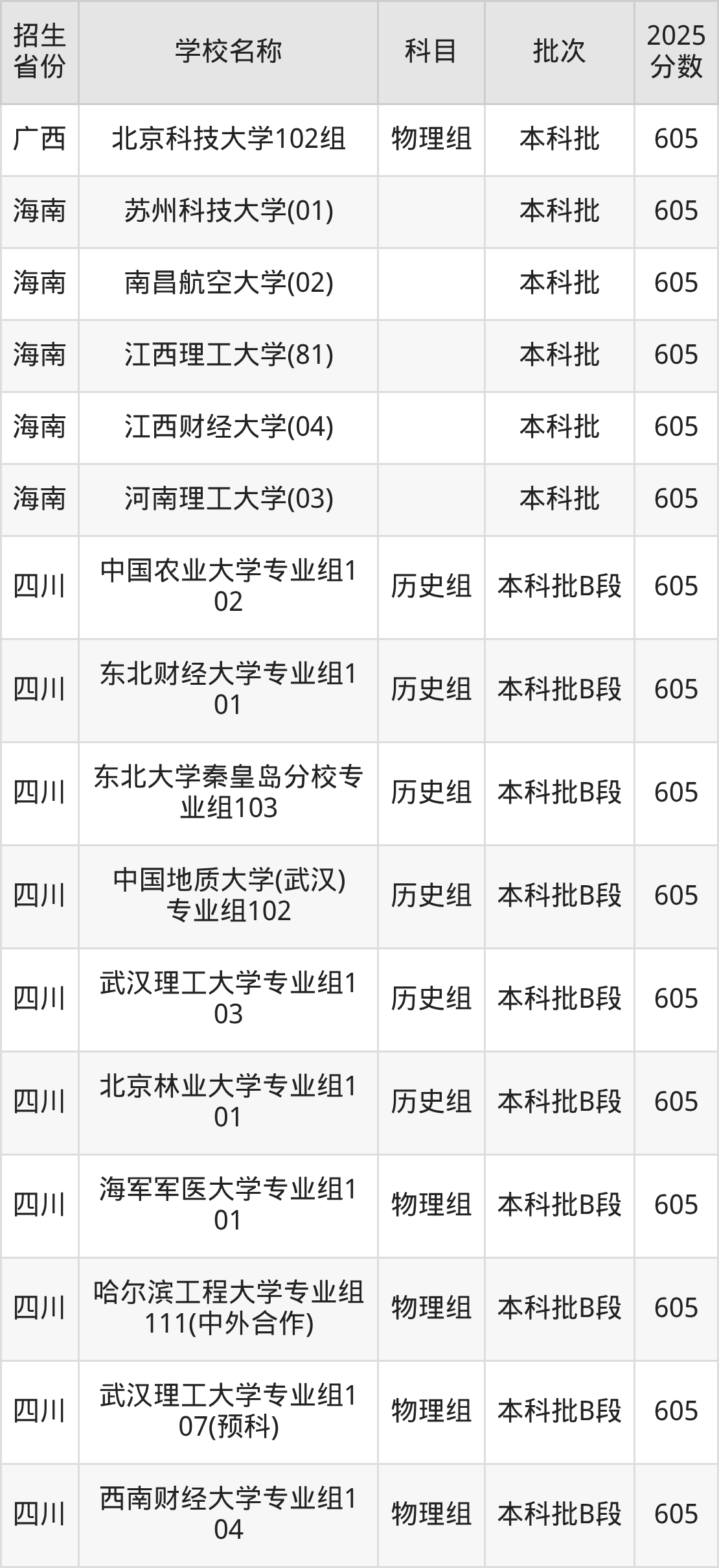筛选全国各省2025年录取分数线为605分的理科大学如下: