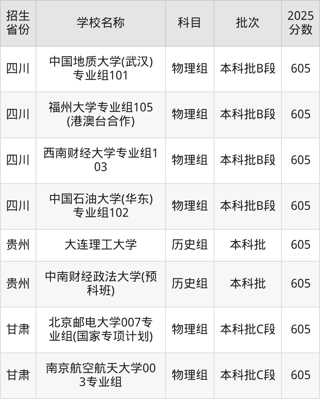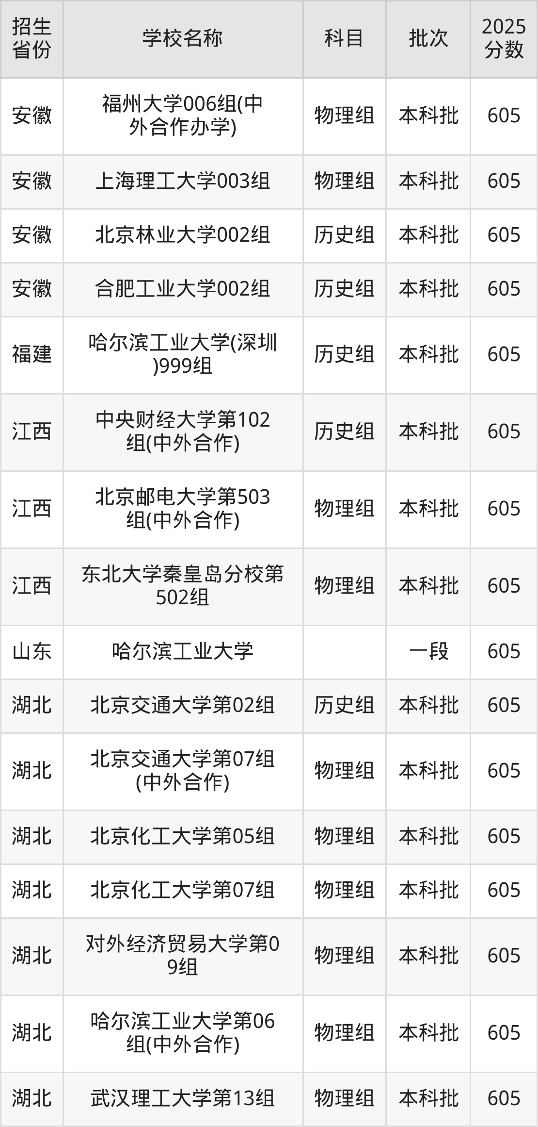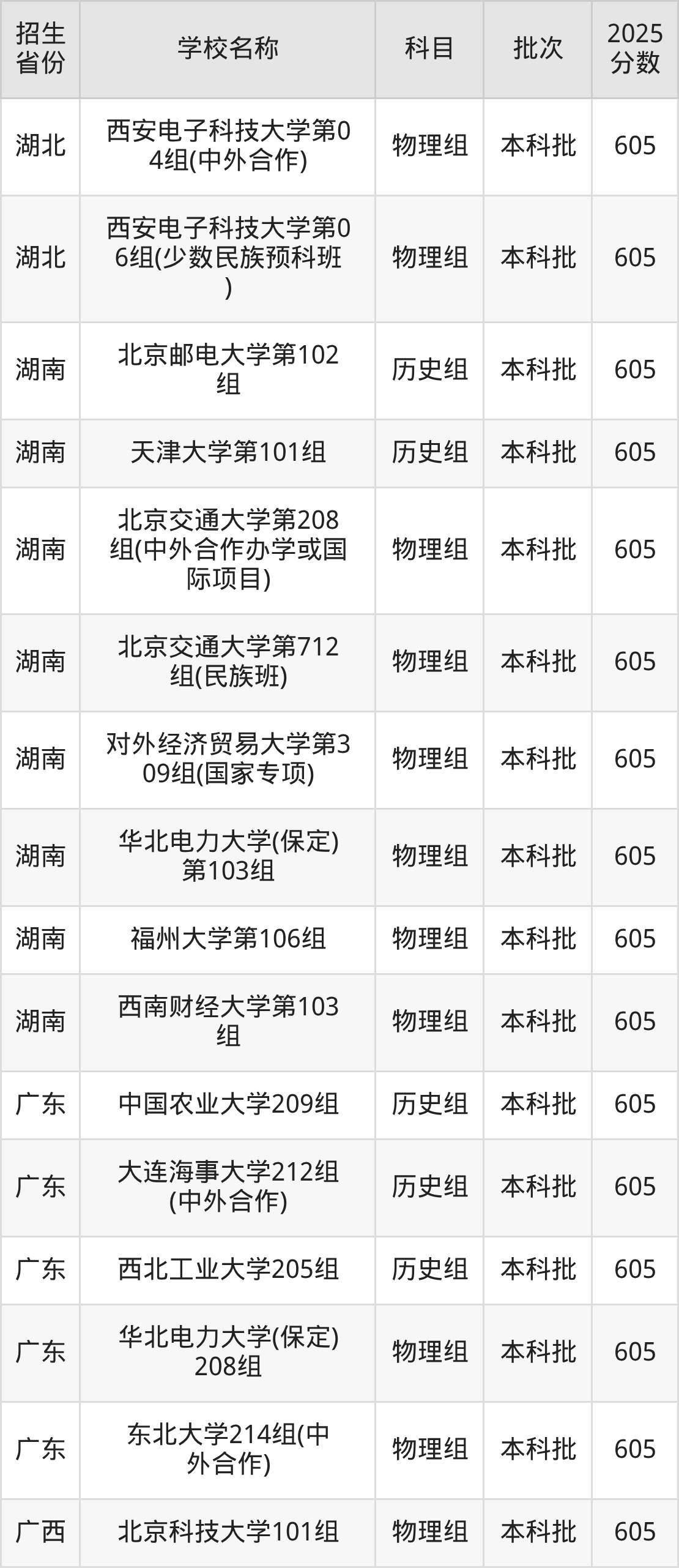 筛选全国各省2025年录取分数线为605分的理科大学如下: