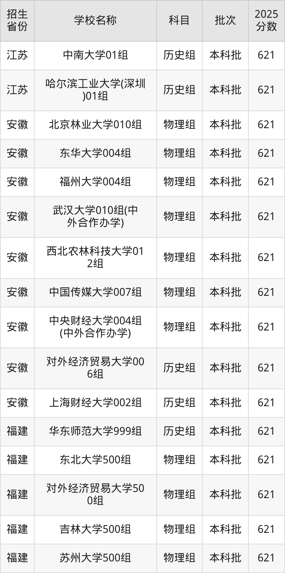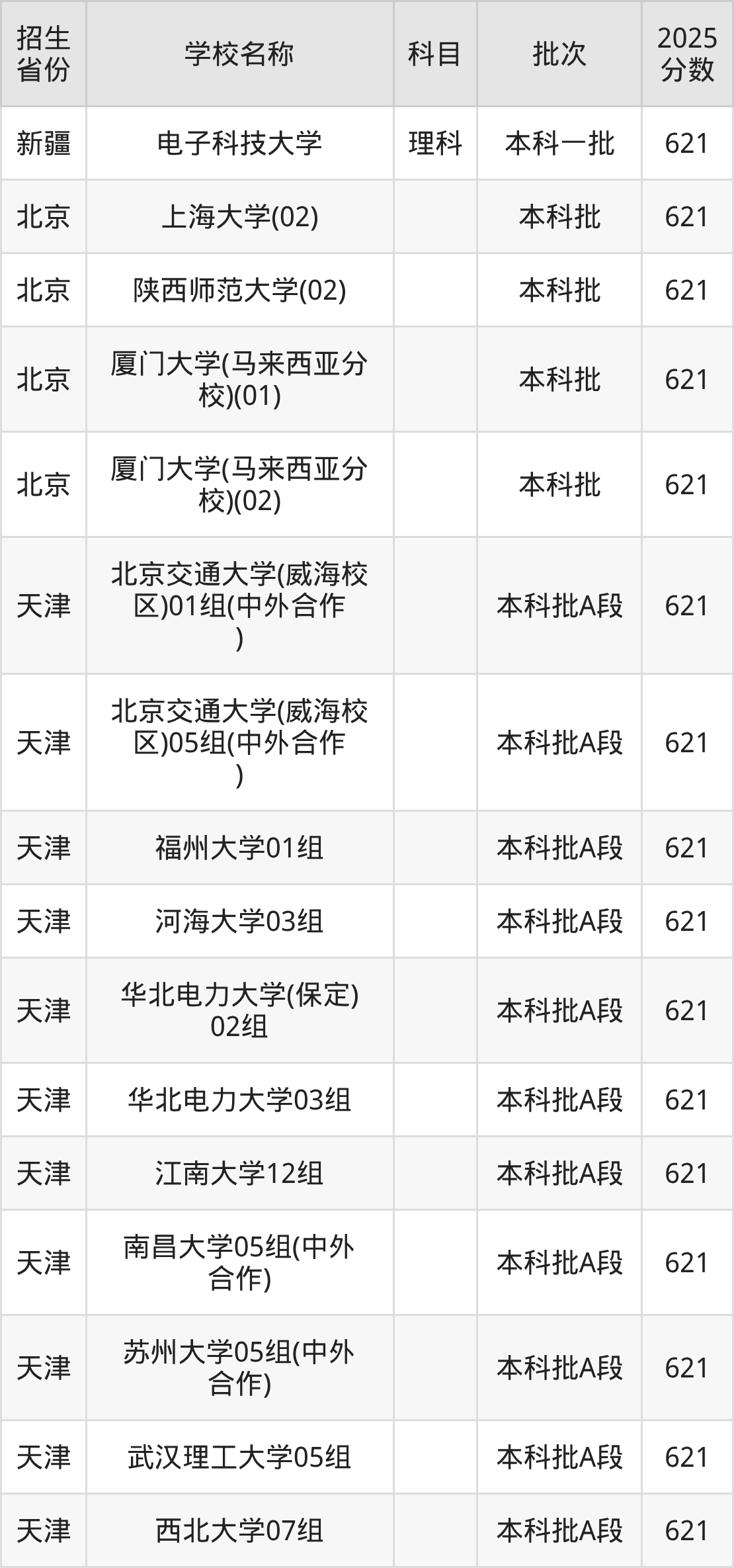 二、各省621分的211大学名单