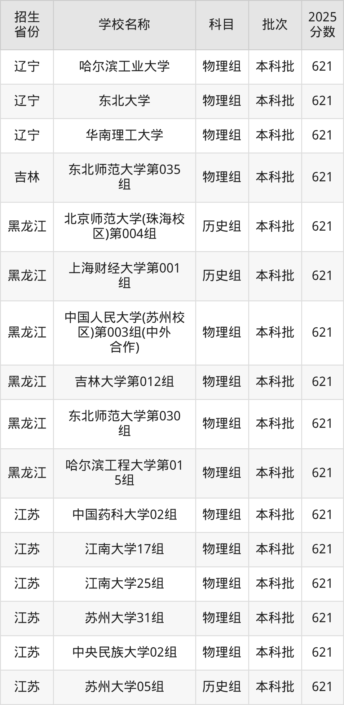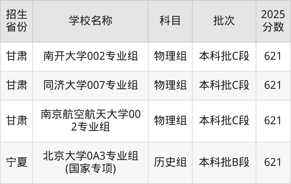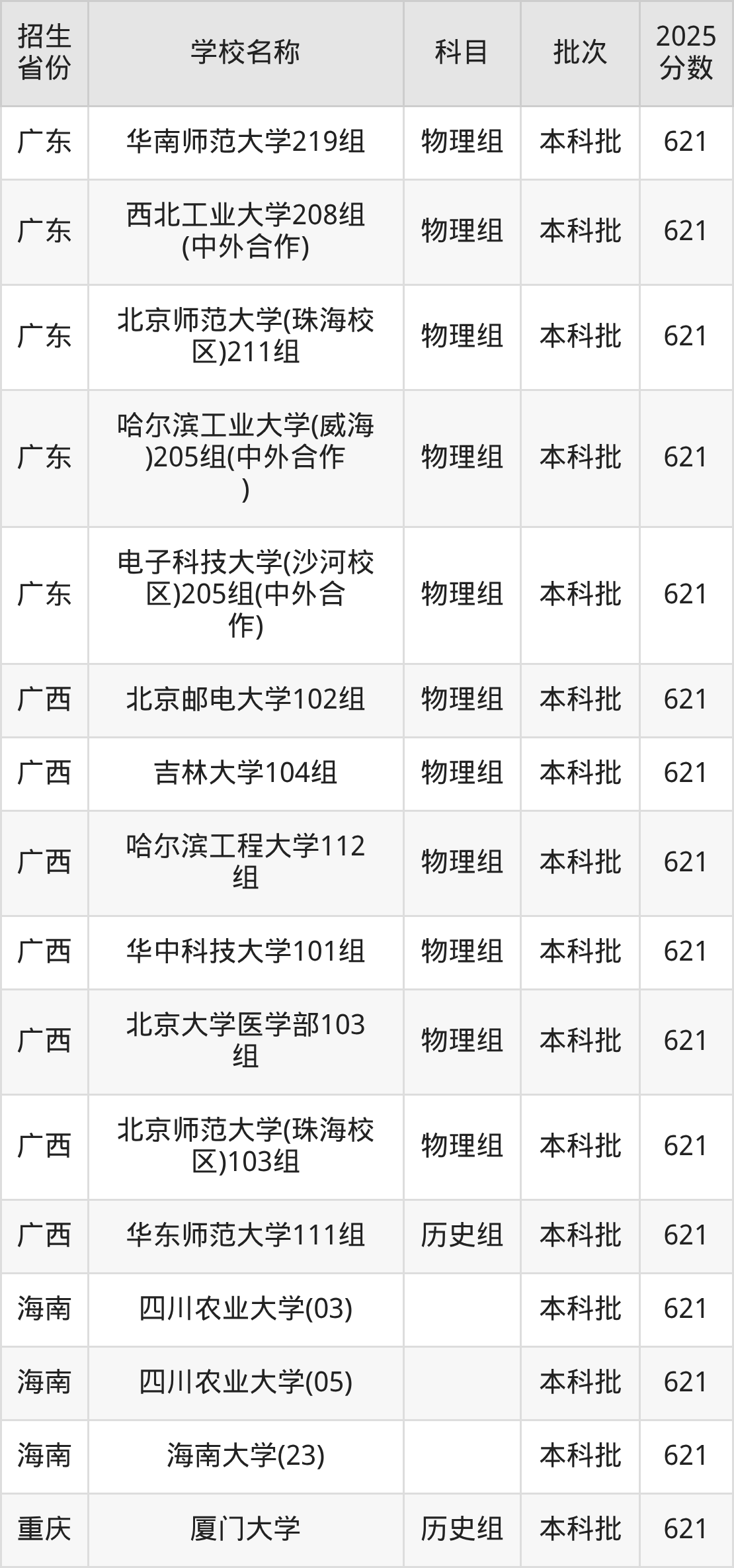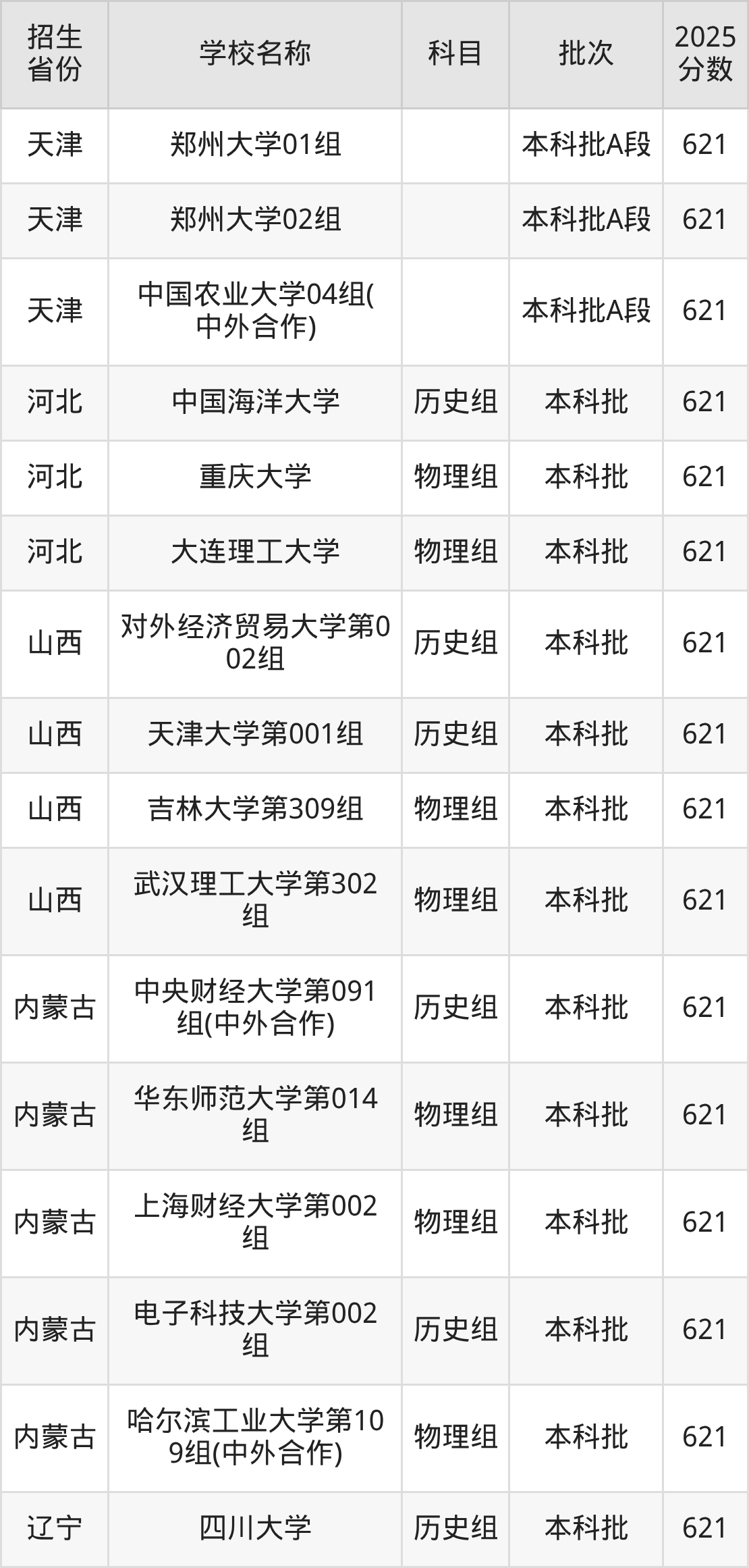 筛选全国各省2025年录取分数线为621分的211大学如下: