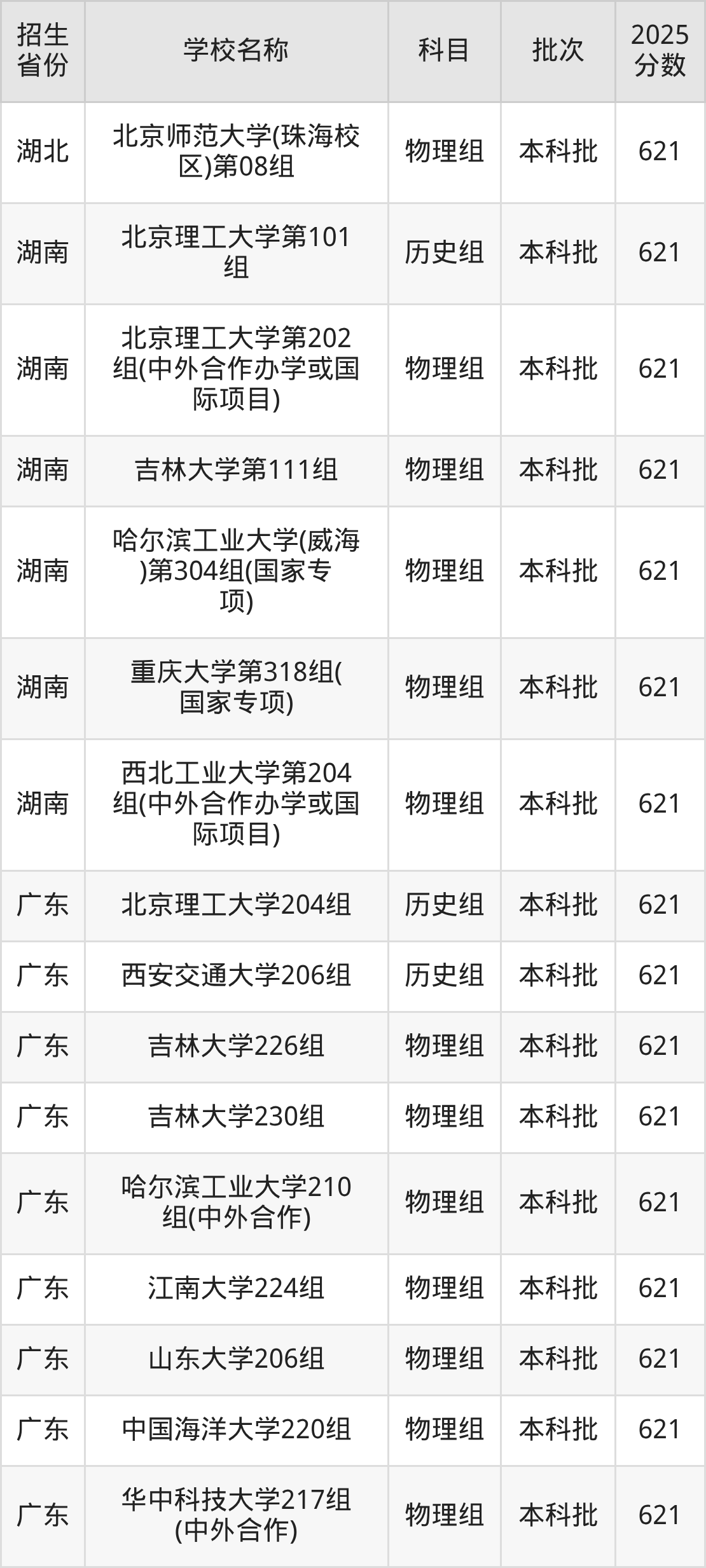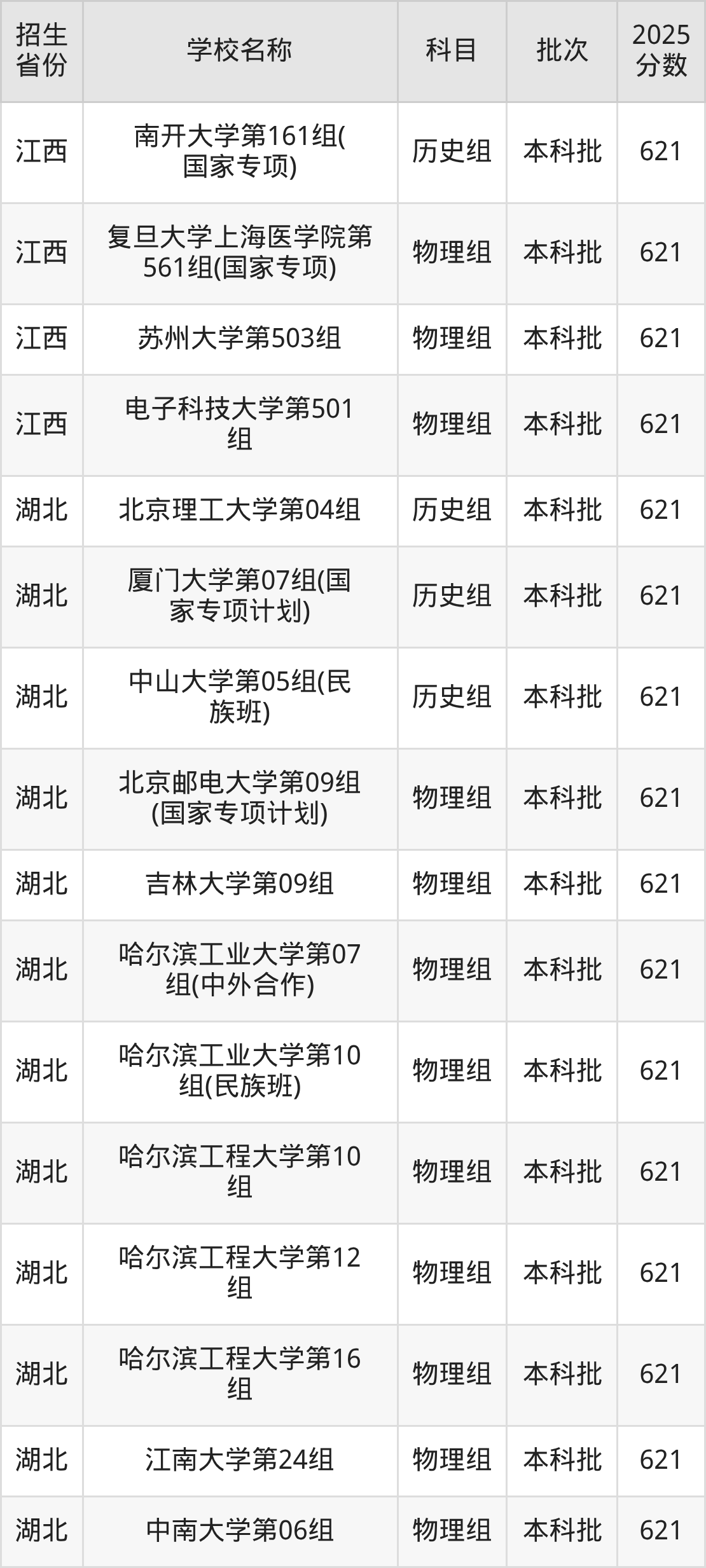 湖北省历史组分数线是621分的211大学有:北京理工大学、厦门大学、中山大学。