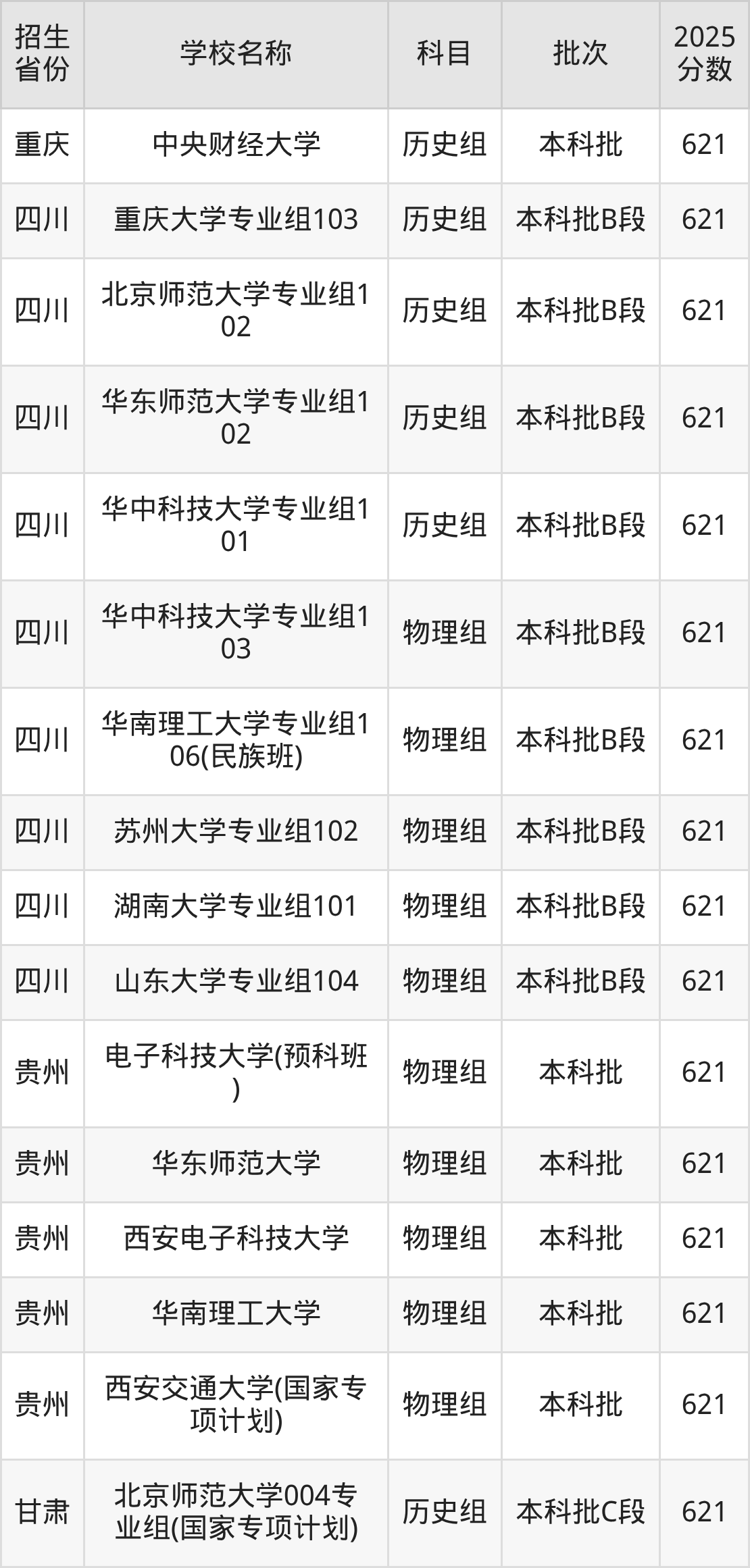 四川省历史组分数线是621分的211大学有:重庆大学、北京师范大学、华东师范大学、华中科技大学。