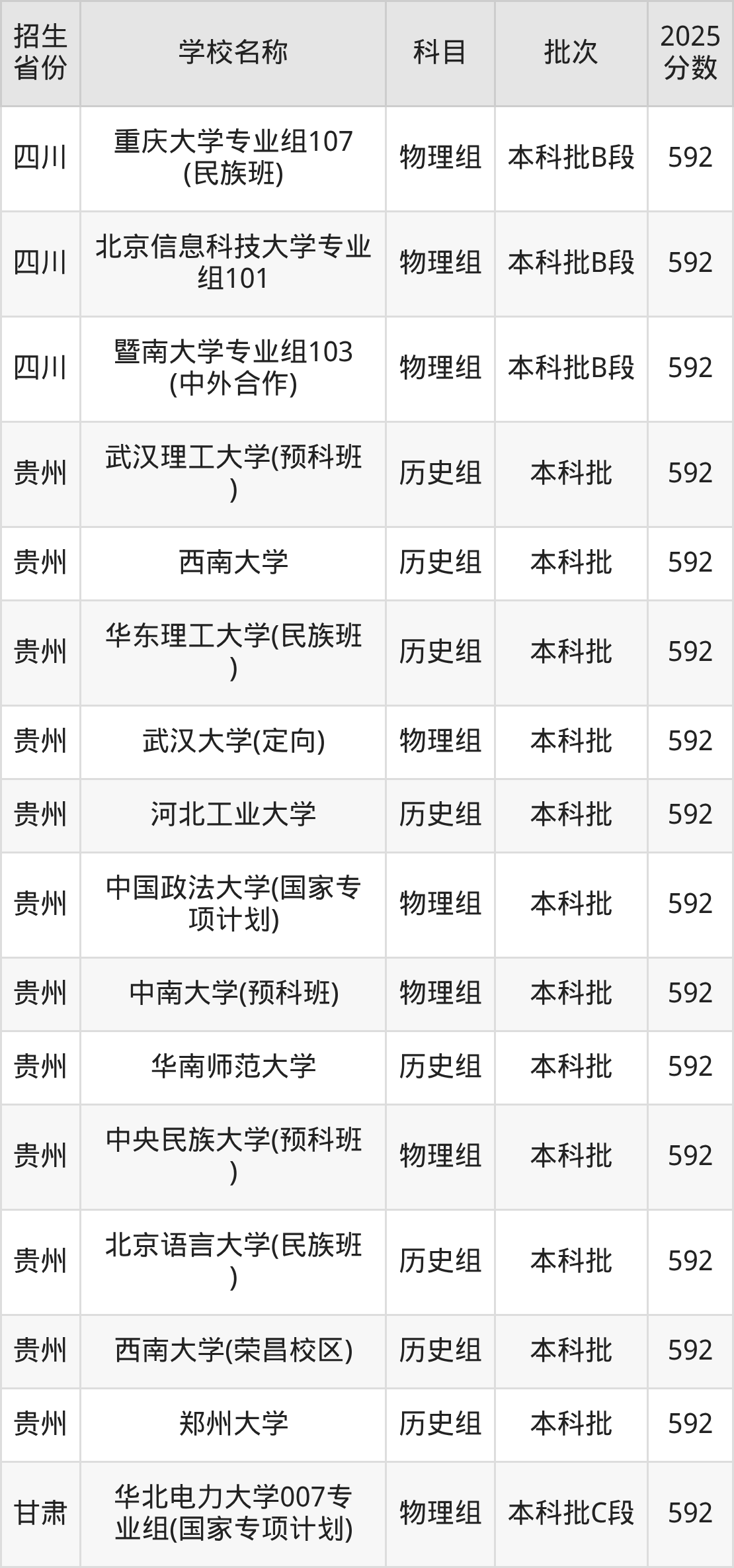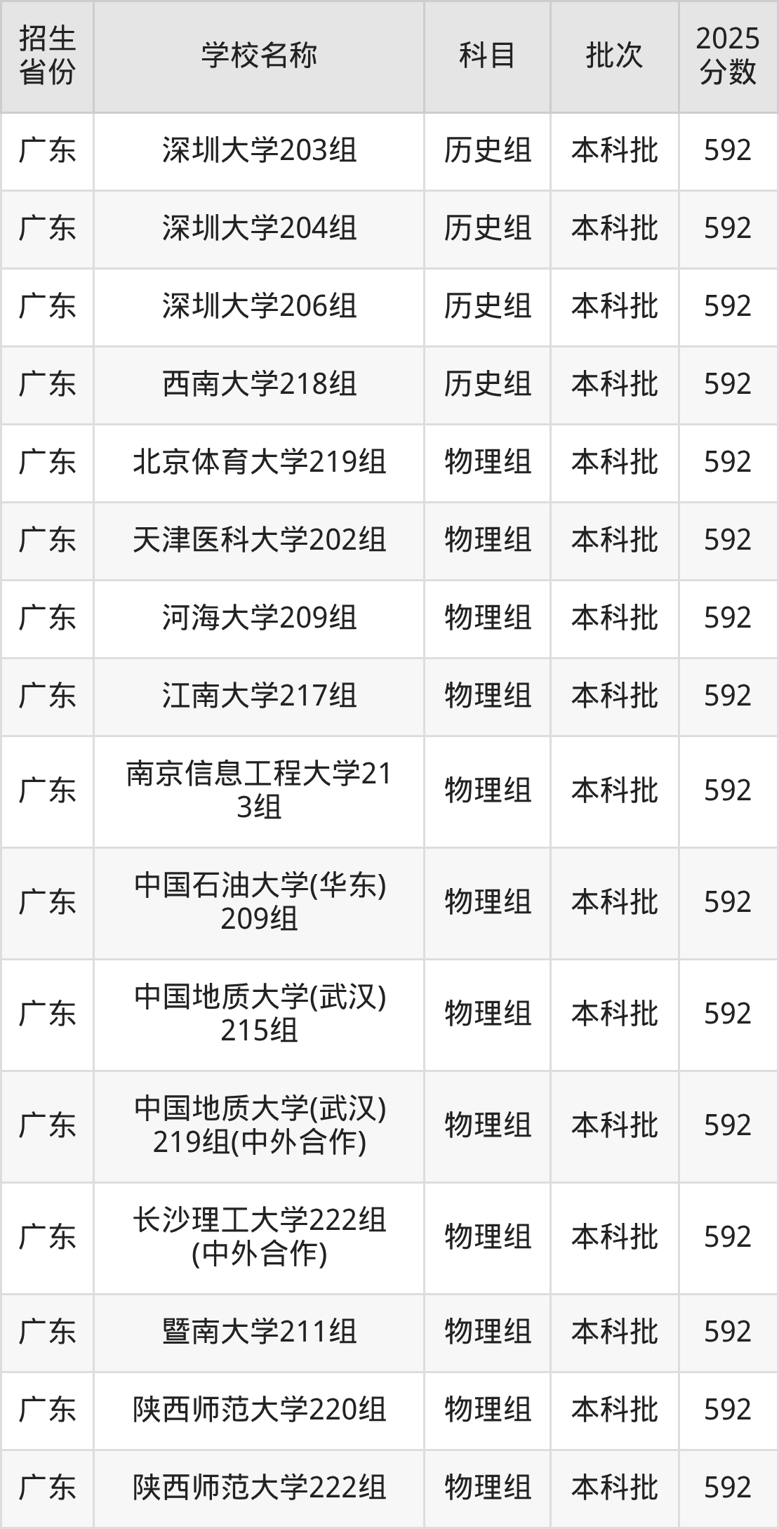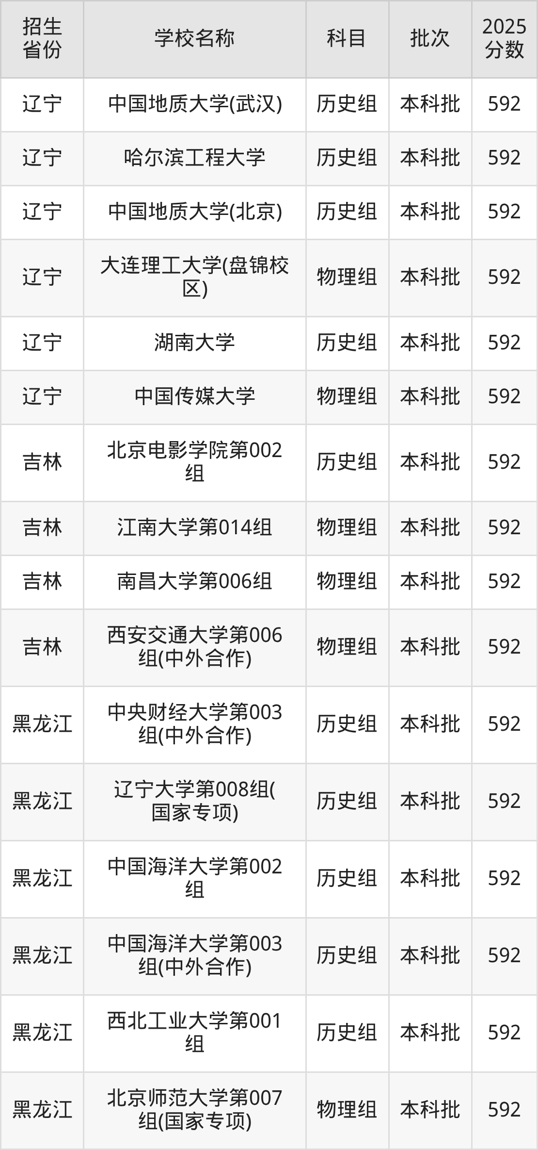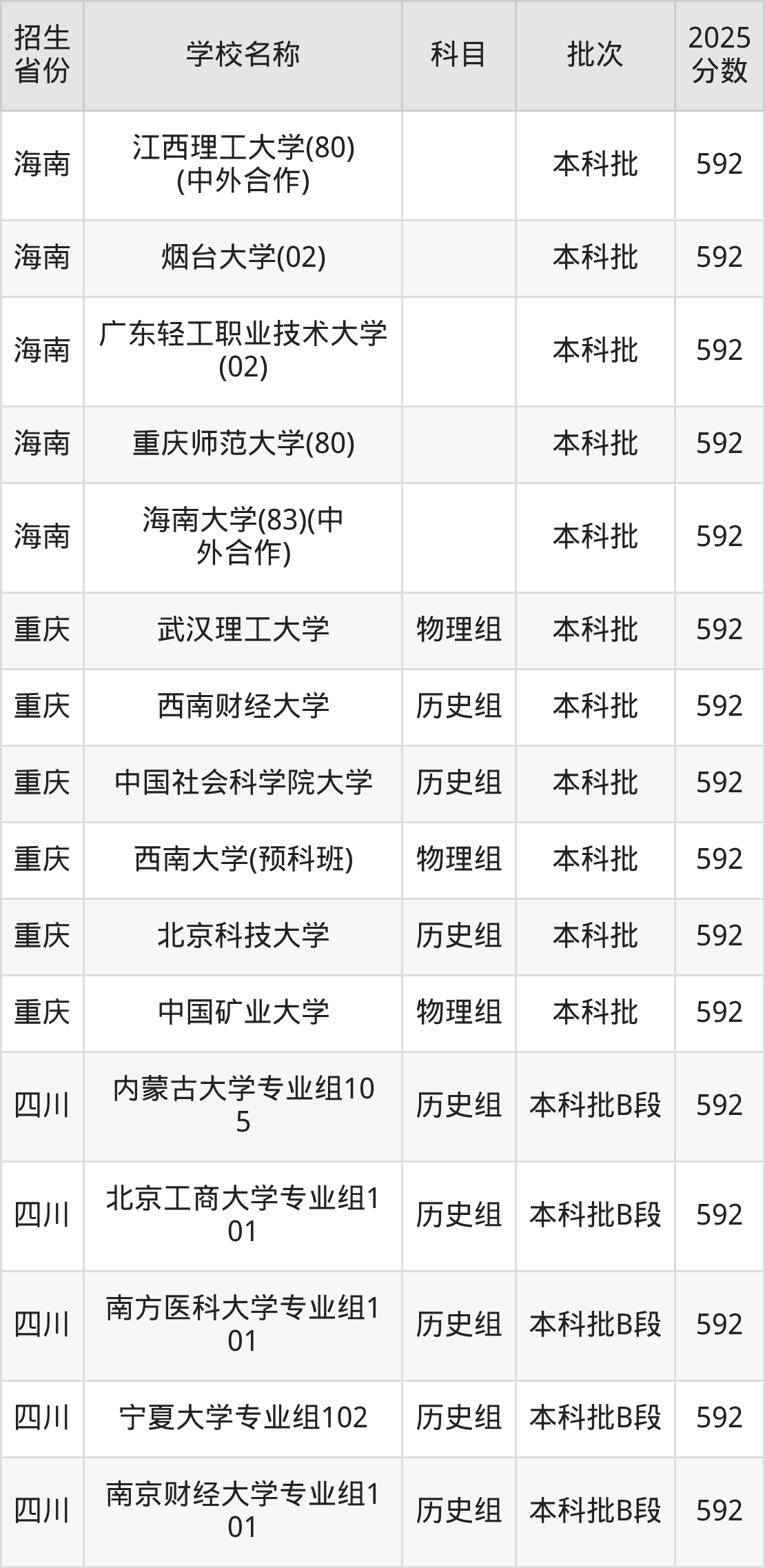 筛选全国各省2025年录取分数线为592分的重点大学如下: