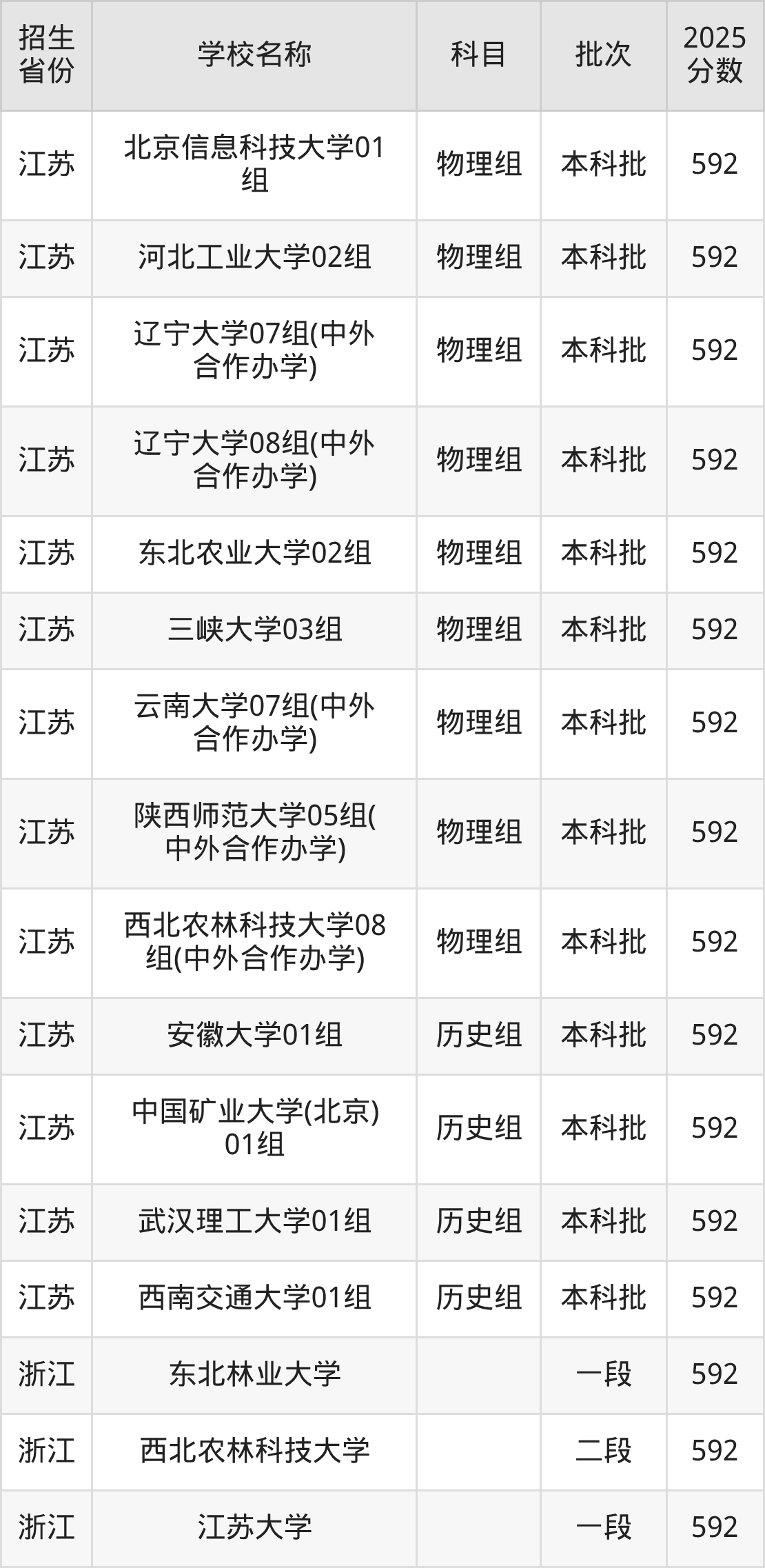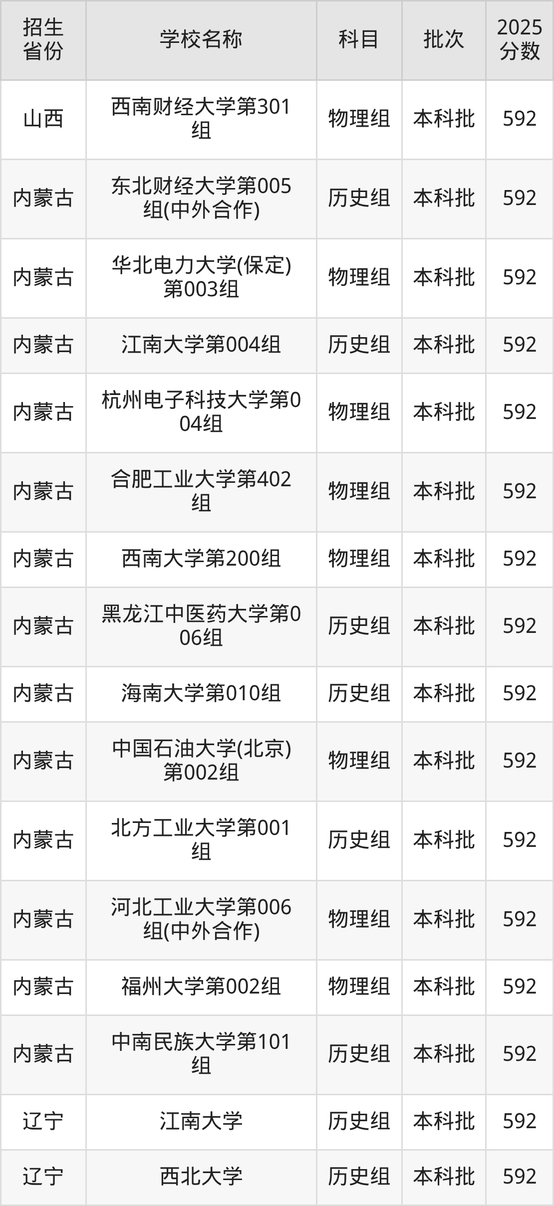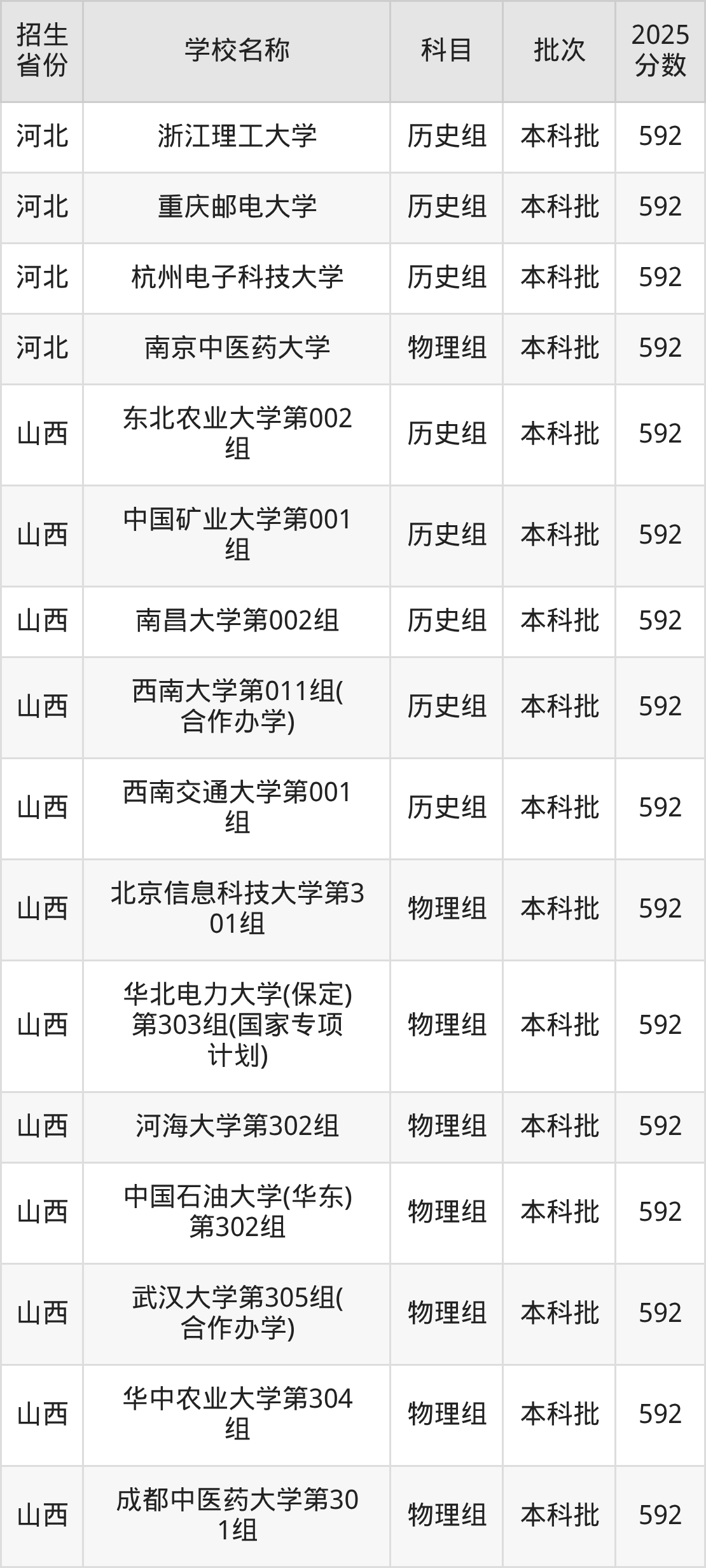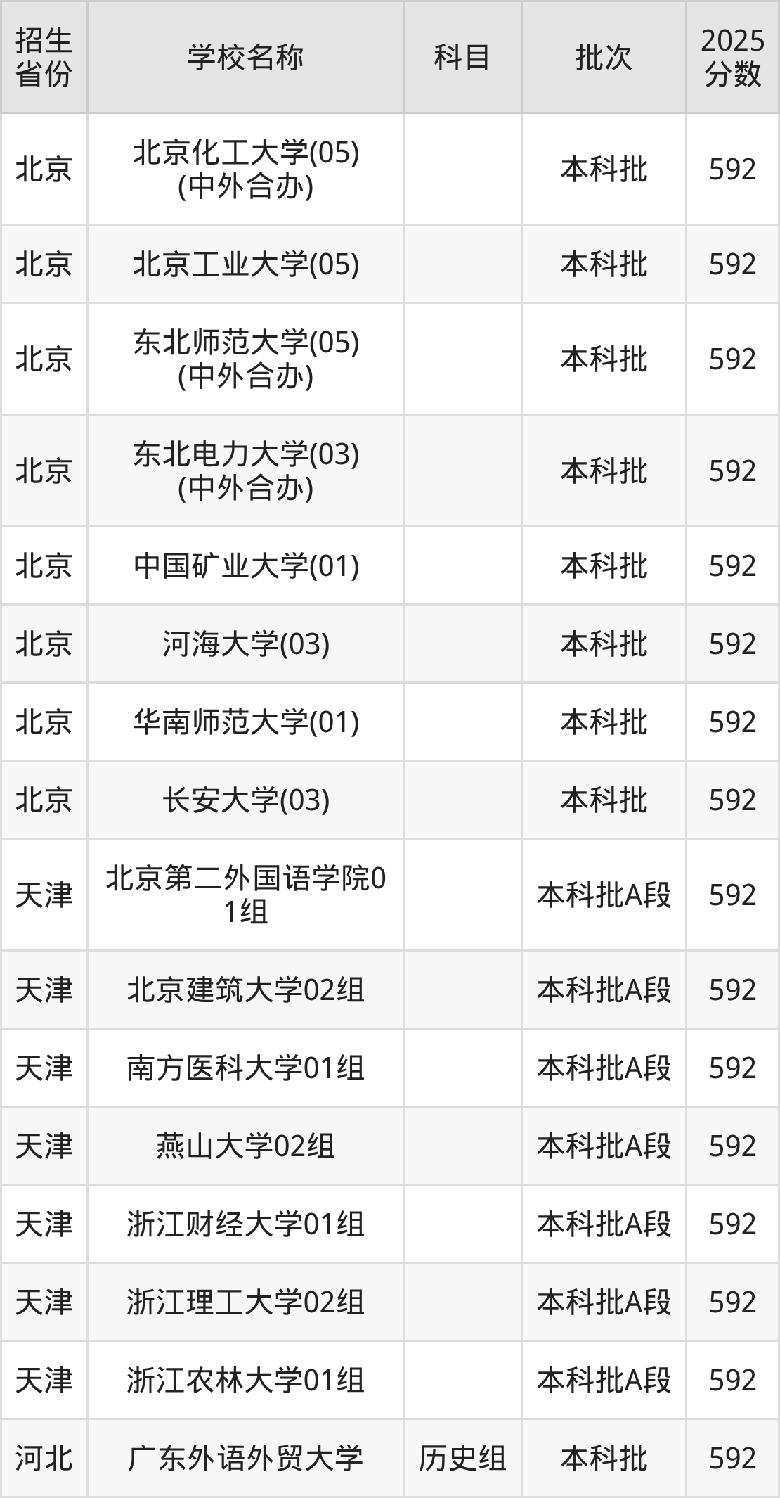 筛选全国各省2025年录取分数线为592分的重点大学如下: