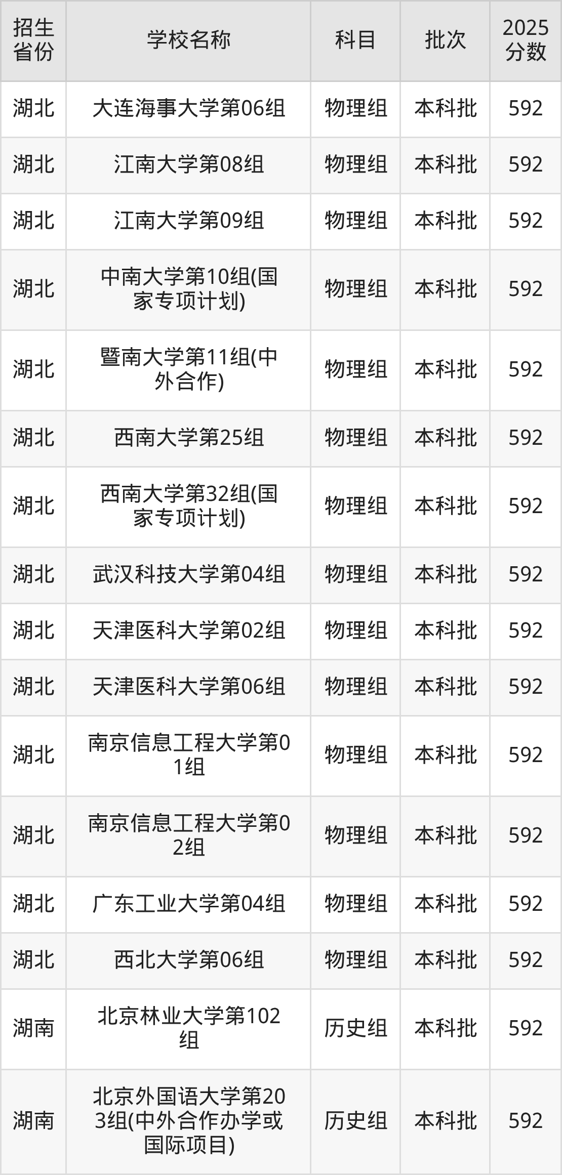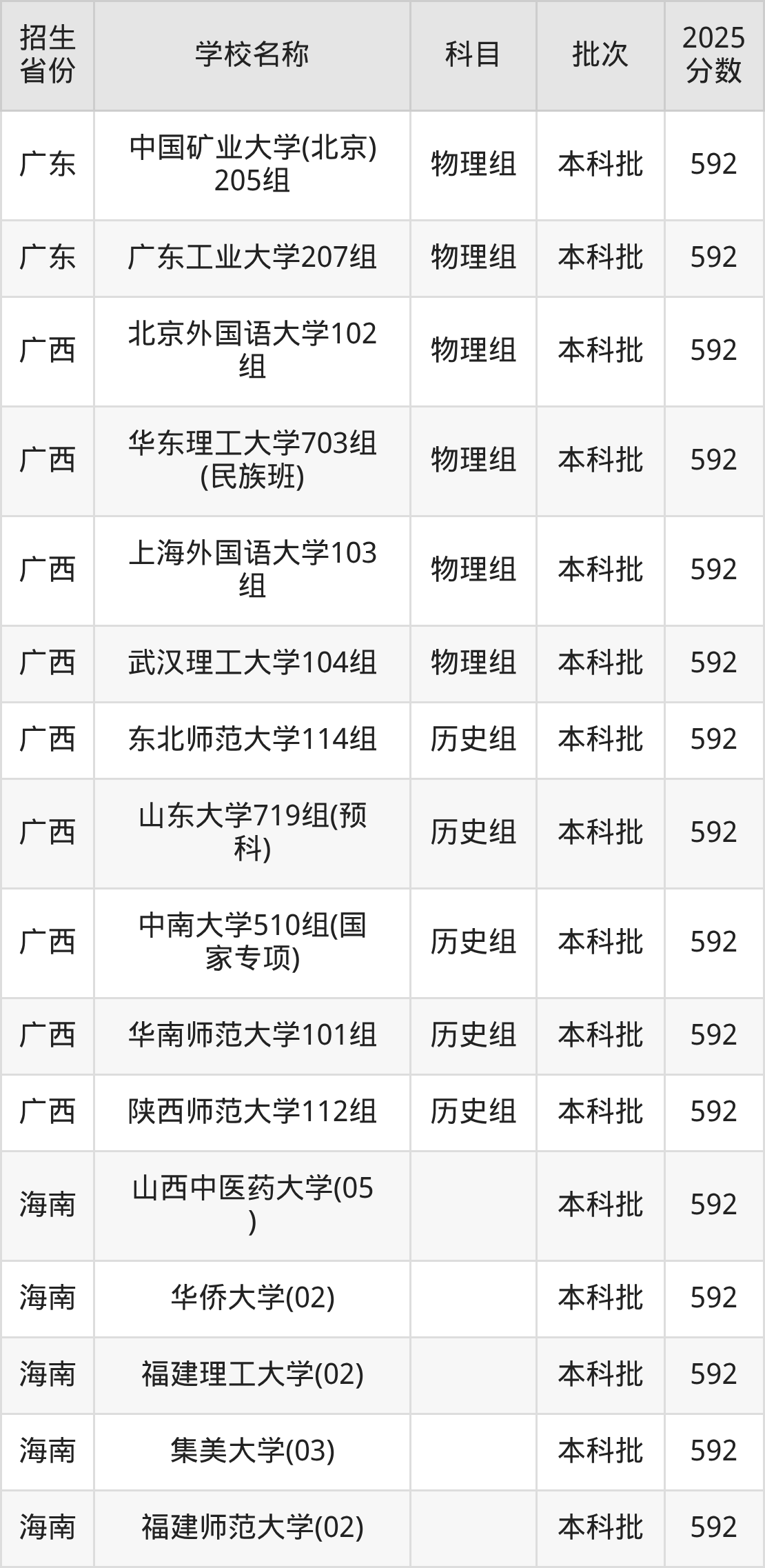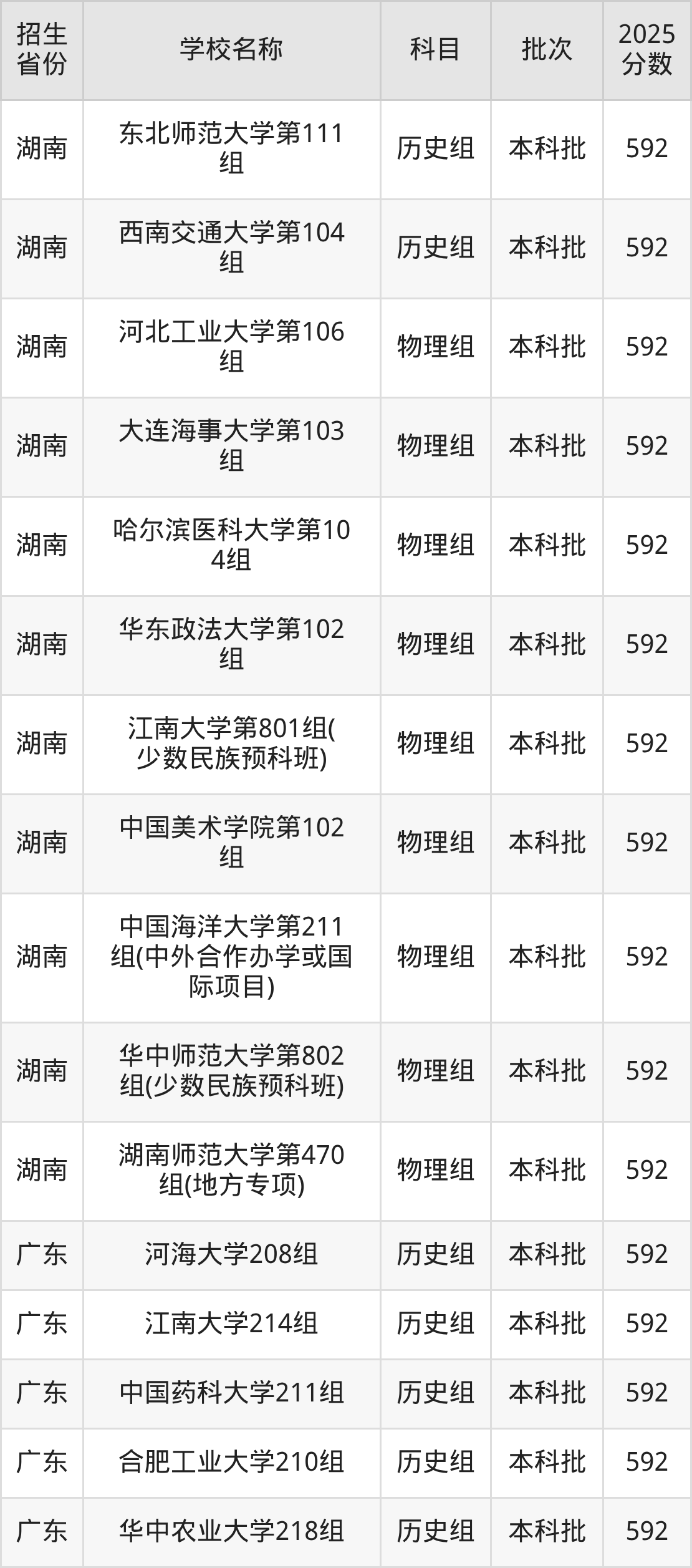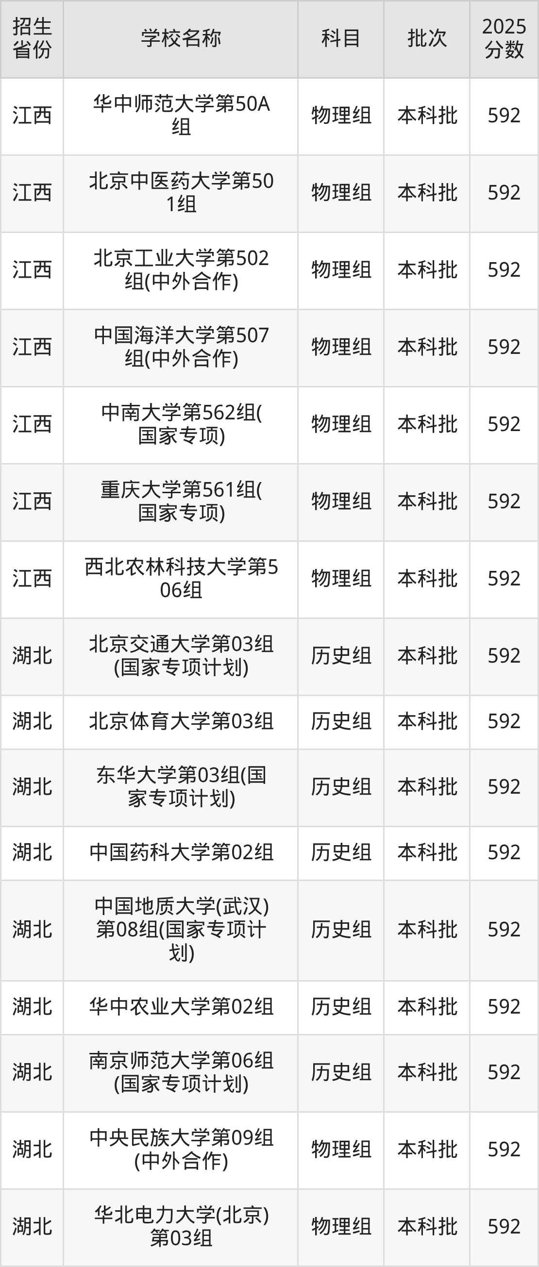 筛选全国各省2025年录取分数线为592分的重点大学如下: