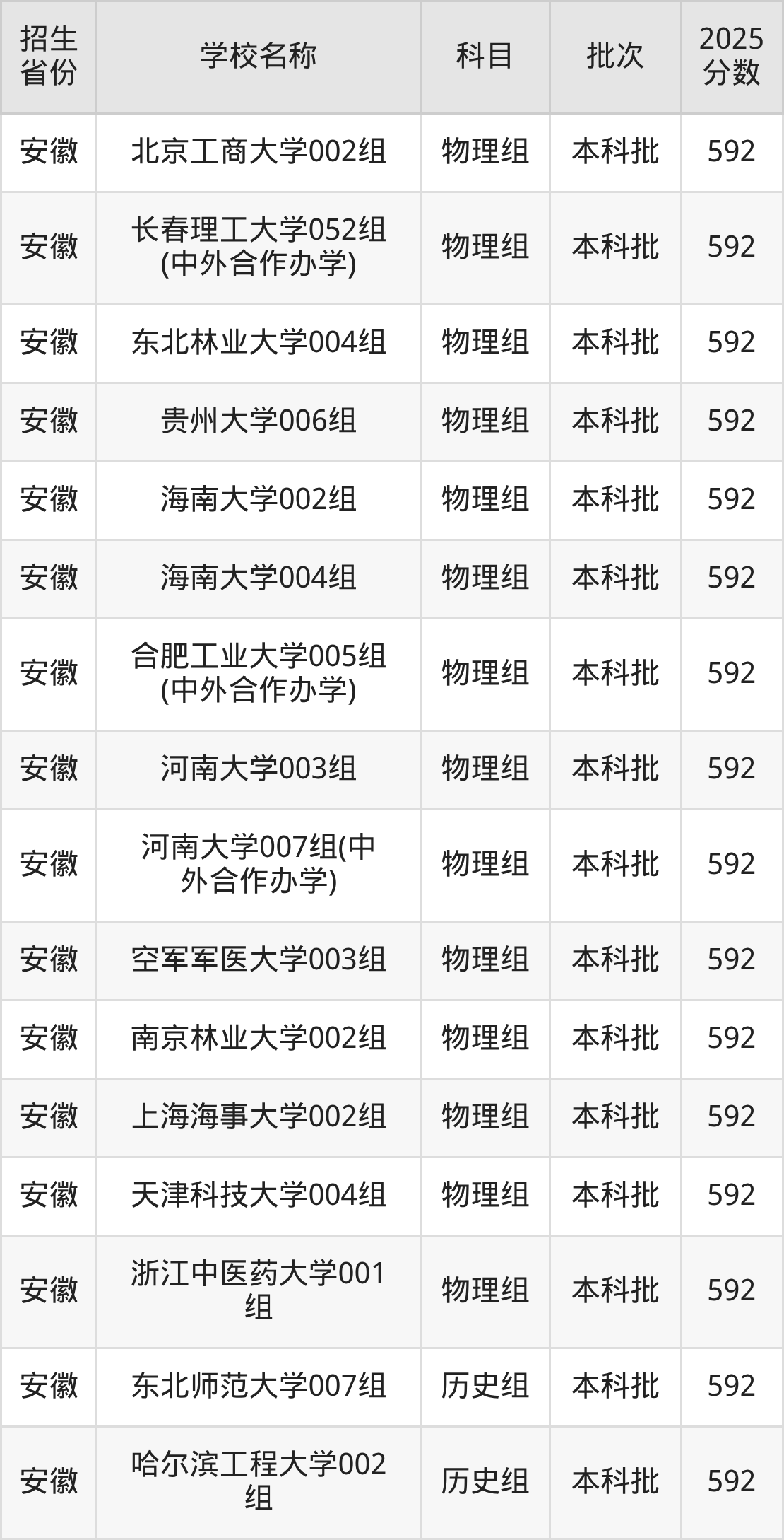 安徽省历史组分数线是592分的重点大学有:东北师范大学、哈尔滨工程大学、太原理工大学。