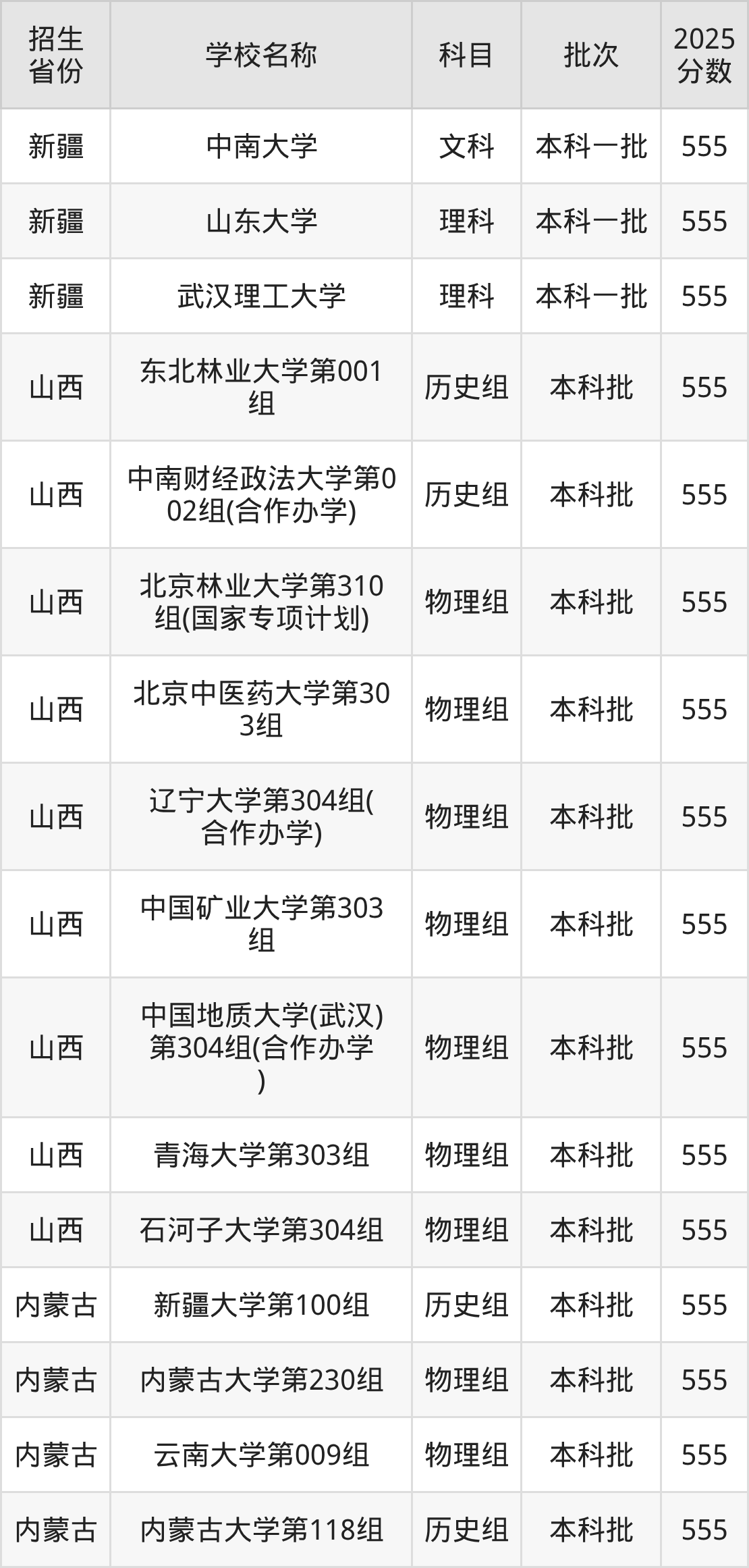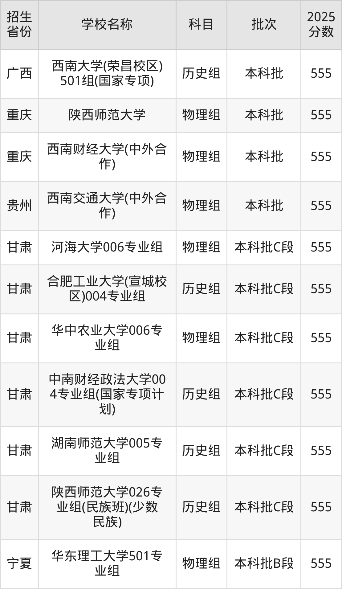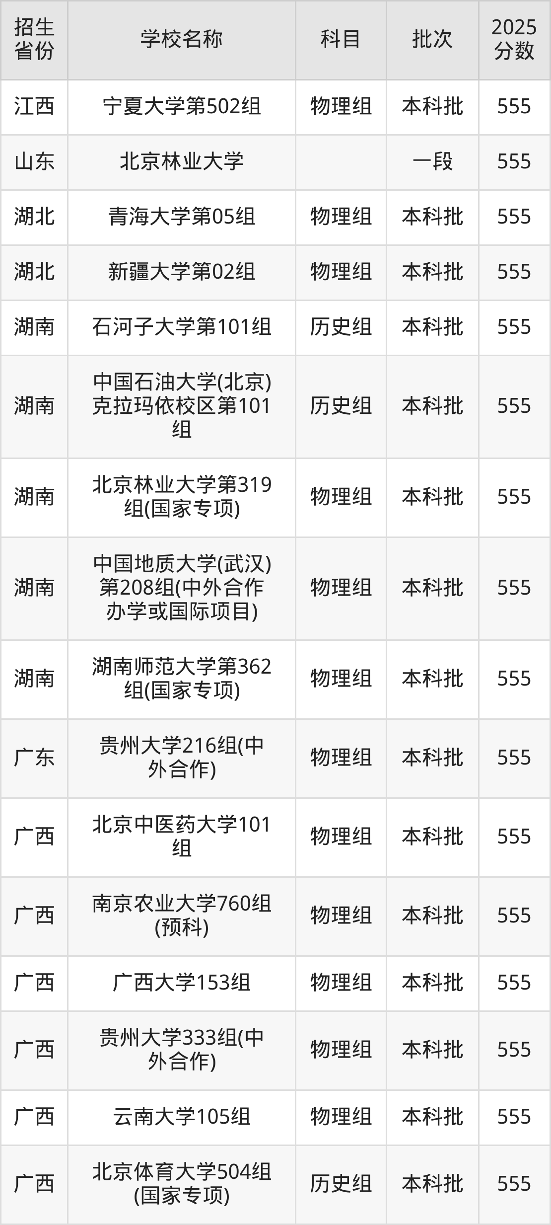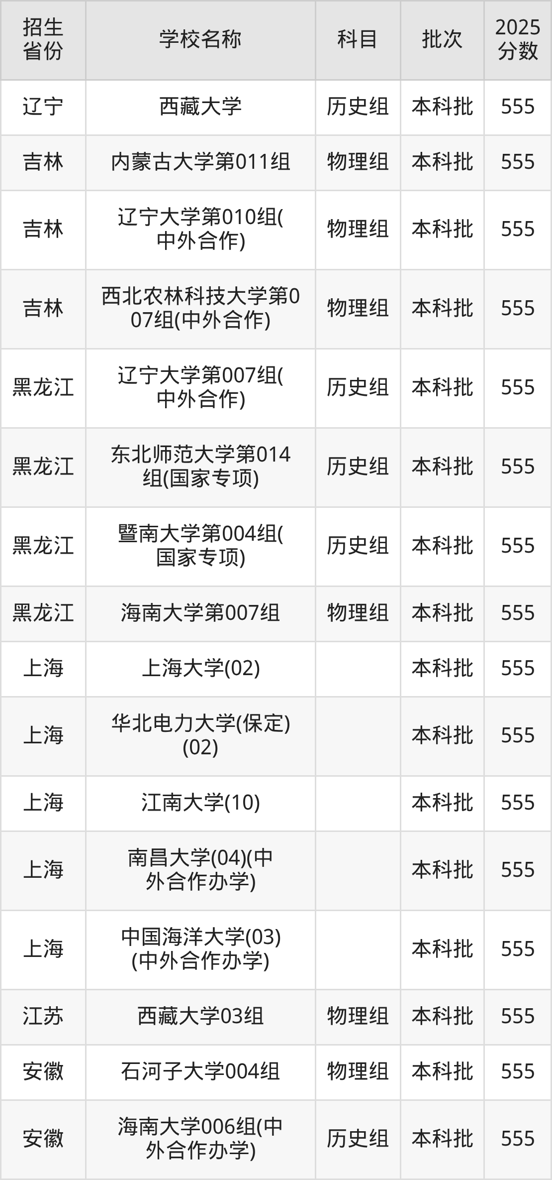 筛选全国各省2025年录取分数线为555分的211大学如下: