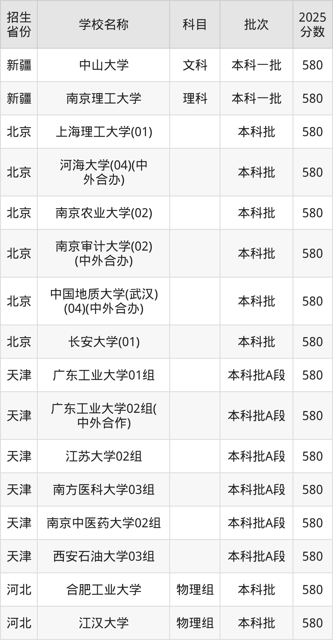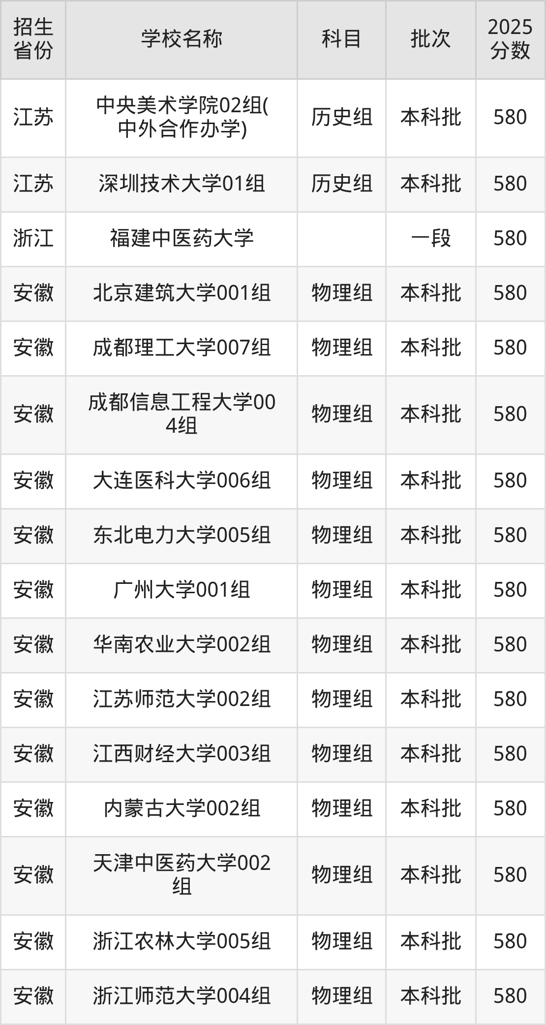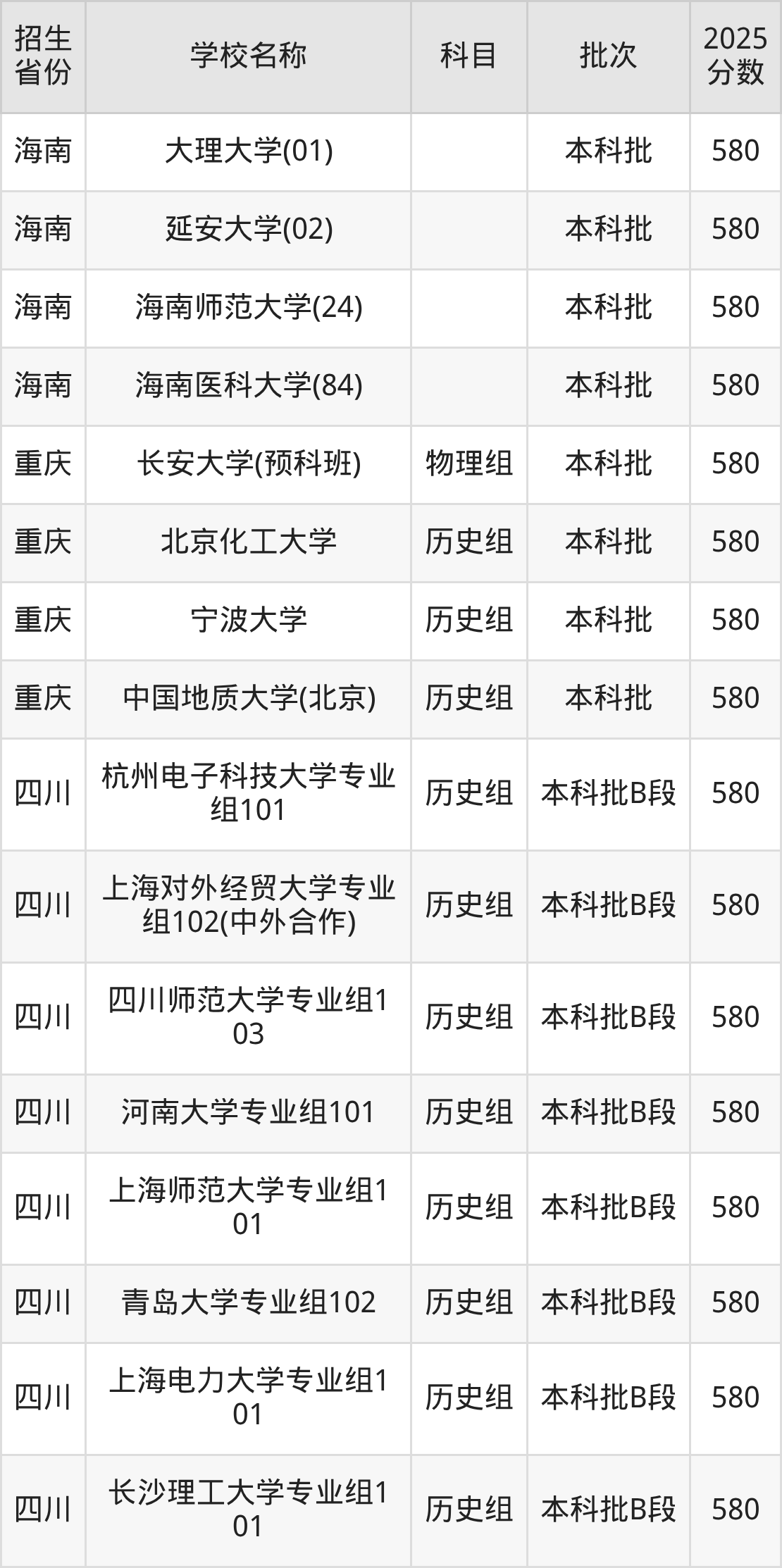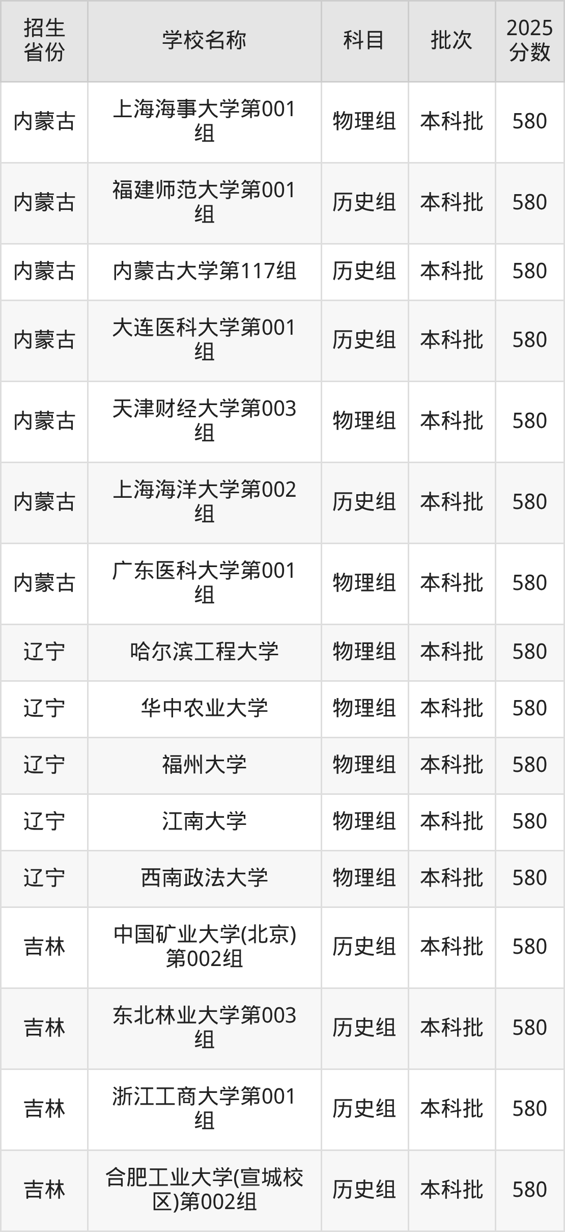 筛选全国各省2025年录取分数线为580分的一本大学如下: