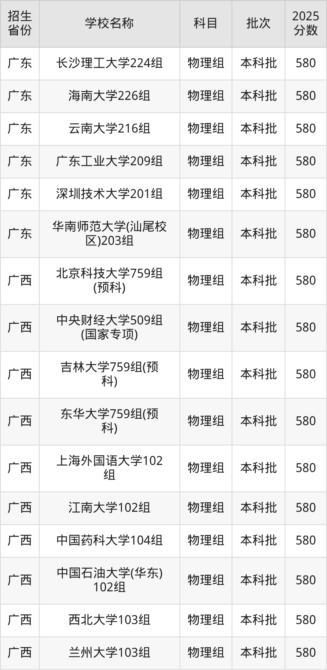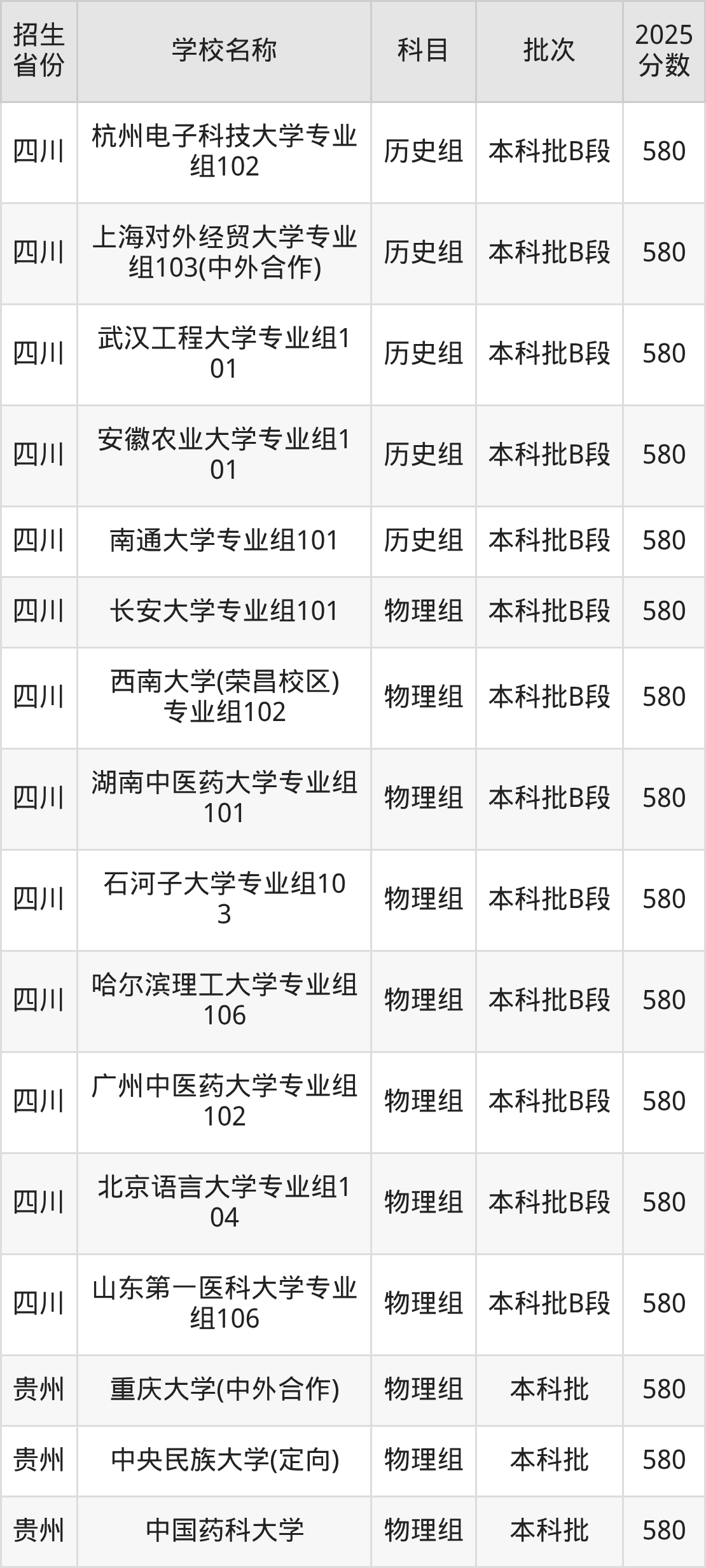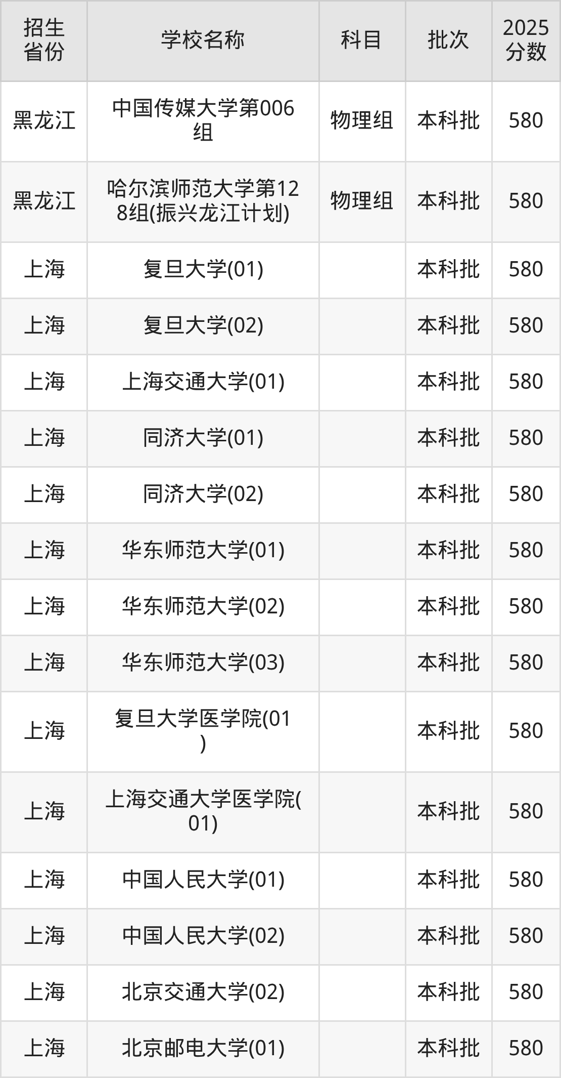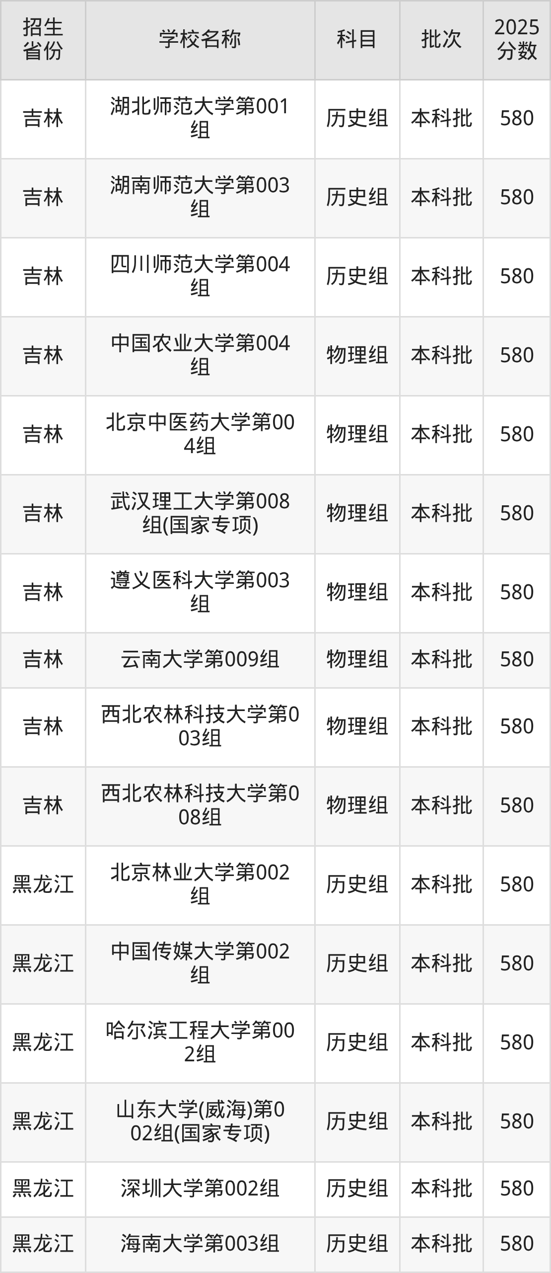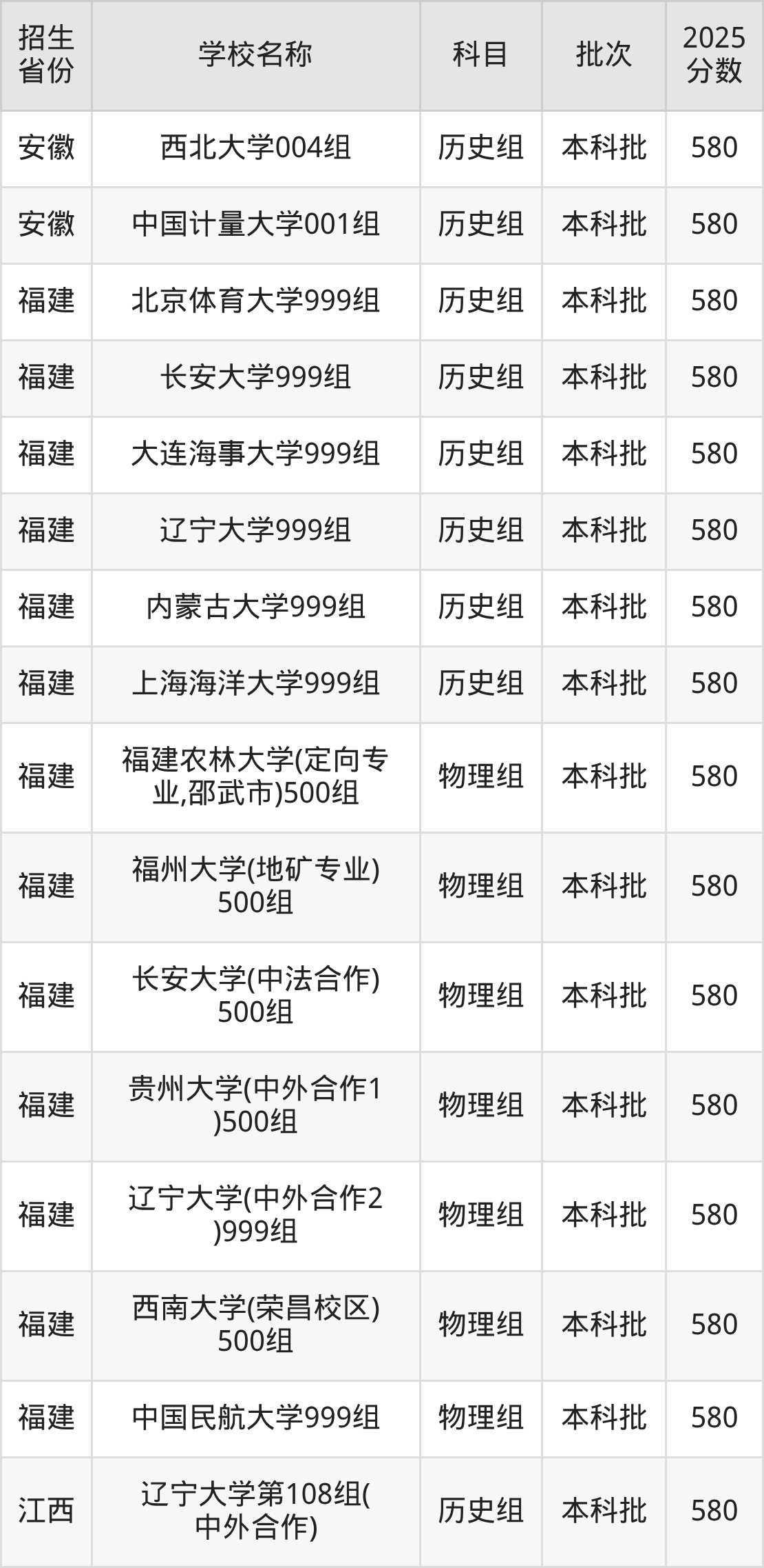 筛选全国各省2025年录取分数线为580分的一本大学如下: