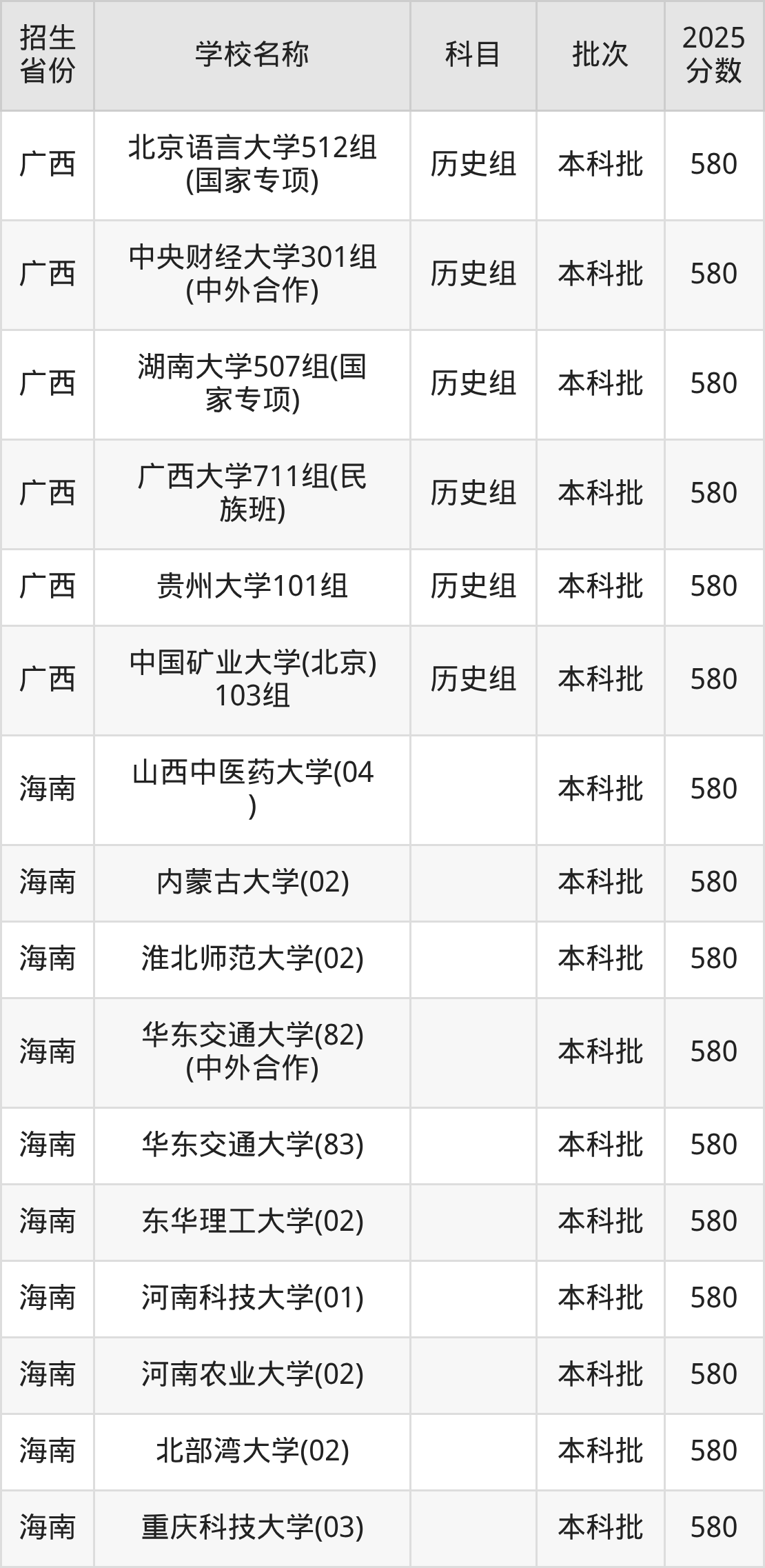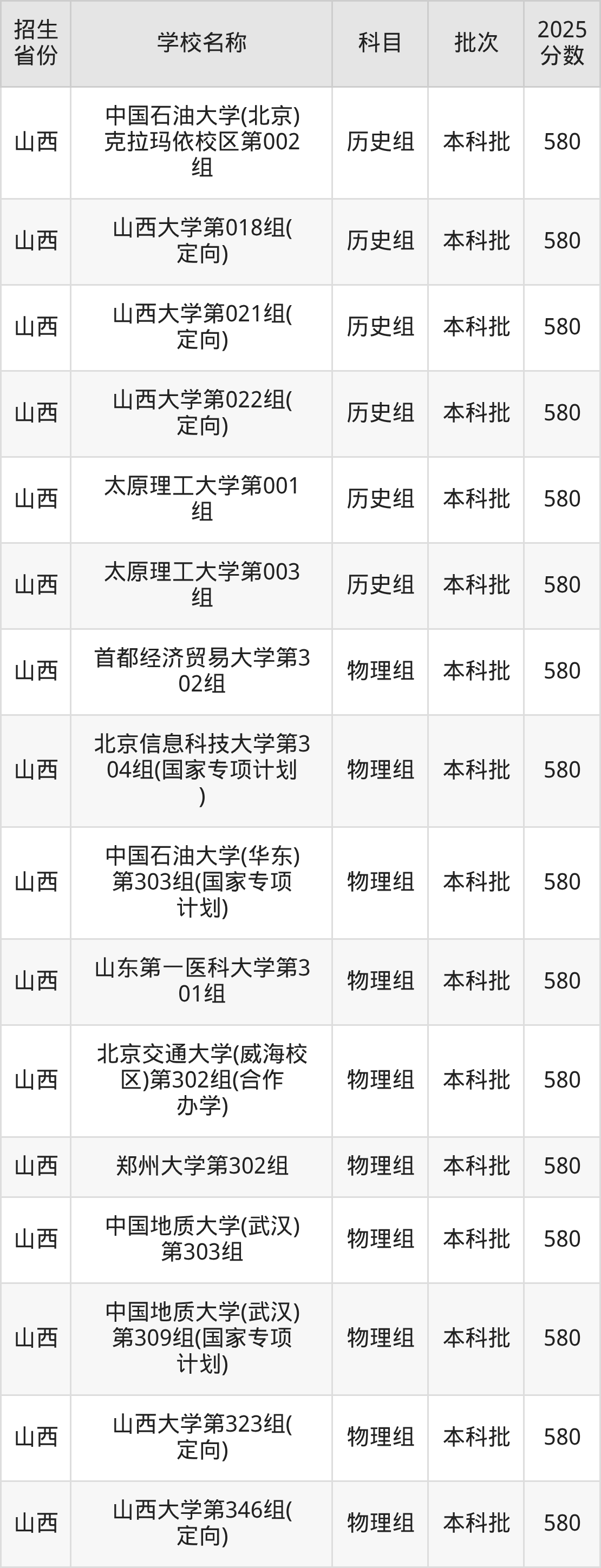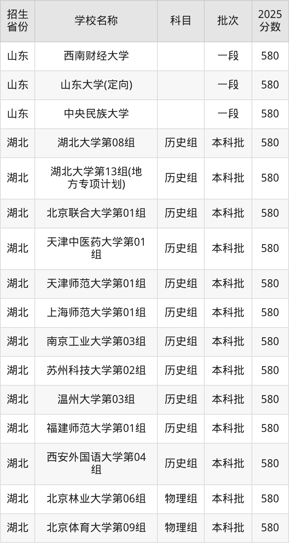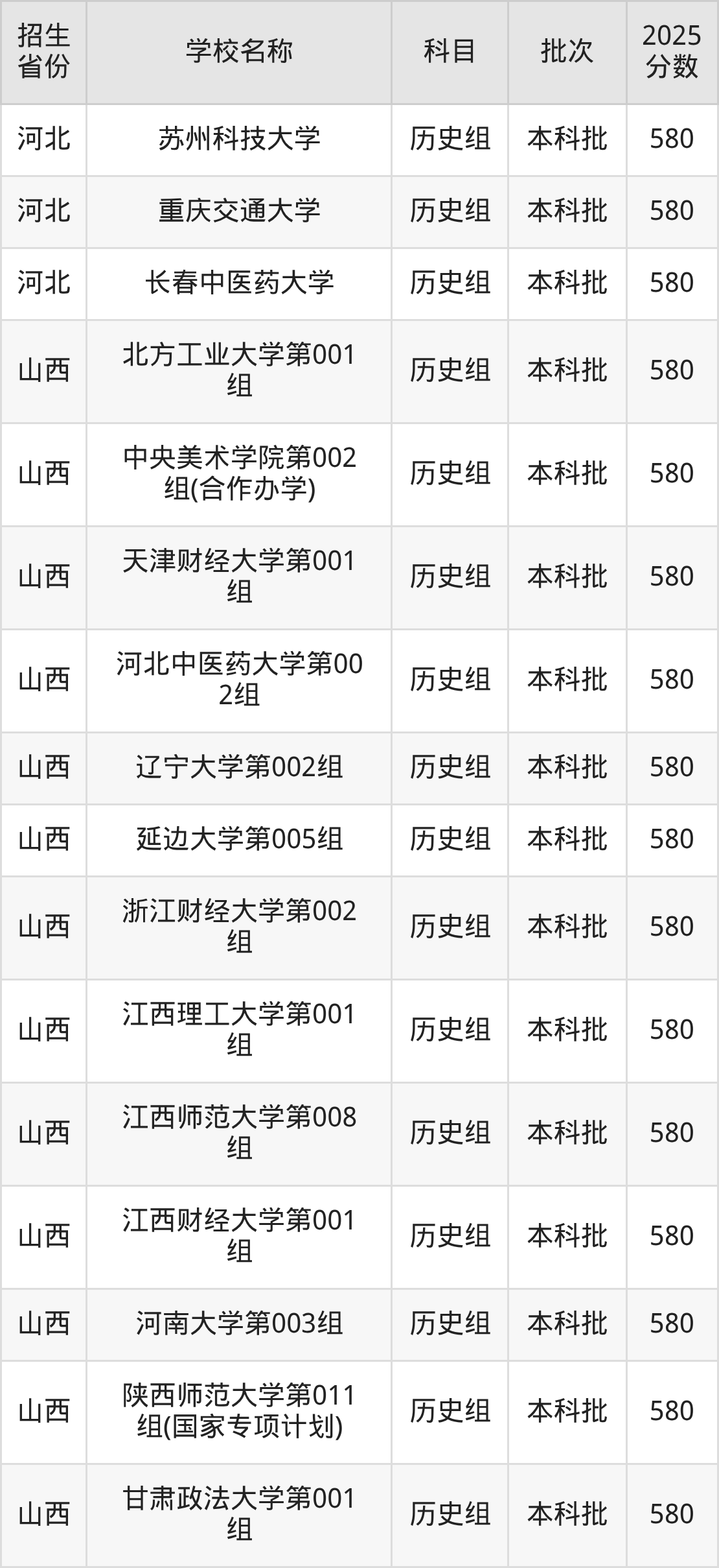 筛选全国各省2025年录取分数线为580分的一本大学如下: