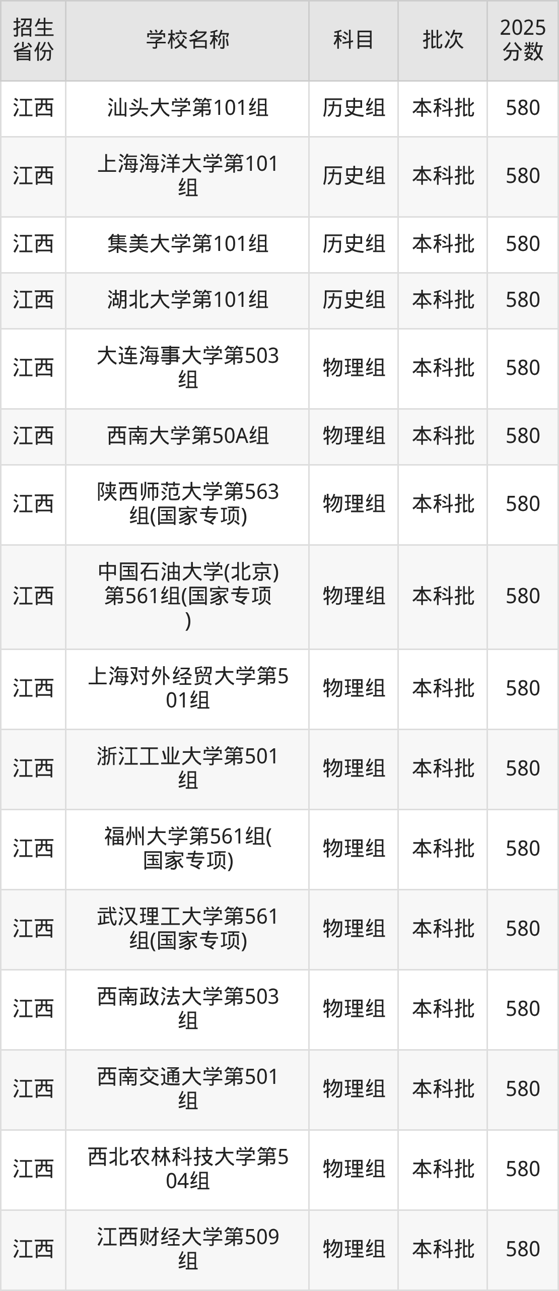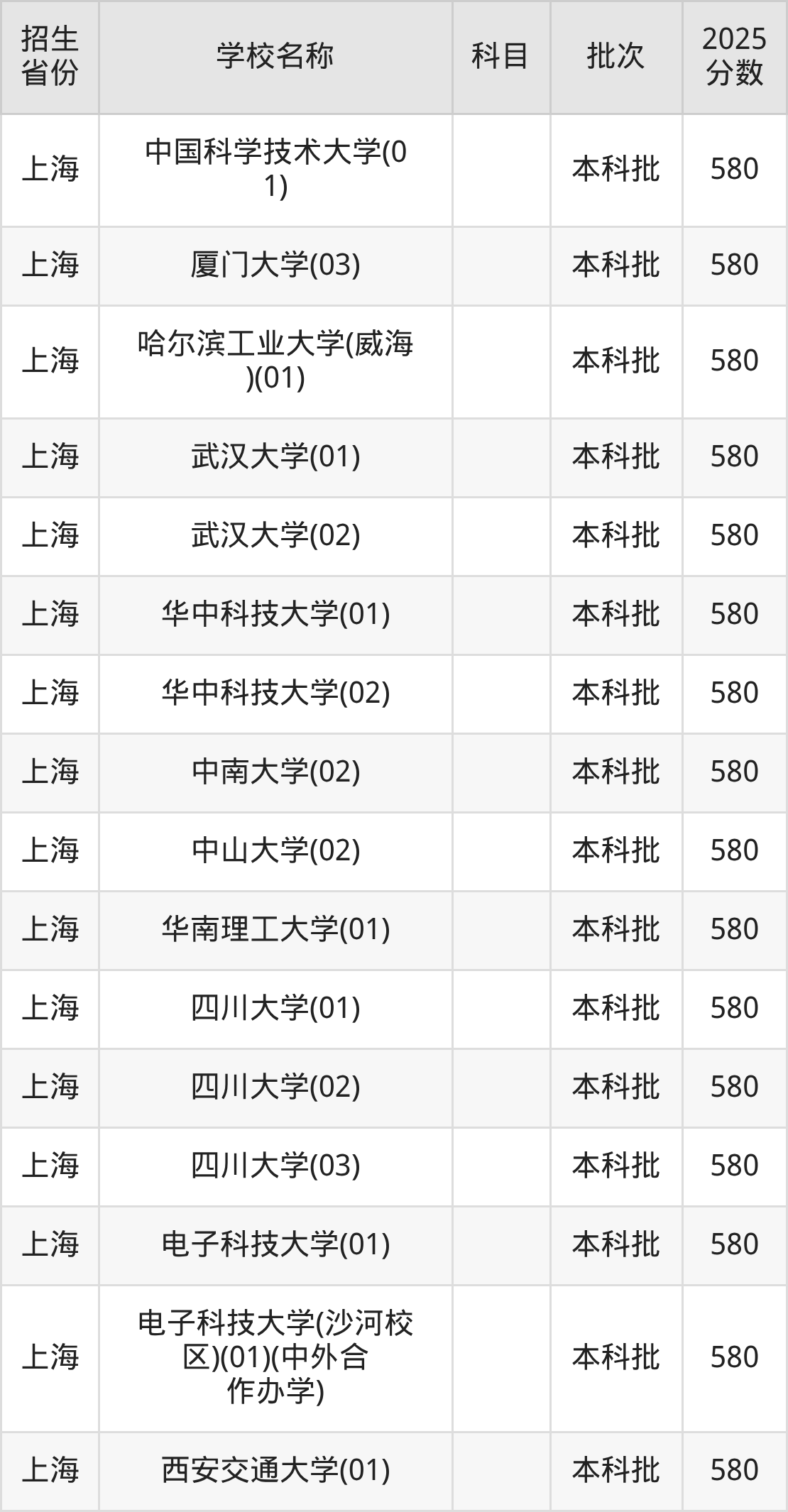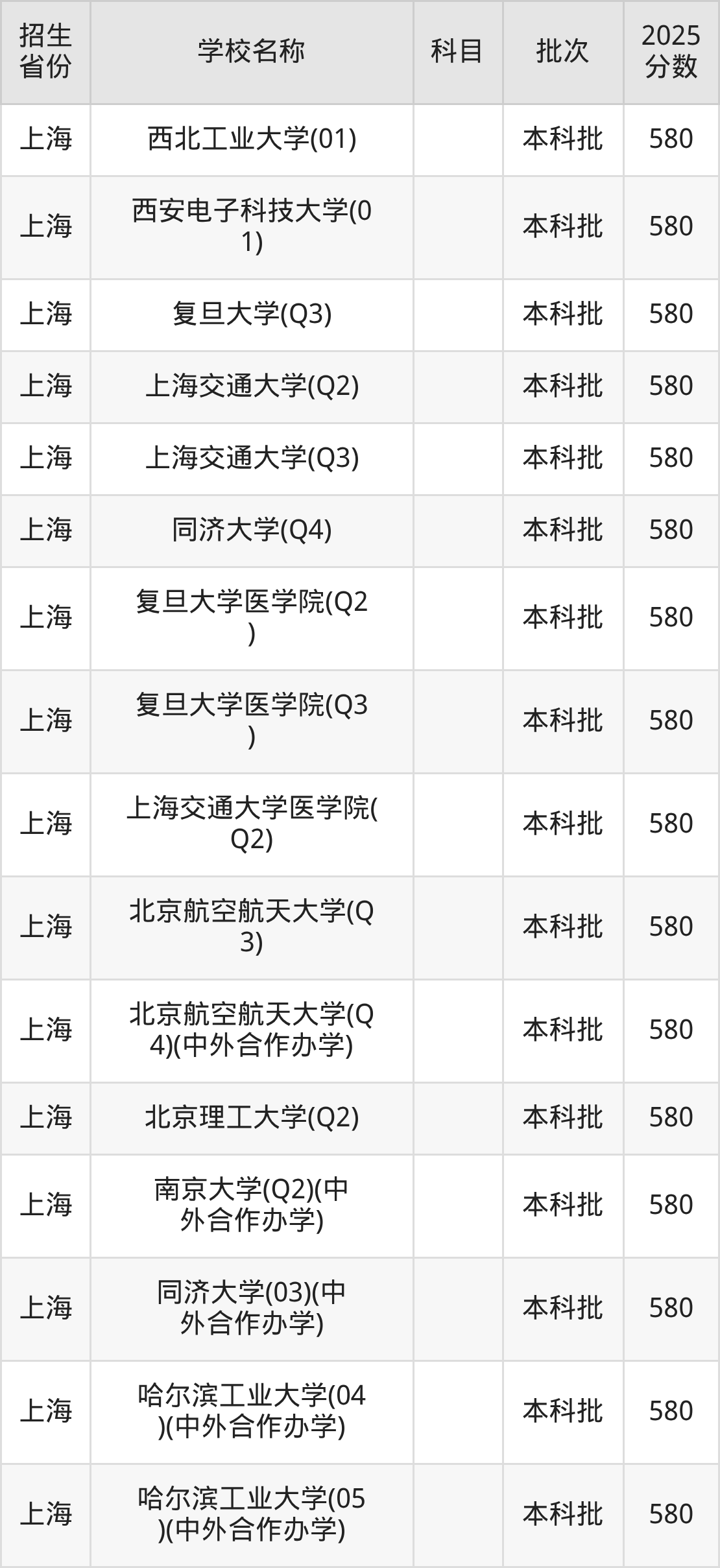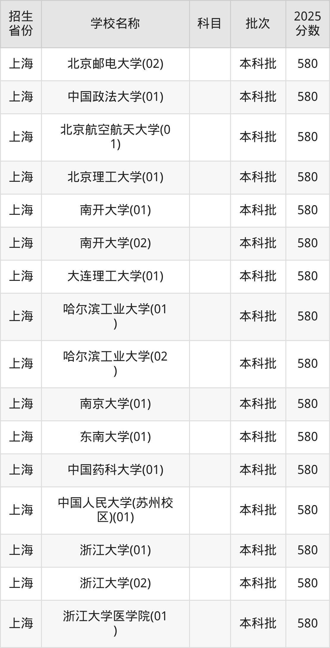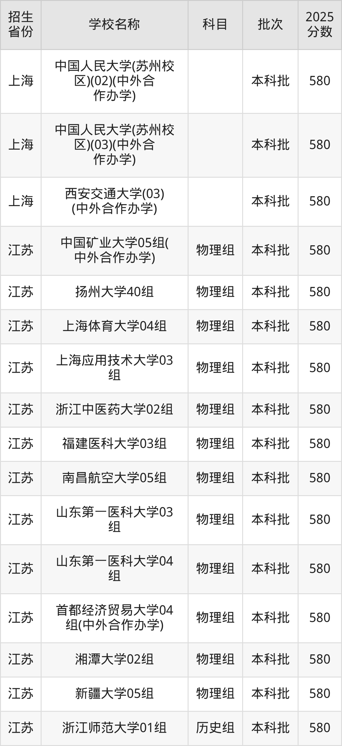 筛选全国各省2025年录取分数线为580分的一本大学如下: