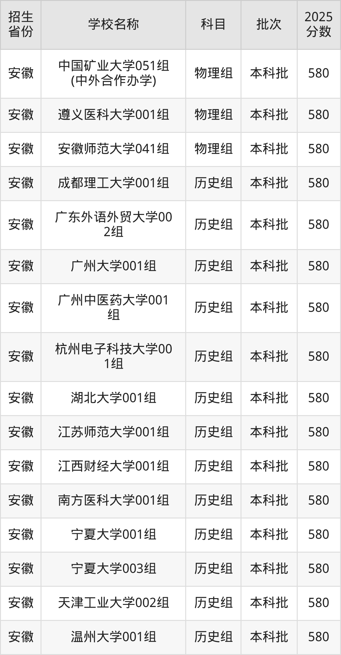 安徽省历史组分数线是580分的一本大学有:成都理工大学、广东外语外贸大学、广州大学、广州中医药大学、杭州电子科技大学、湖北大学、江苏师范大学、江西财经大学、南方医科大学、宁夏大学。