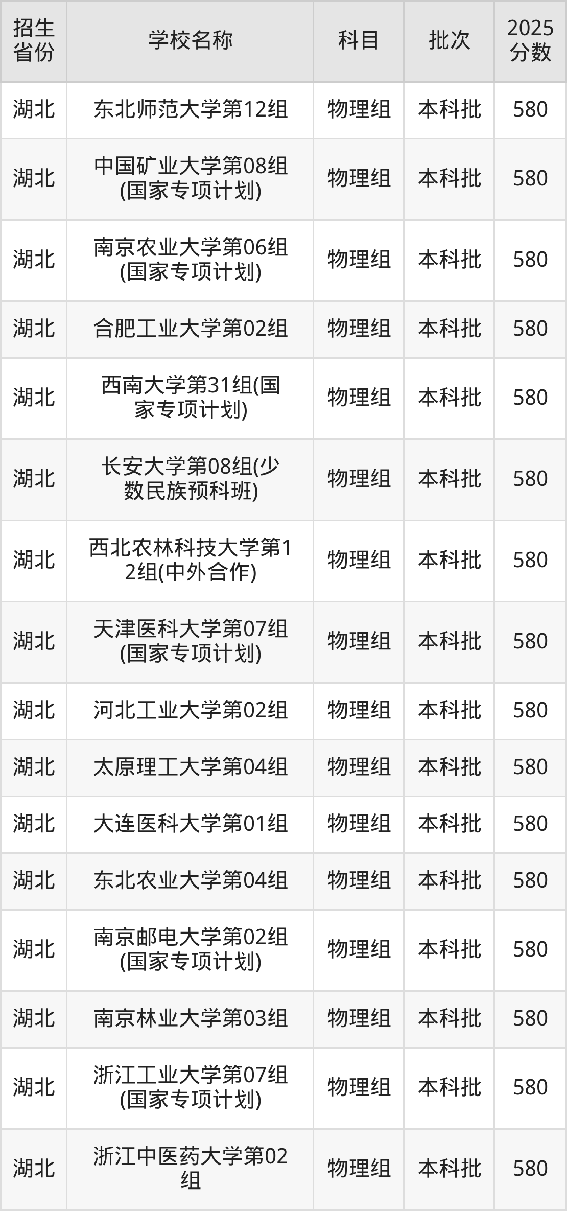 湖北省物理组分数线是580分的一本大学有:北京林业大学、北京体育大学、东北师范大学、中国矿业大学、南京农业大学、合肥工业大学、西南大学、长安大学、西北农林科技大学、天津医科大学。