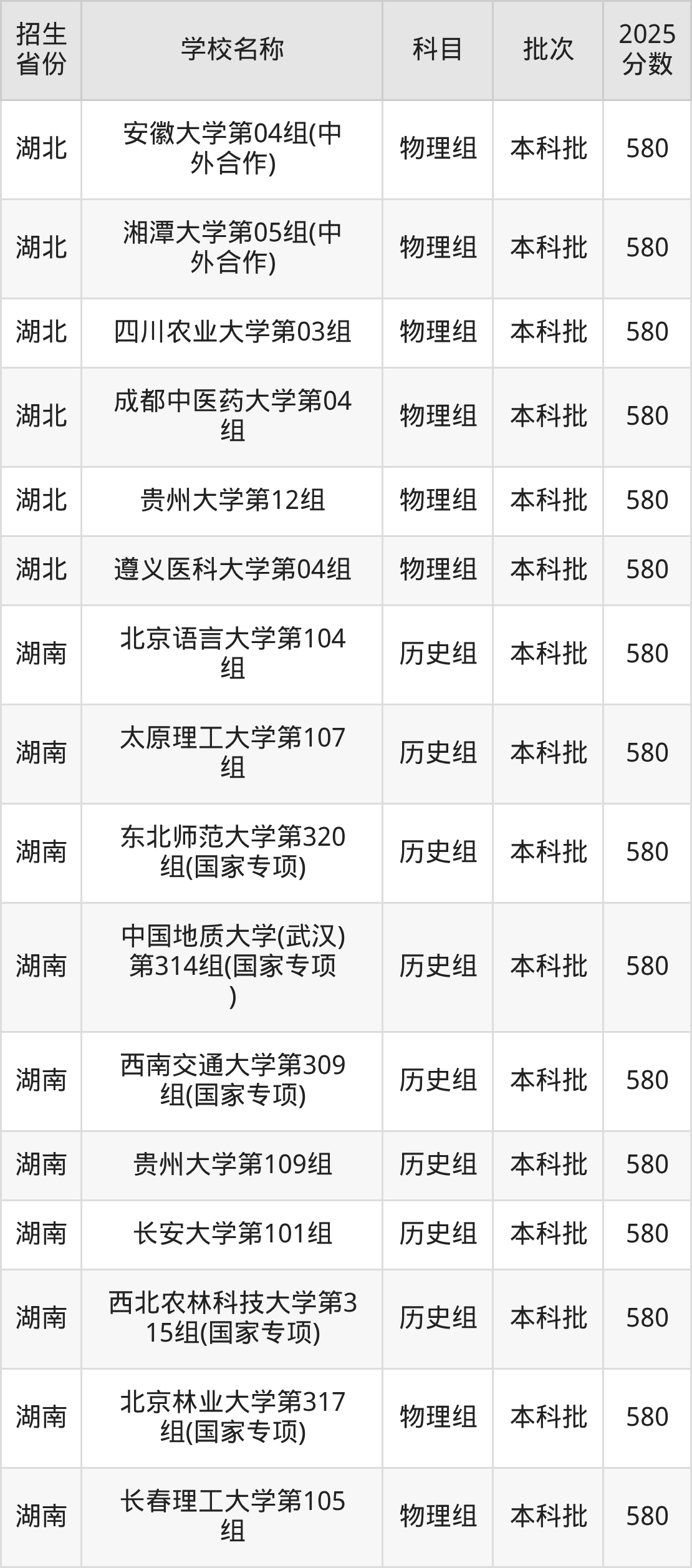 湖南省历史组分数线是580分的一本大学有:北京语言大学、太原理工大学、东北师范大学、中国地质大学(武汉)、西南交通大学、贵州大学、长安大学、西北农林科技大学。