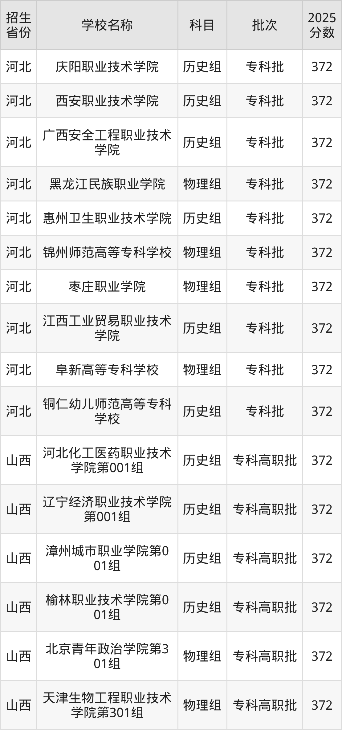 山西省历史组分数线是372分的公办专科大学有:河北化工医药职业技术学院、辽宁经济职业技术学院、漳州城市职业学院、榆林职业技术学院。