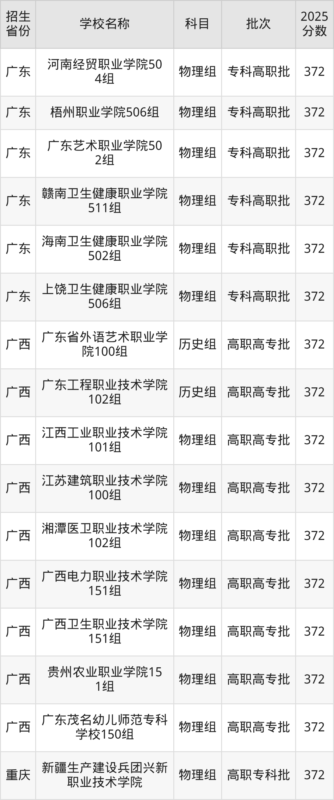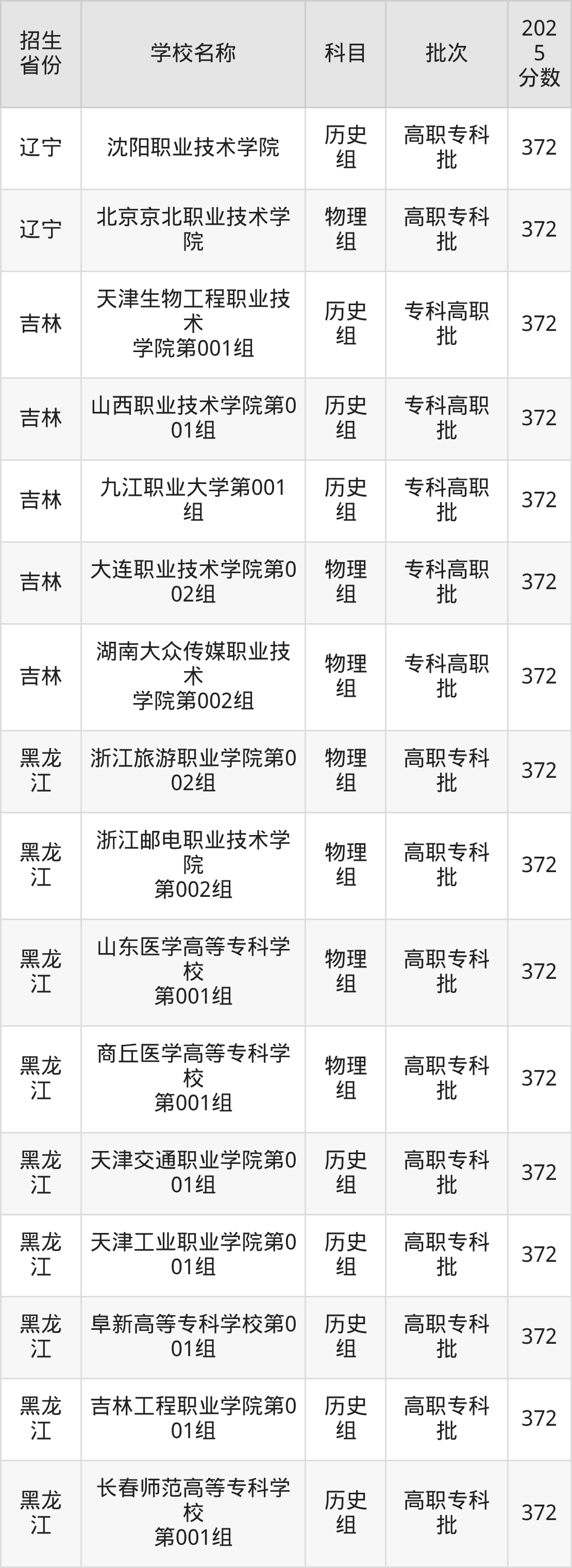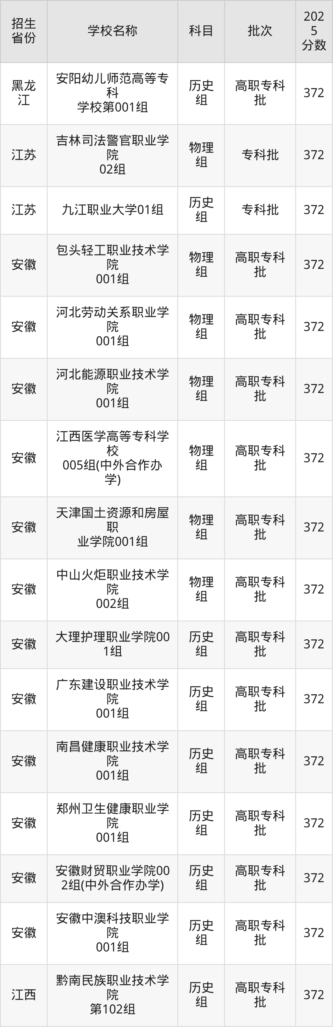 筛选全国各省2025年录取分数线为372分的公办专科大学如下:
