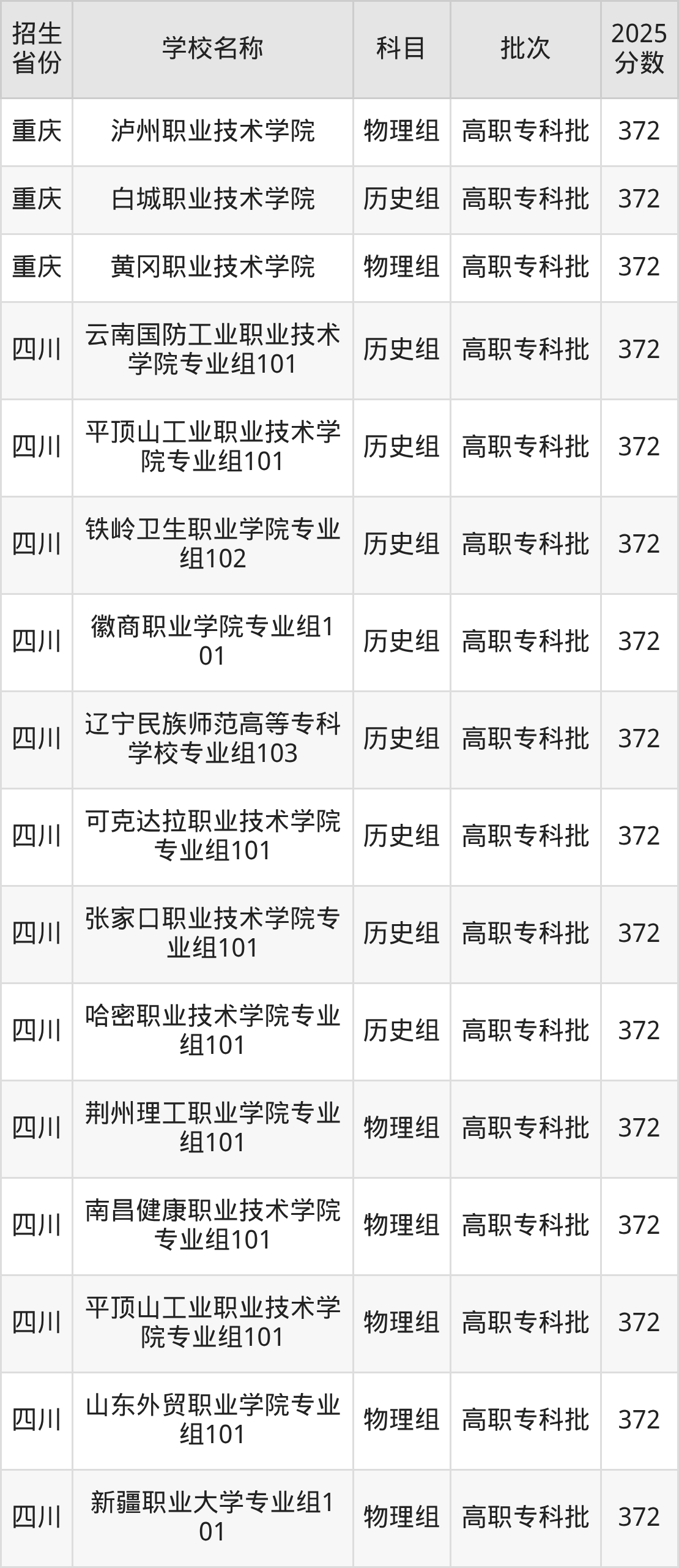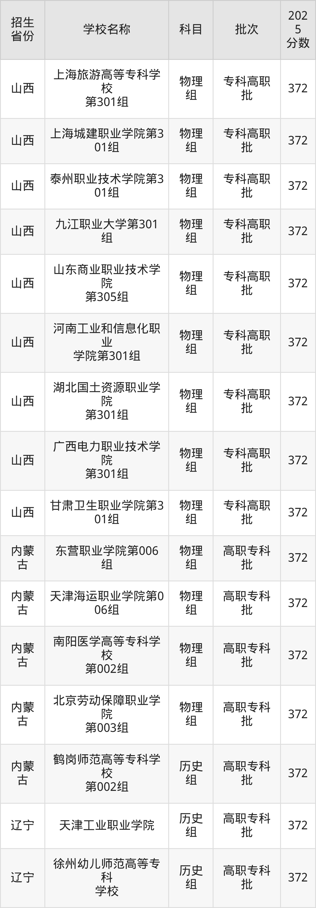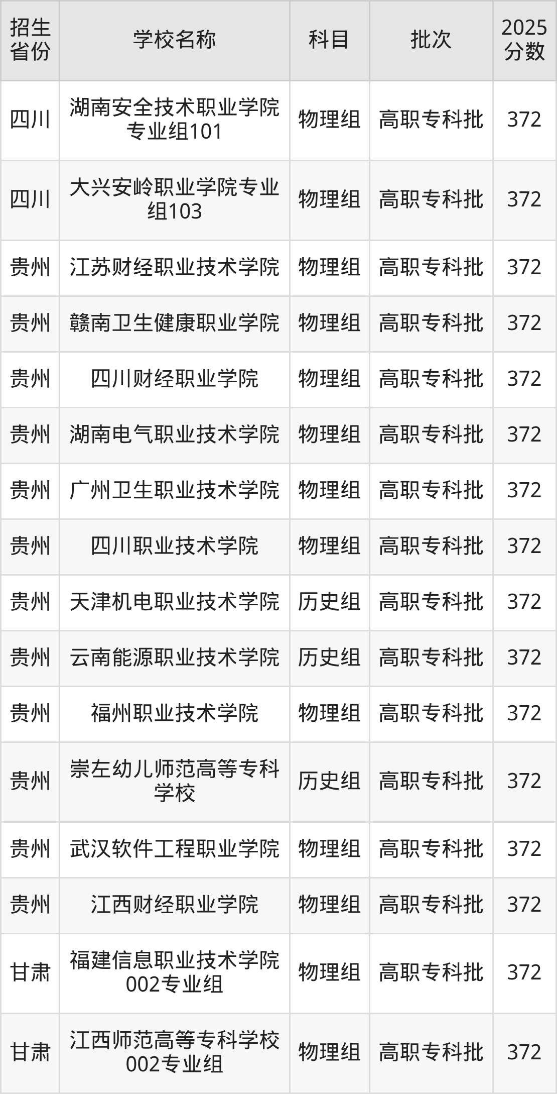 筛选全国各省2025年录取分数线为372分的公办专科大学如下: