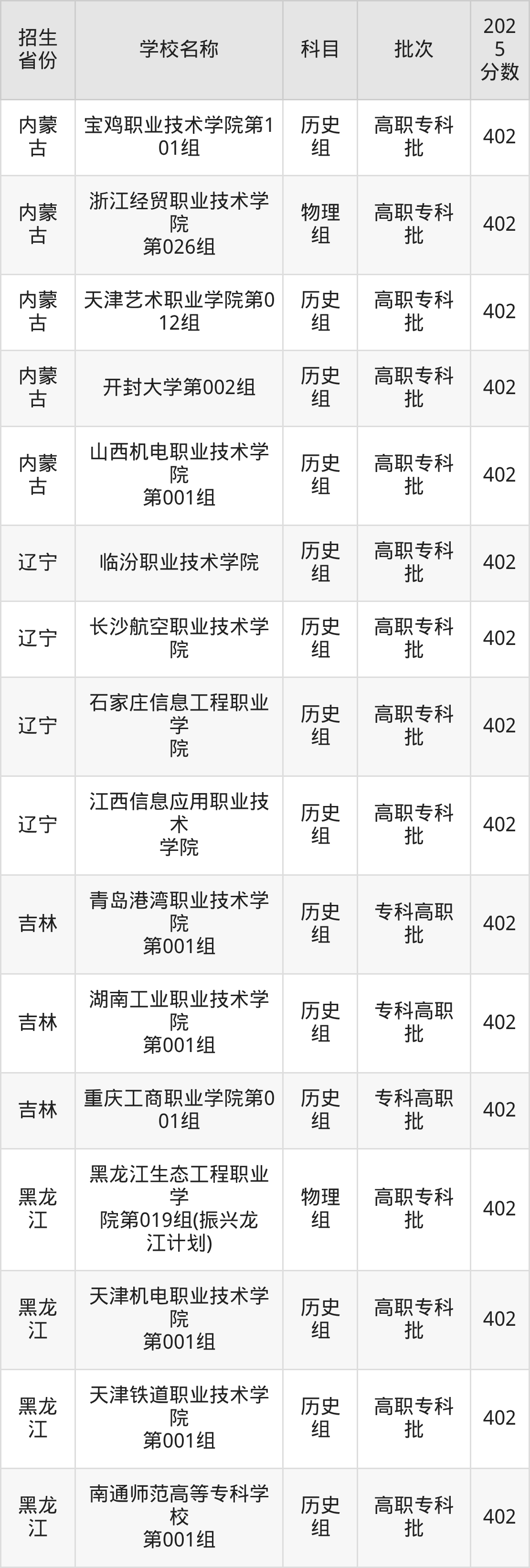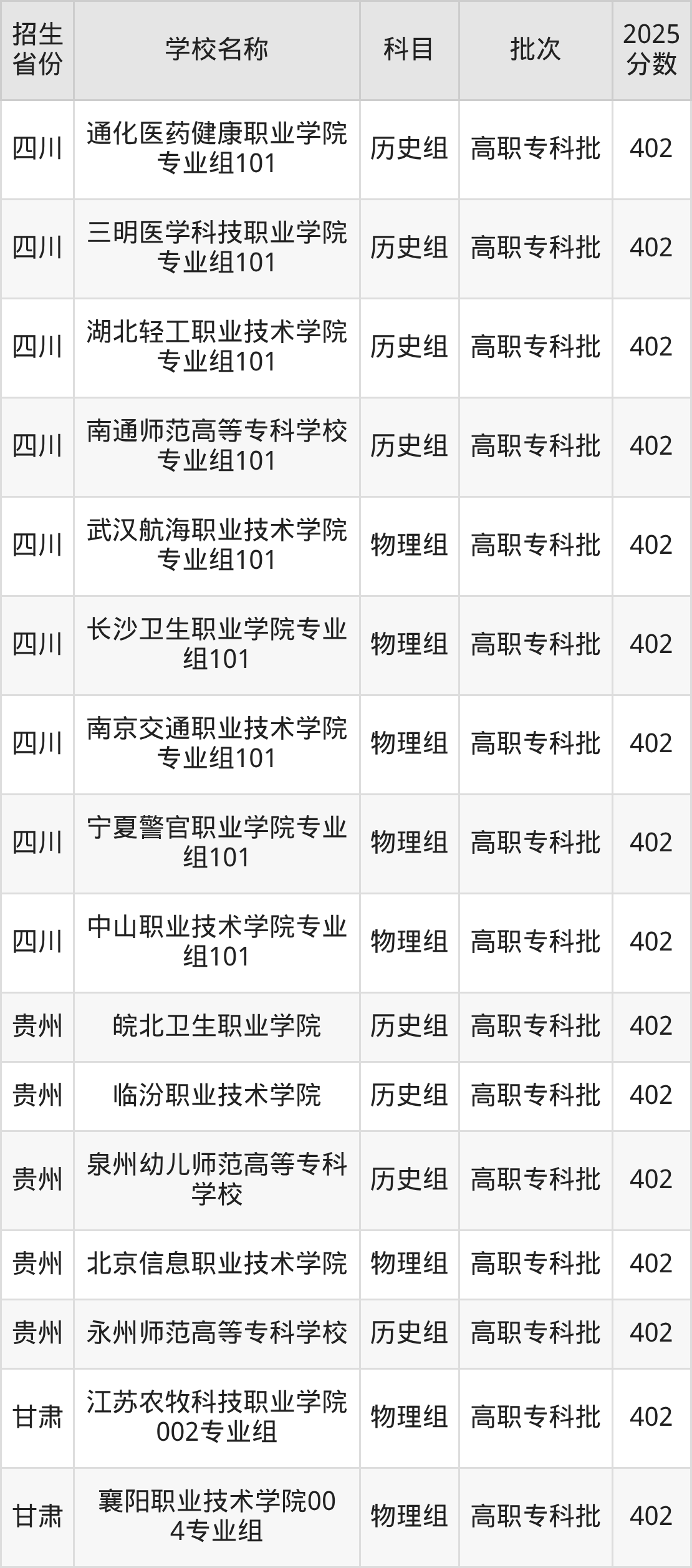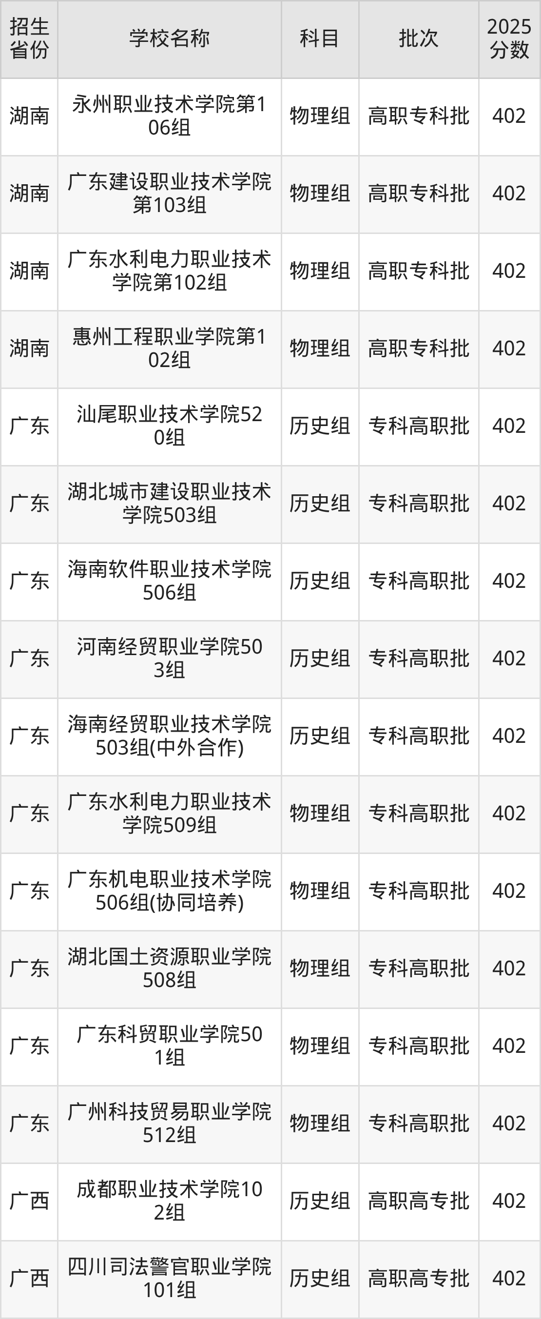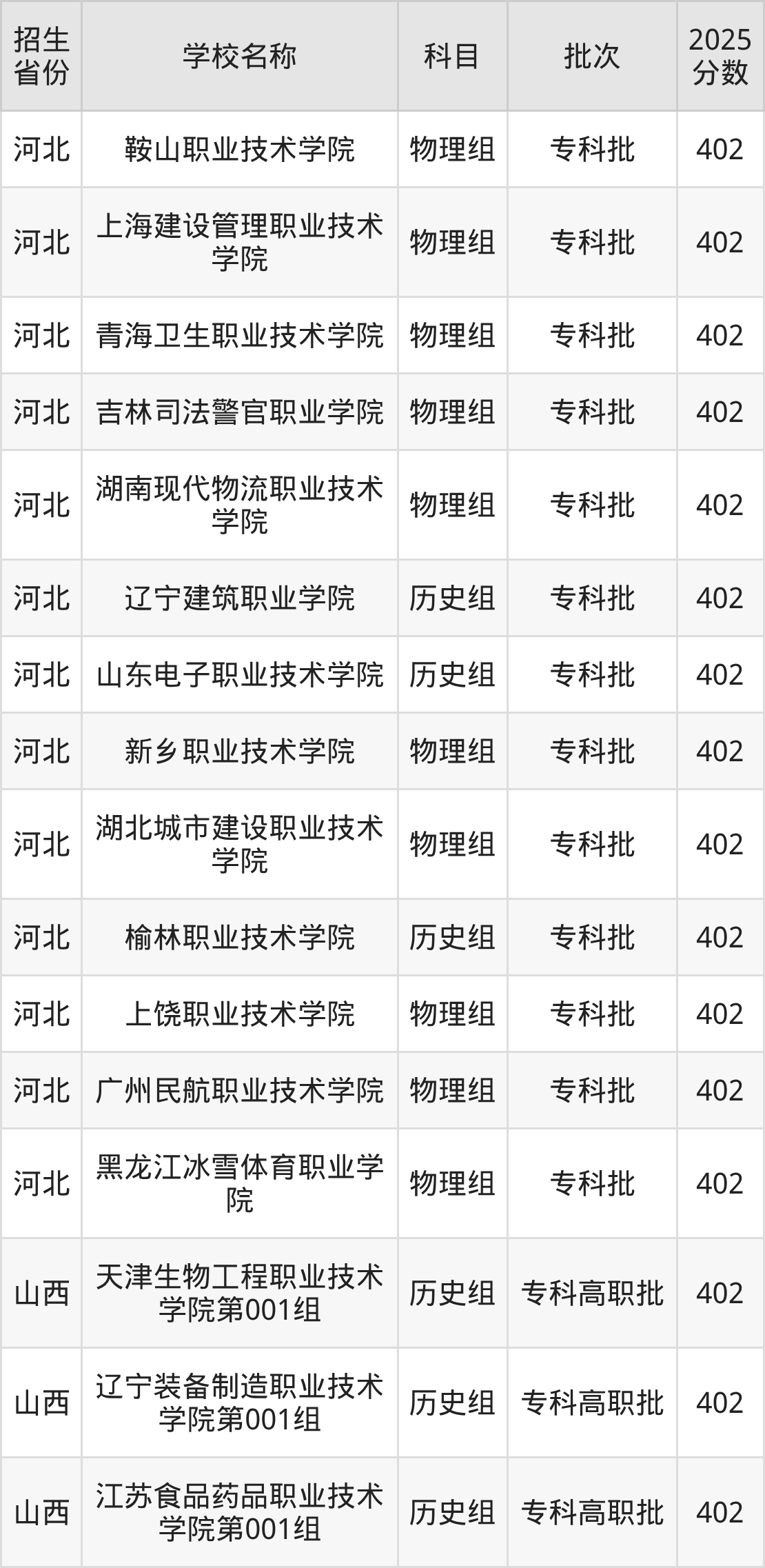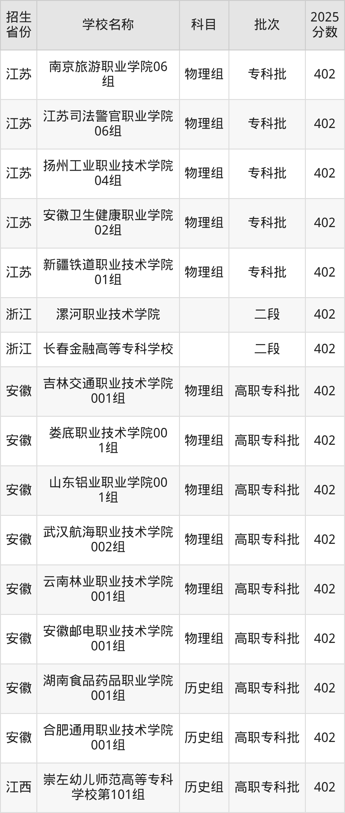 筛选全国各省2025年录取分数线为402分的公办专科大学如下: