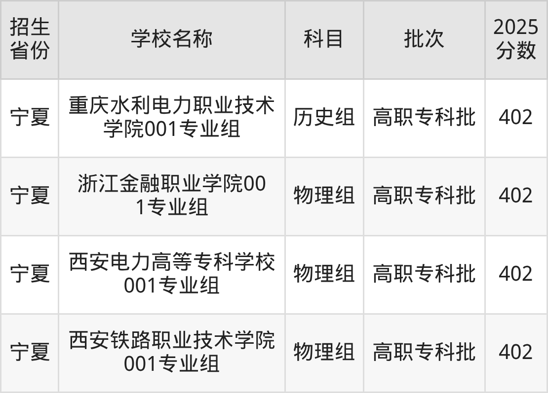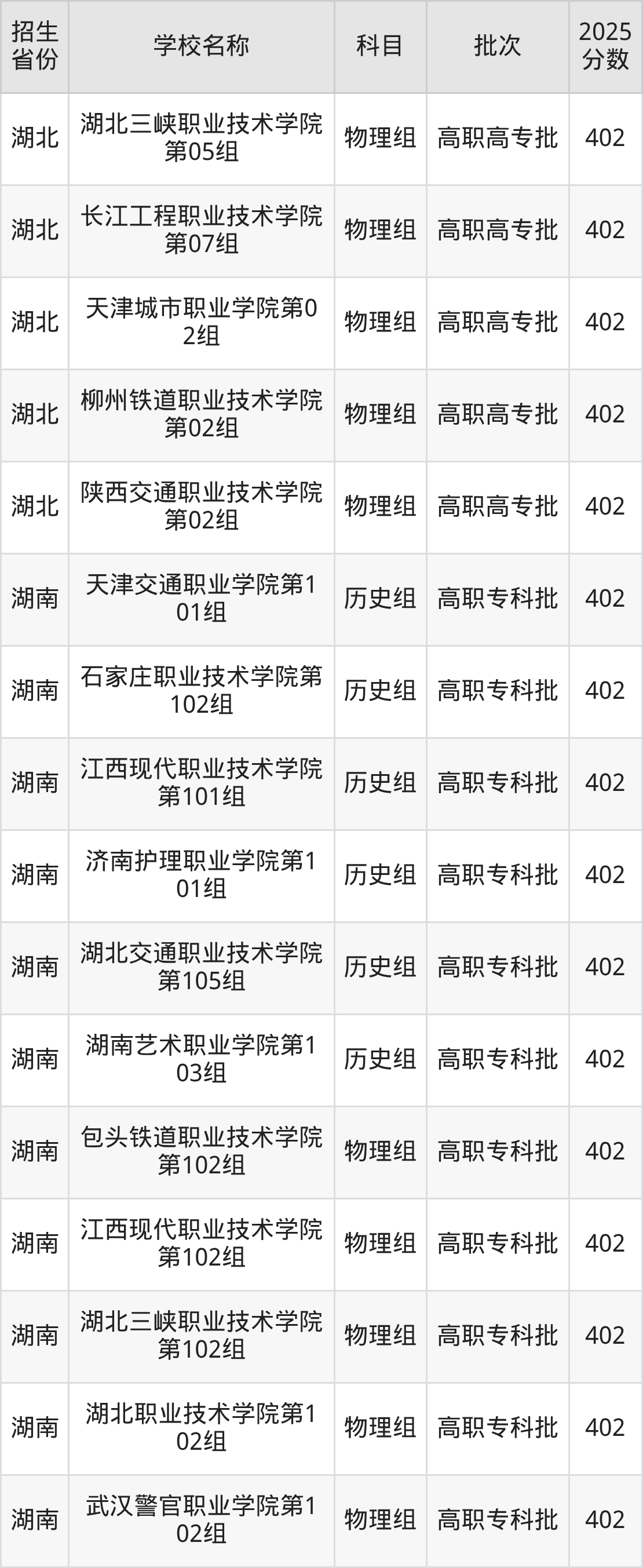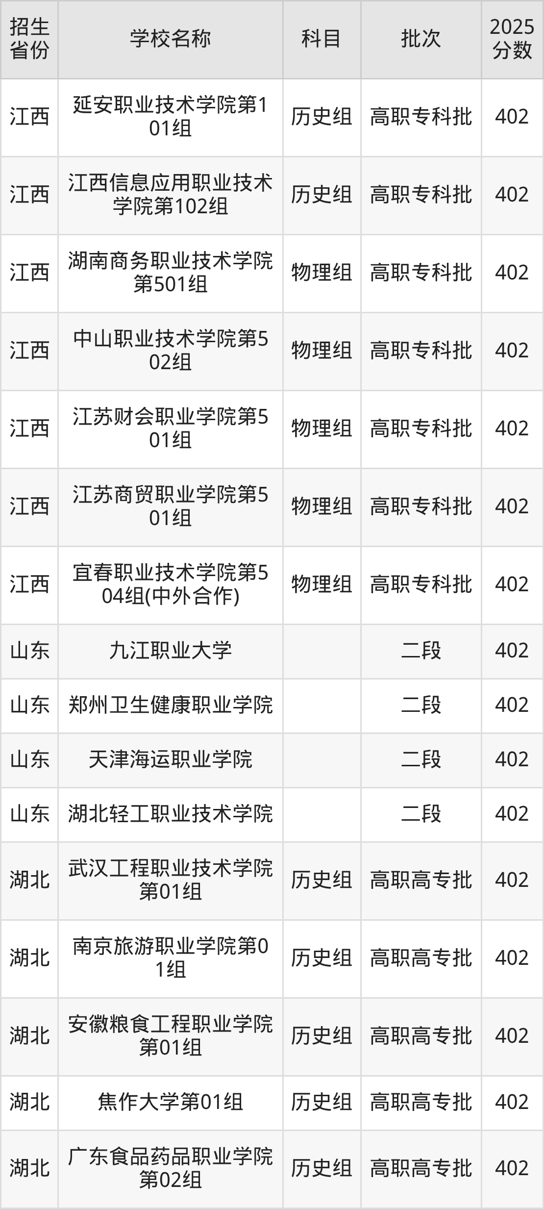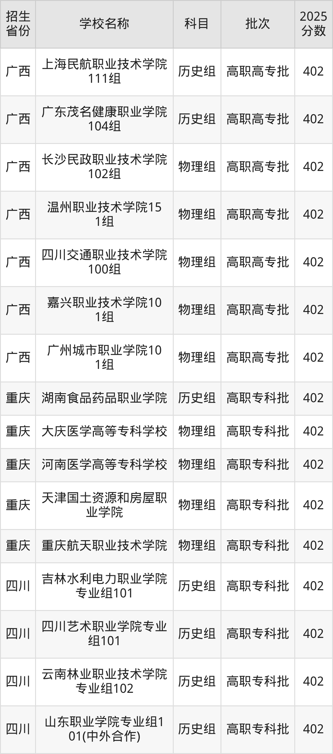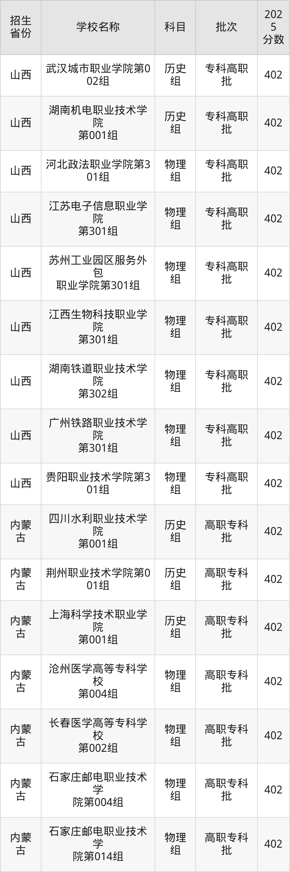筛选全国各省2025年录取分数线为402分的公办专科大学如下:
