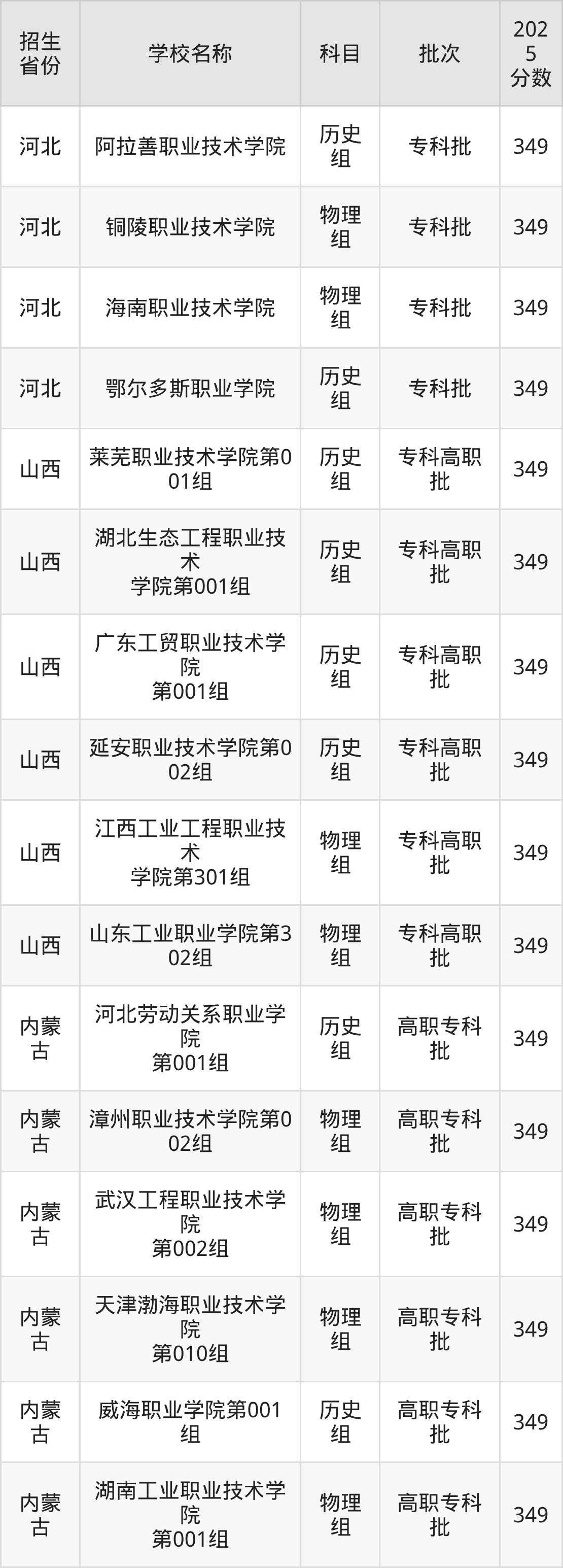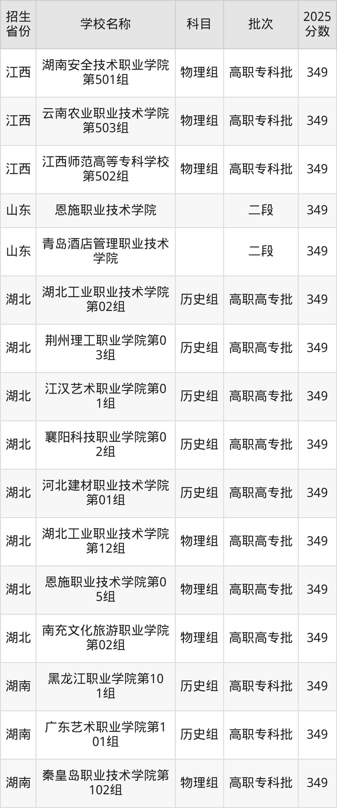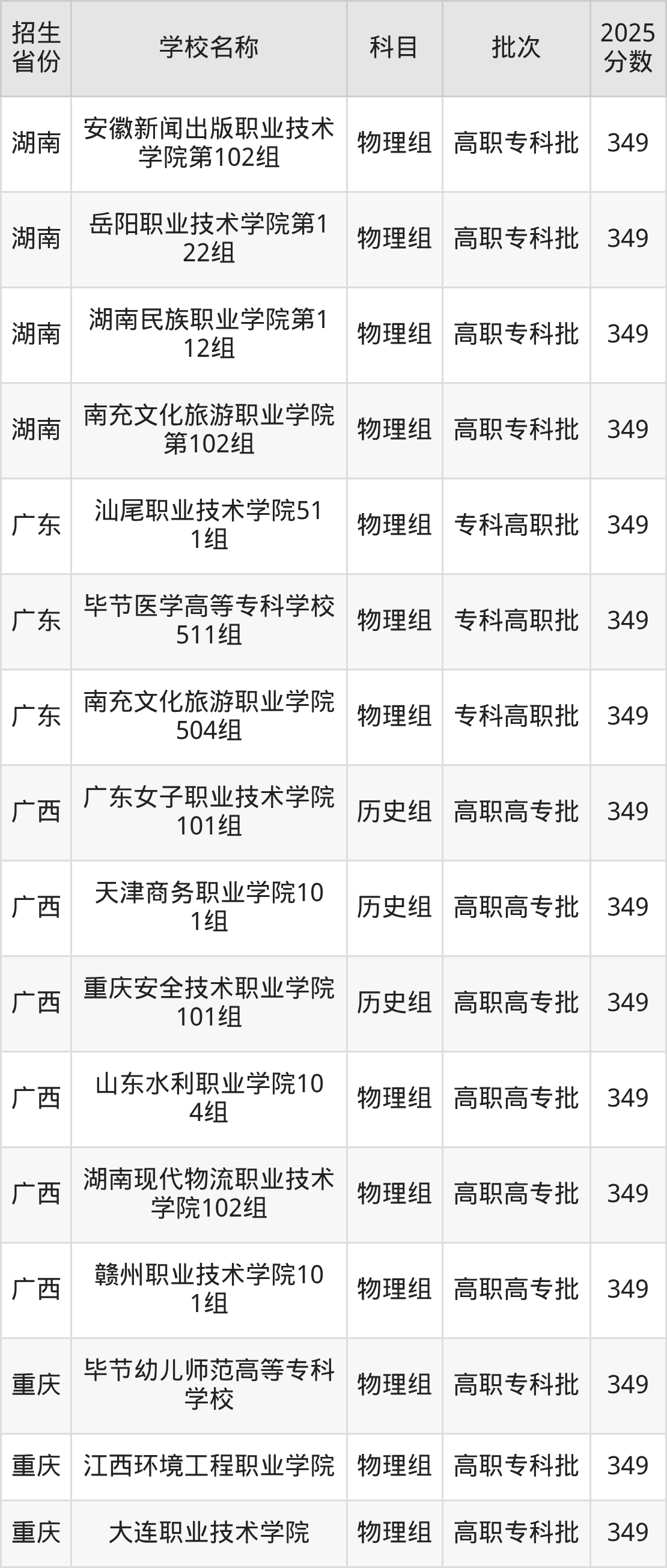 筛选全国各省2025年录取分数线为349分的公办专科大学如下: