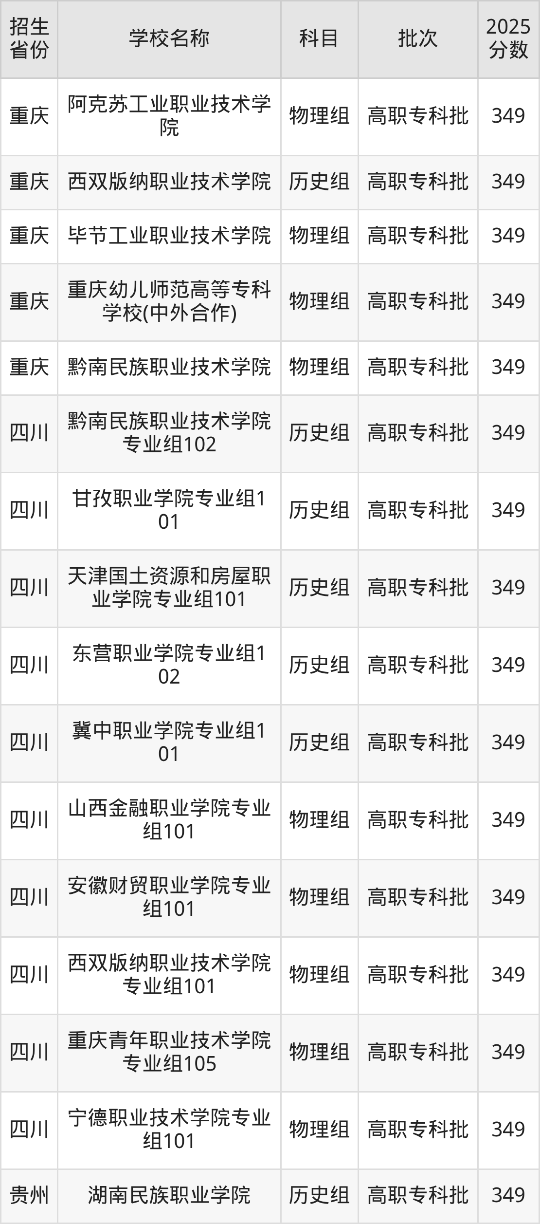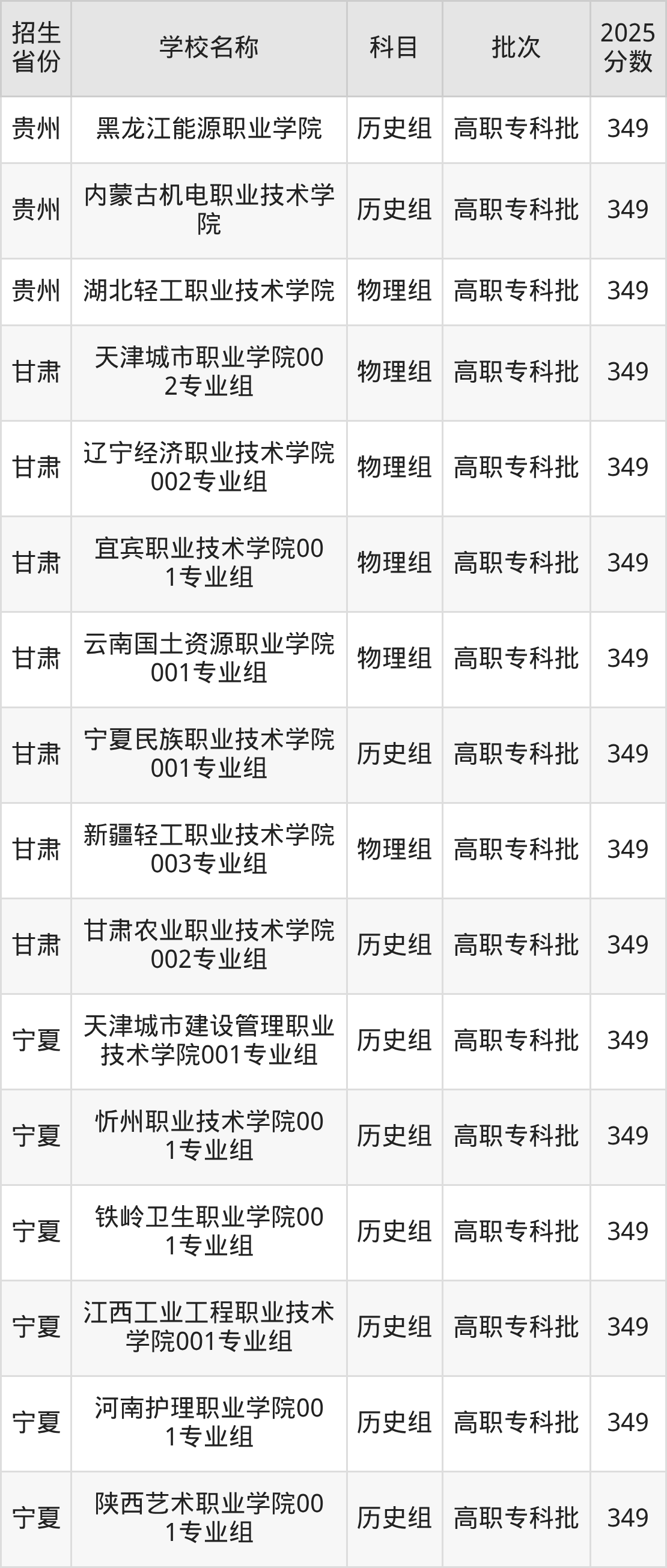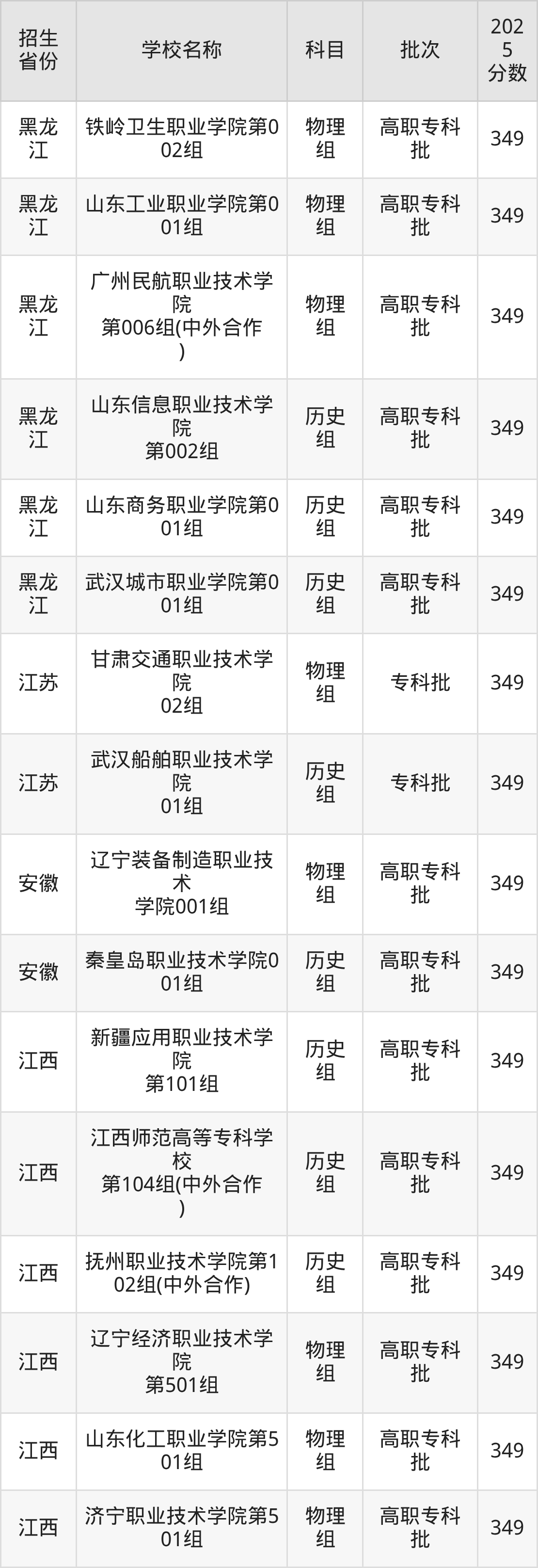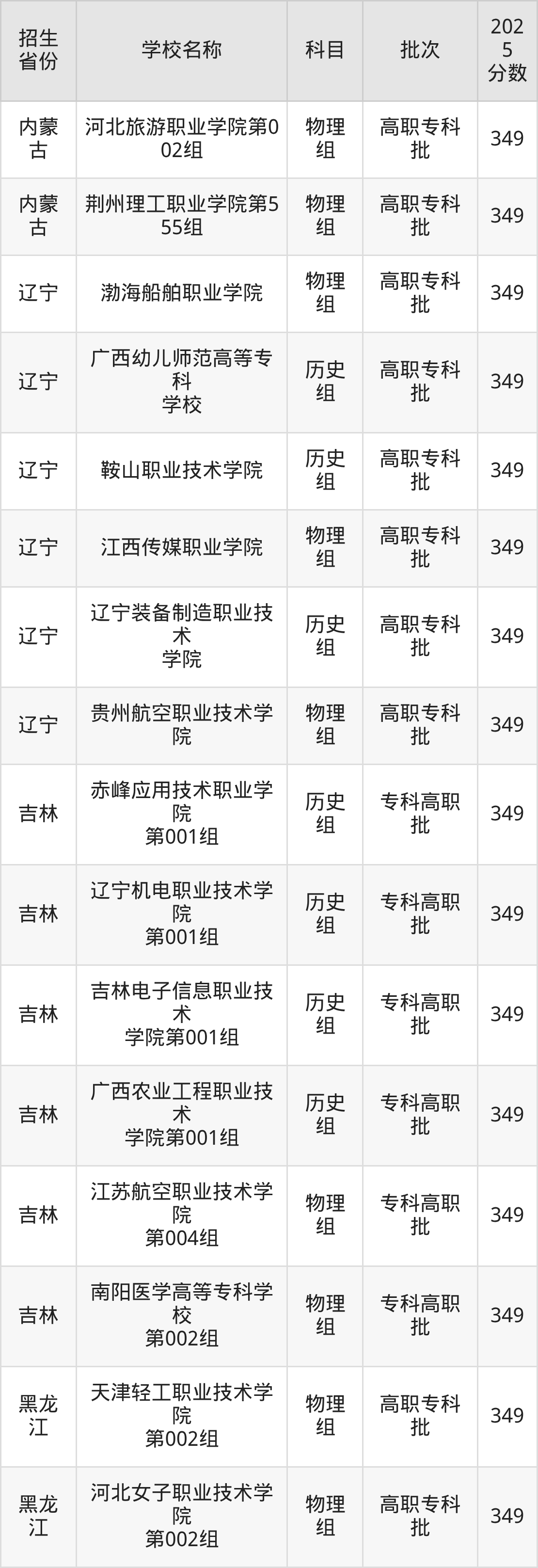 筛选全国各省2025年录取分数线为349分的公办专科大学如下:
