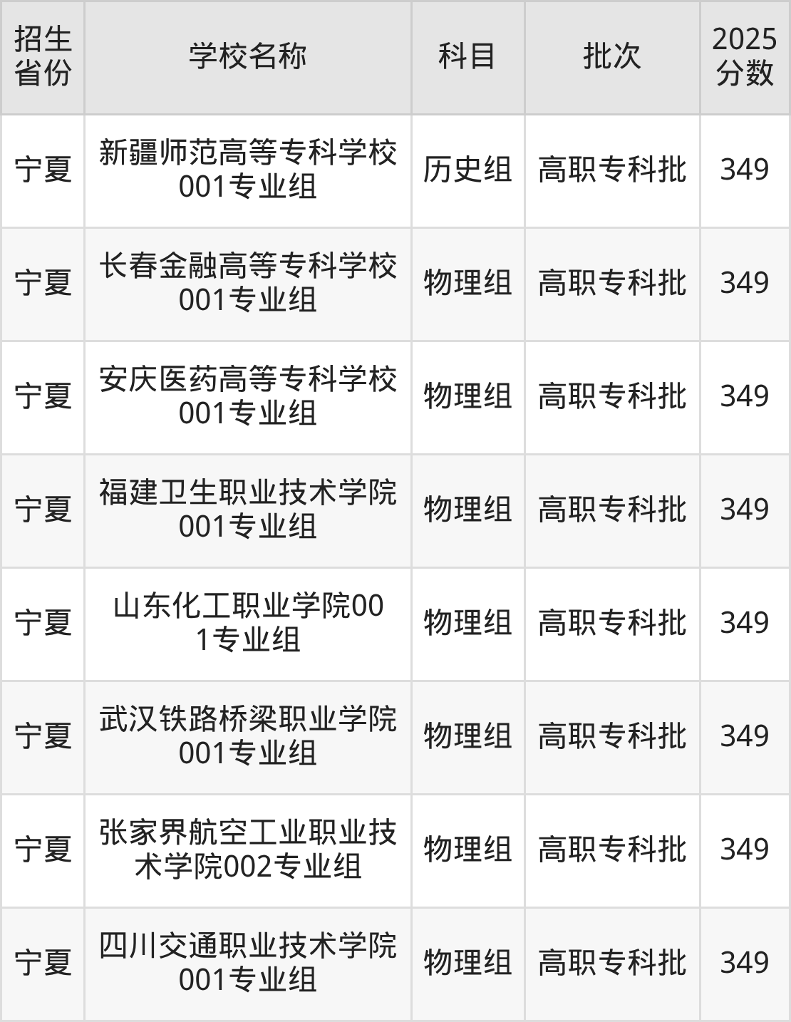 宁夏回族自治区历史组分数线是349分的公办专科大学有:天津城市建设管理职业技术学院、忻州职业技术学院、铁岭卫生职业学院、江西工业工程职业技术学院、河南护理职业学院、陕西艺术职业学院、新疆师范高等专科学校。