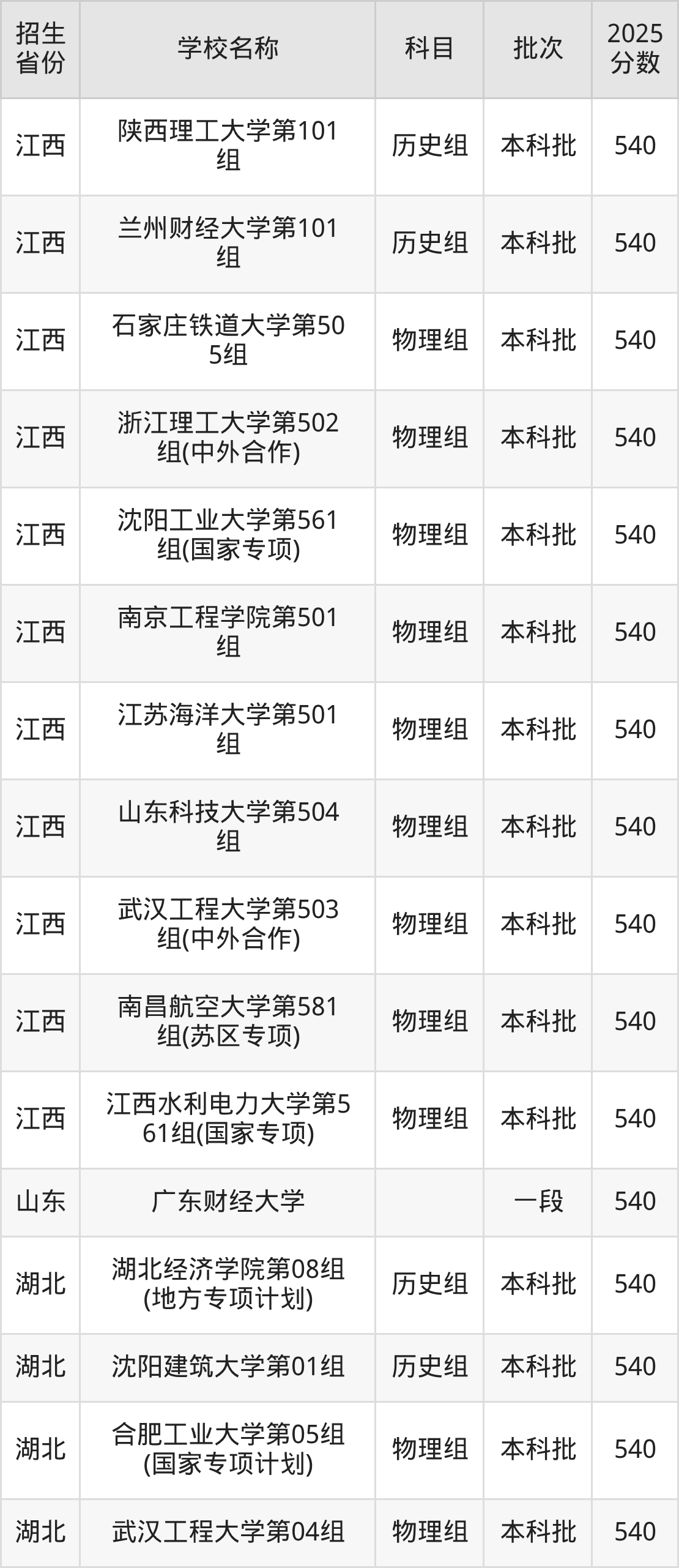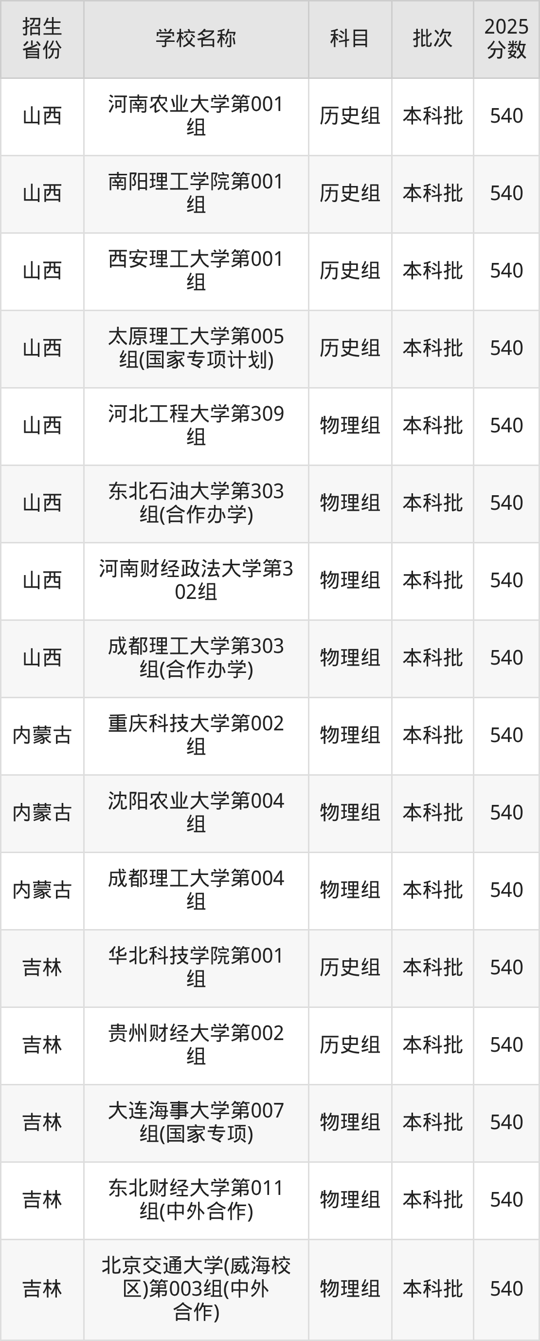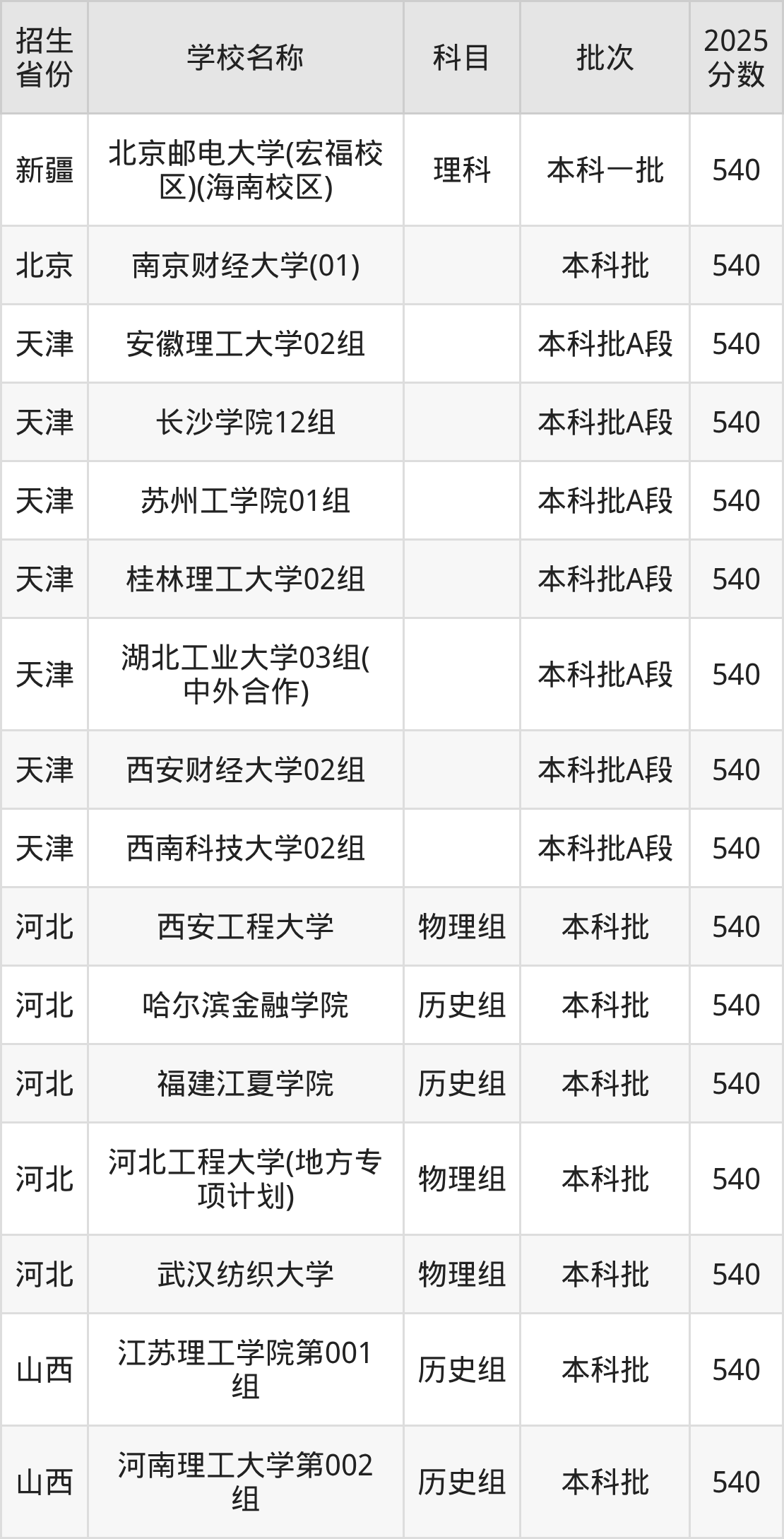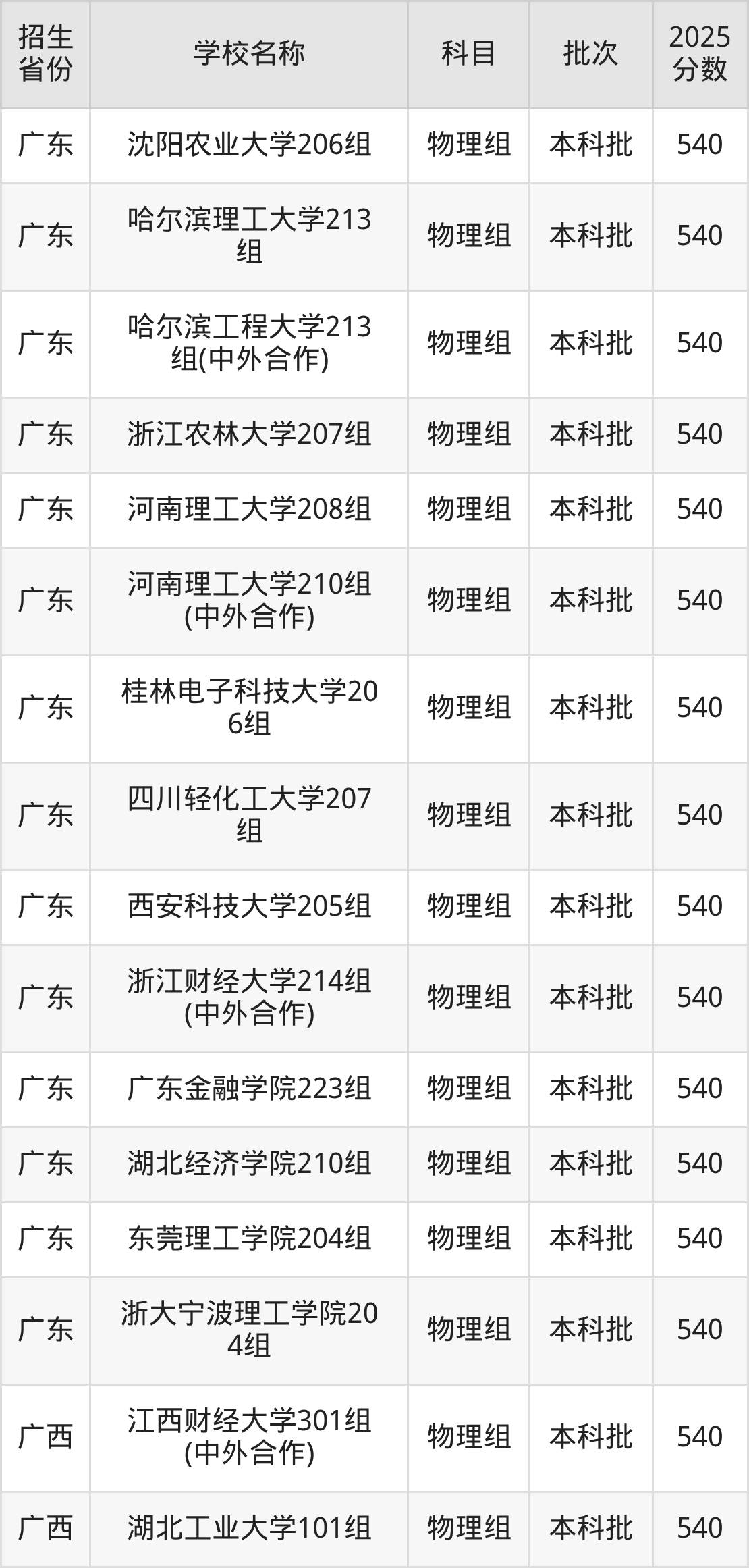筛选全国各省2025年录取分数线为540分的理科大学如下: