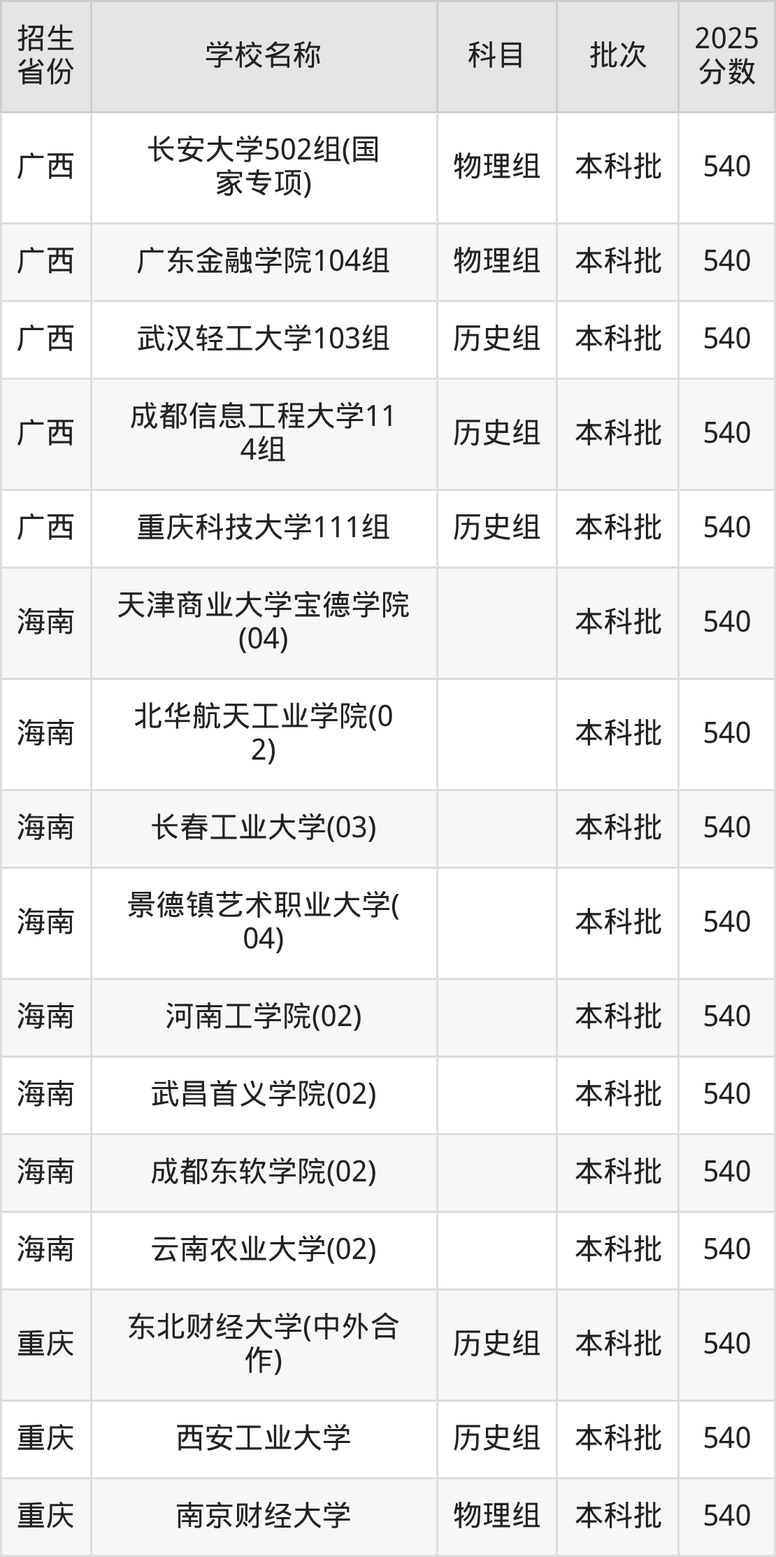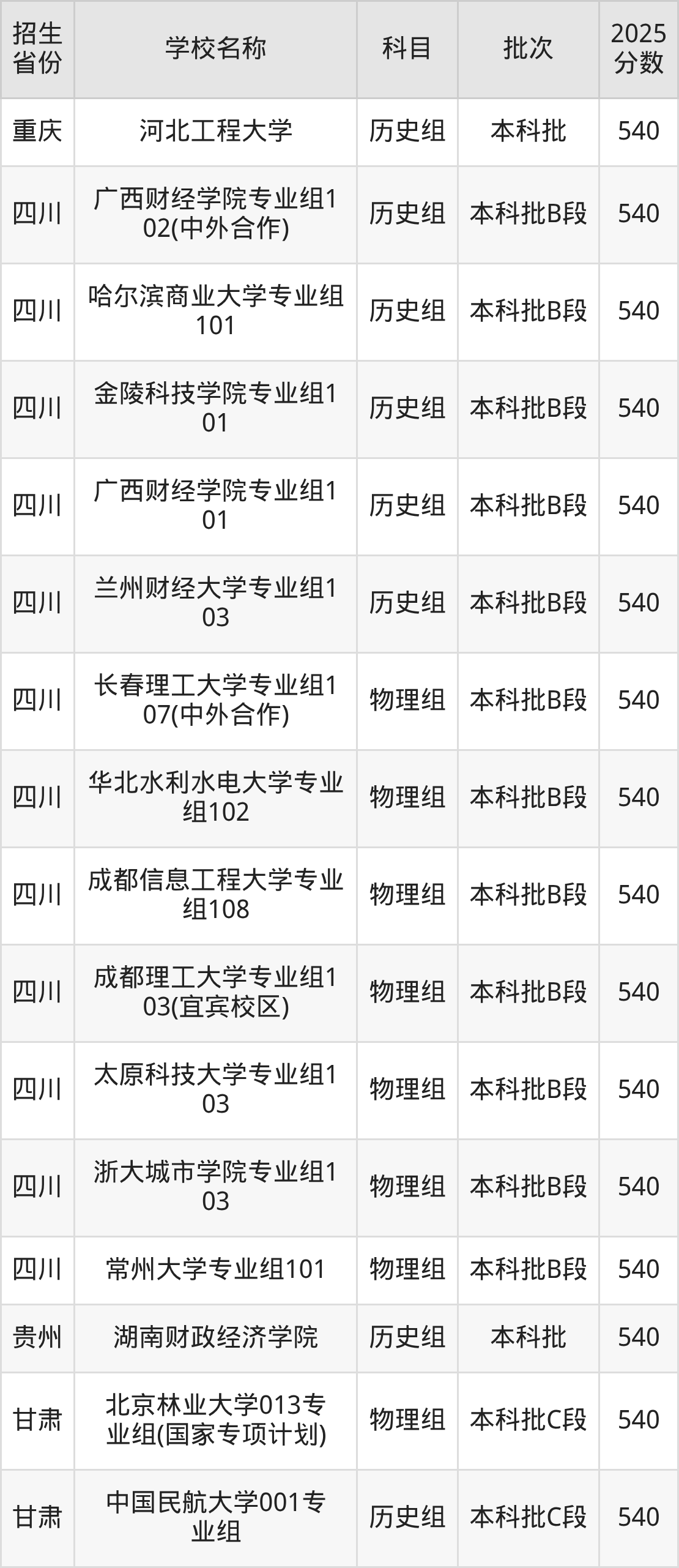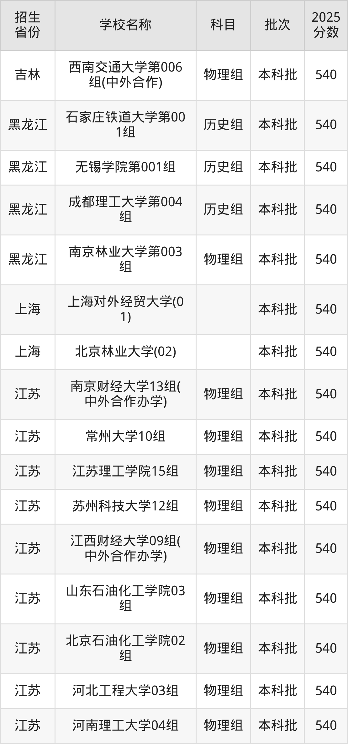 筛选全国各省2025年录取分数线为540分的理科大学如下:
