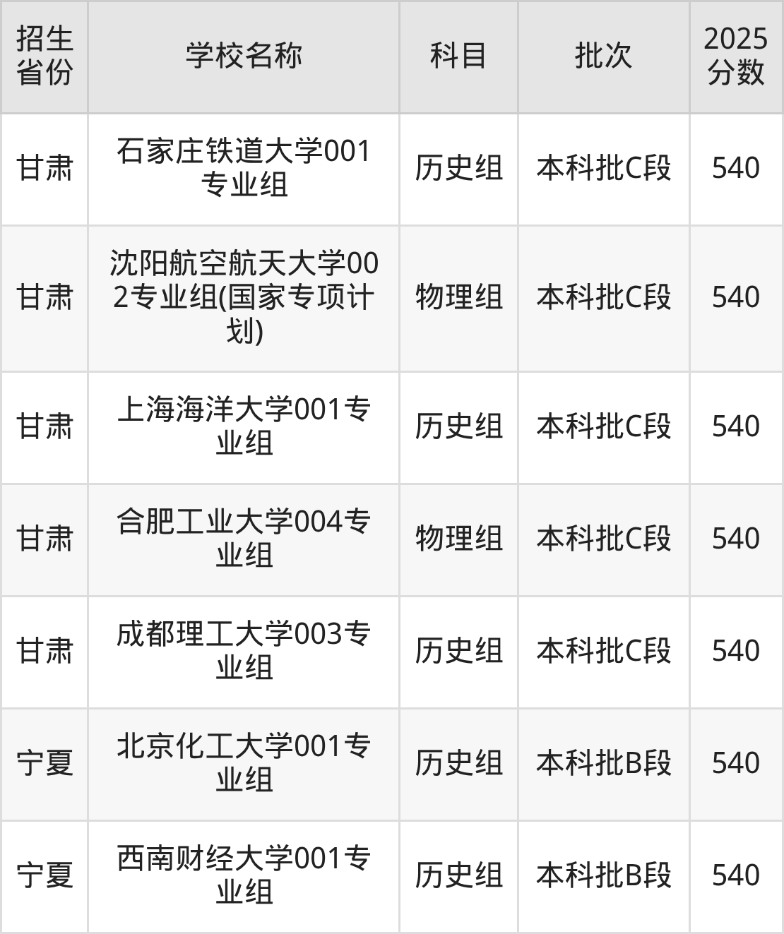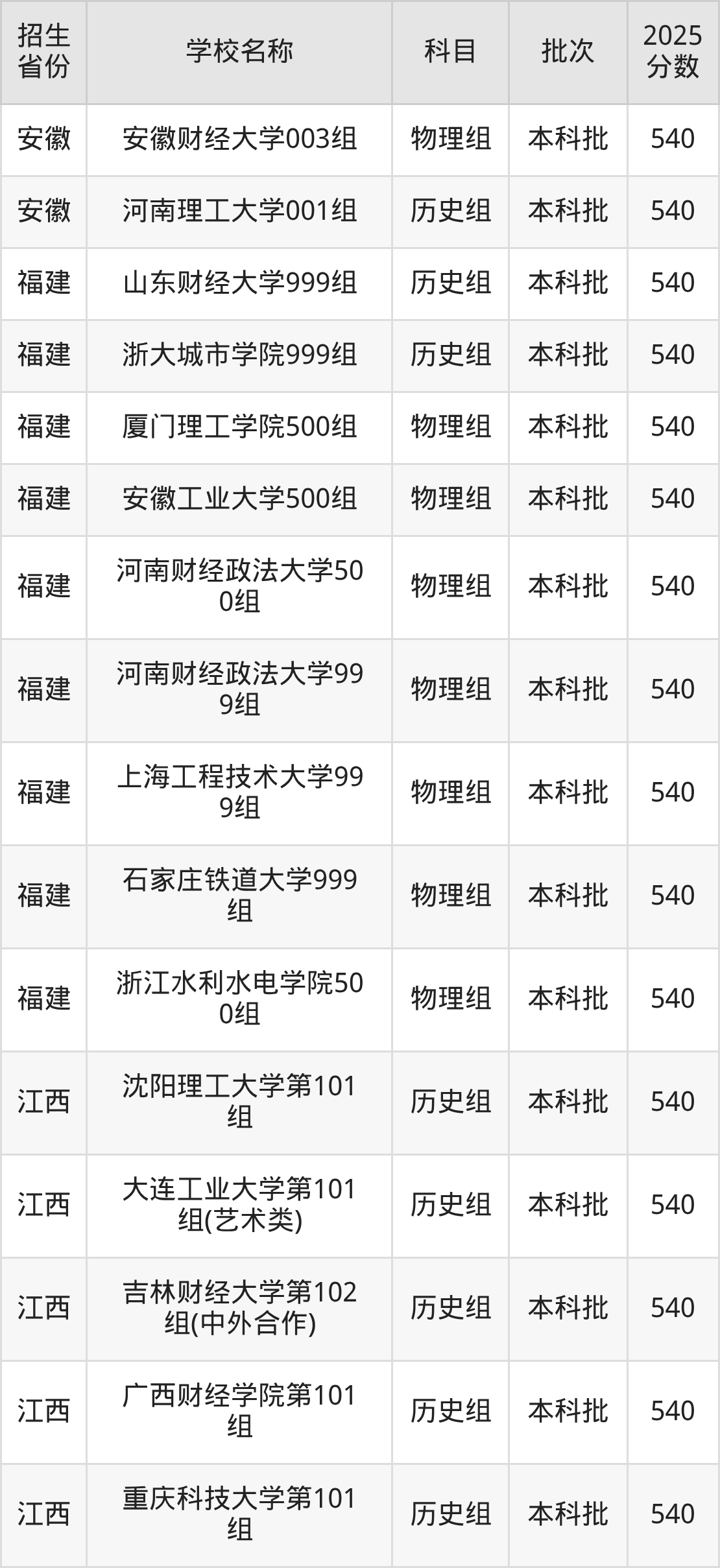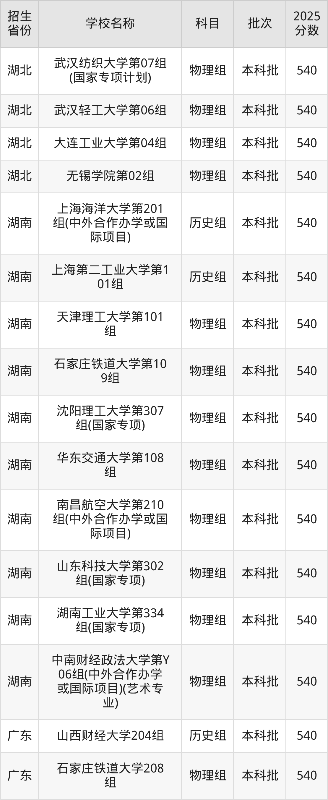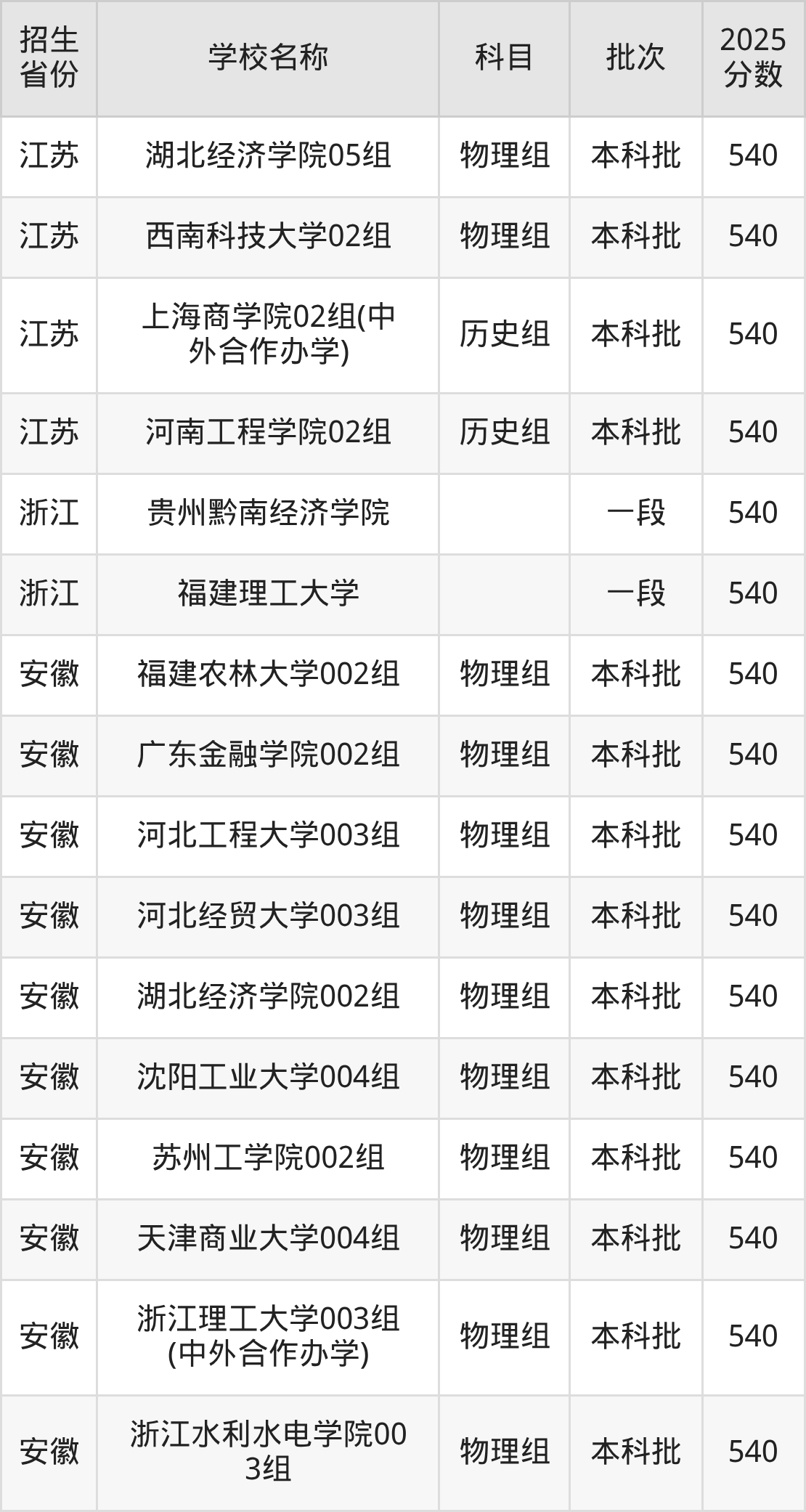 筛选全国各省2025年录取分数线为540分的理科大学如下: