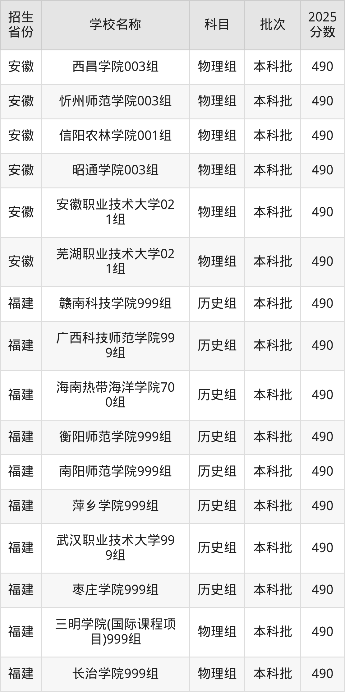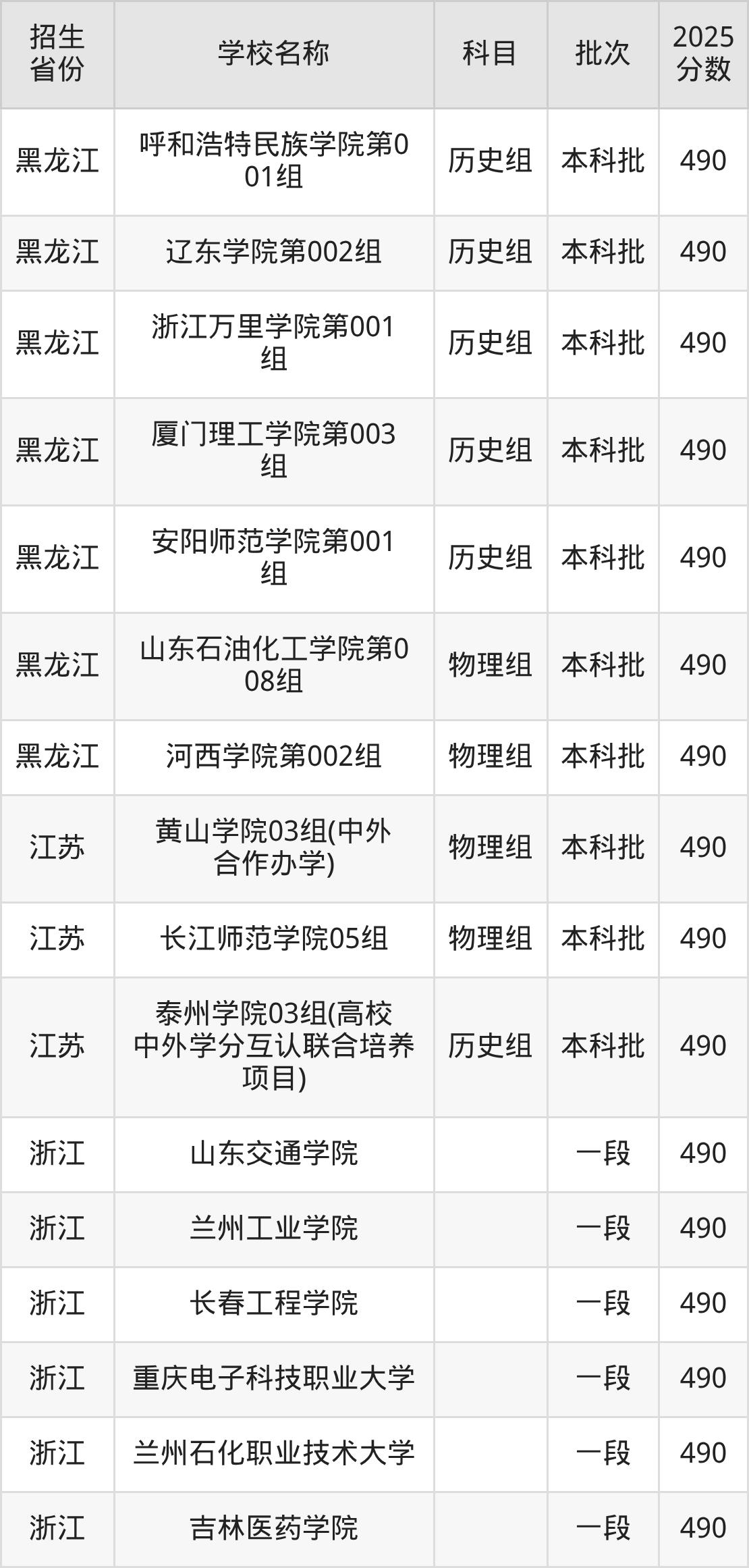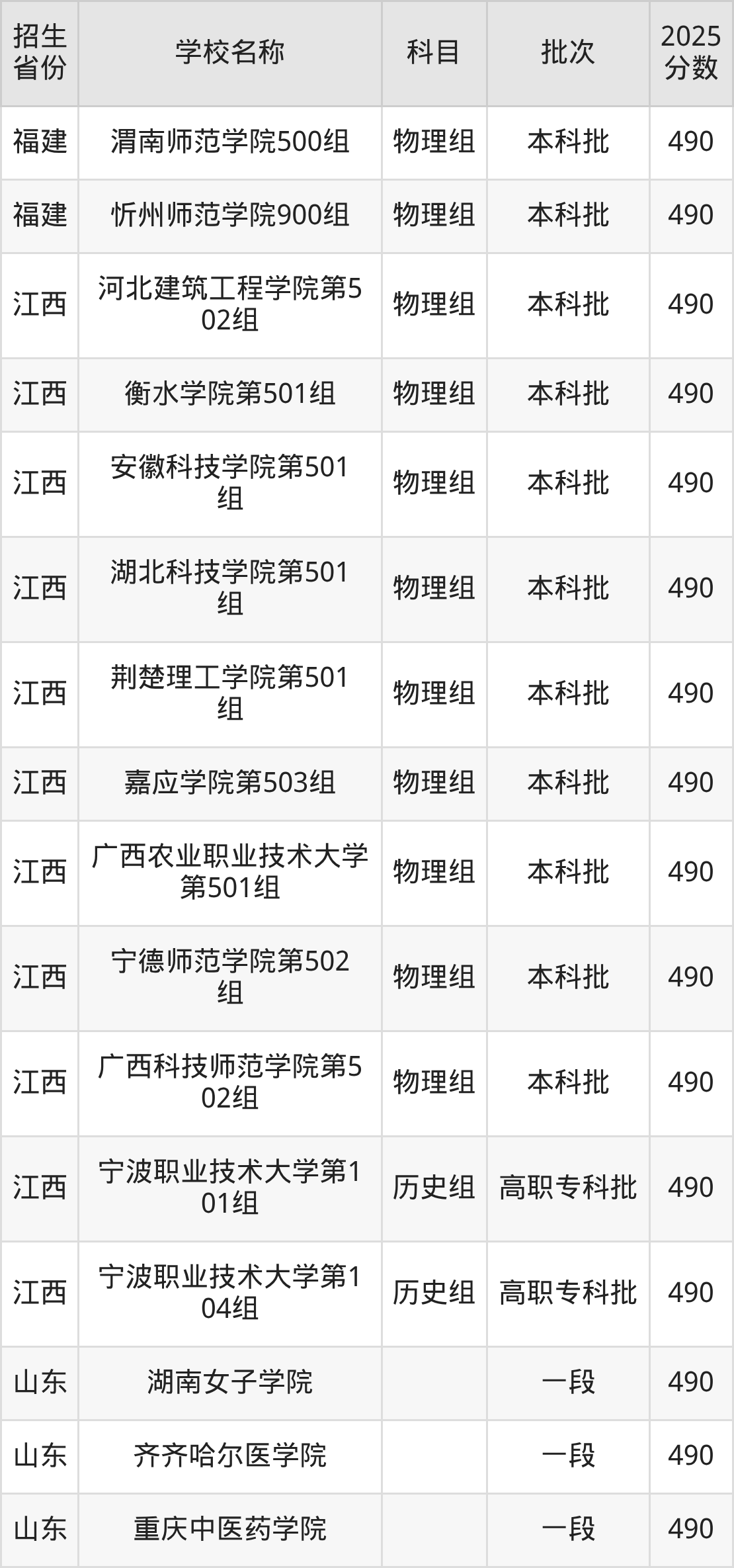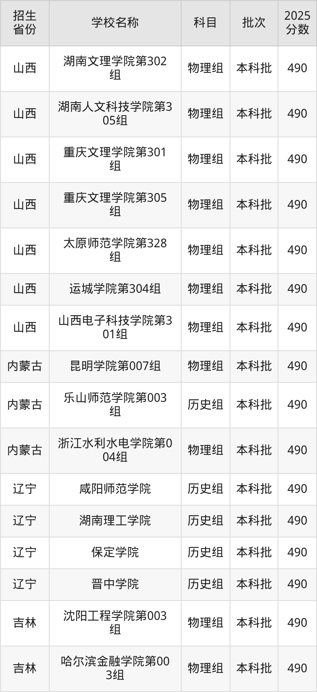 筛选全国各省2025年录取分数线为490分的二本公办大学如下: