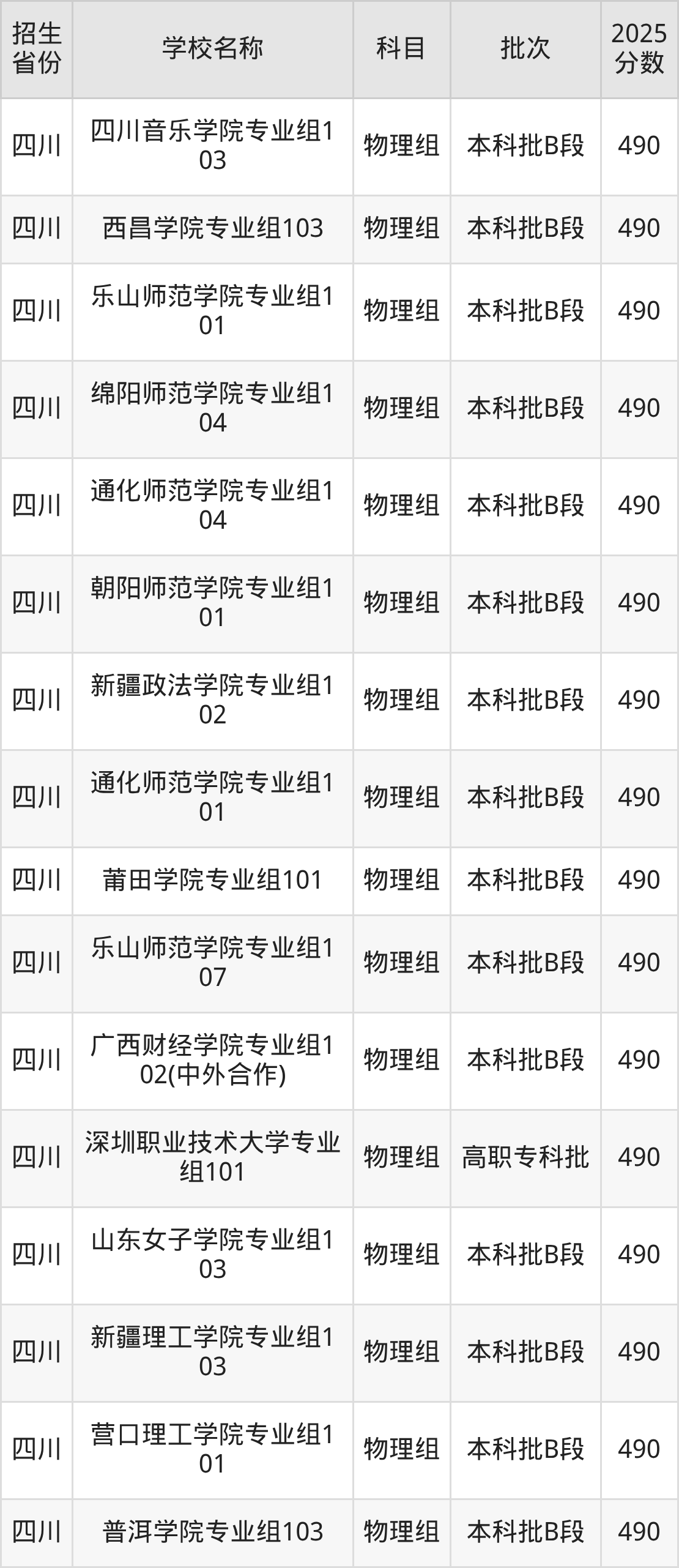 四川省物理组分数线是490分的二本公办大学有:绵阳师范学院、四川音乐学院、西昌学院、乐山师范学院、通化师范学院、朝阳师范学院、新疆政法学院、莆田学院、广西财经学院、深圳职业技术大学。