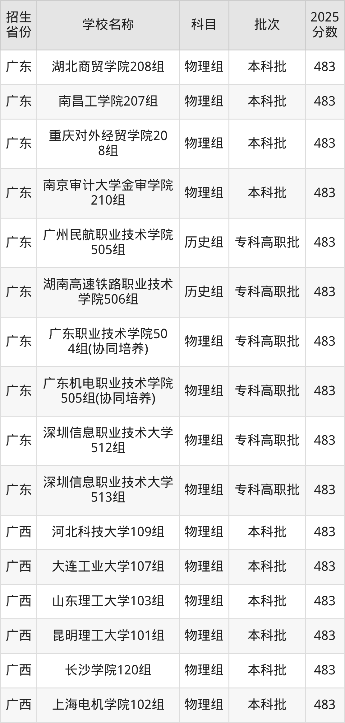 广东省历史组分数线是483分的理科大学有:江西财经大学现代经济管理学院、广州民航职业技术学院、湖南高速铁路职业技术学院。