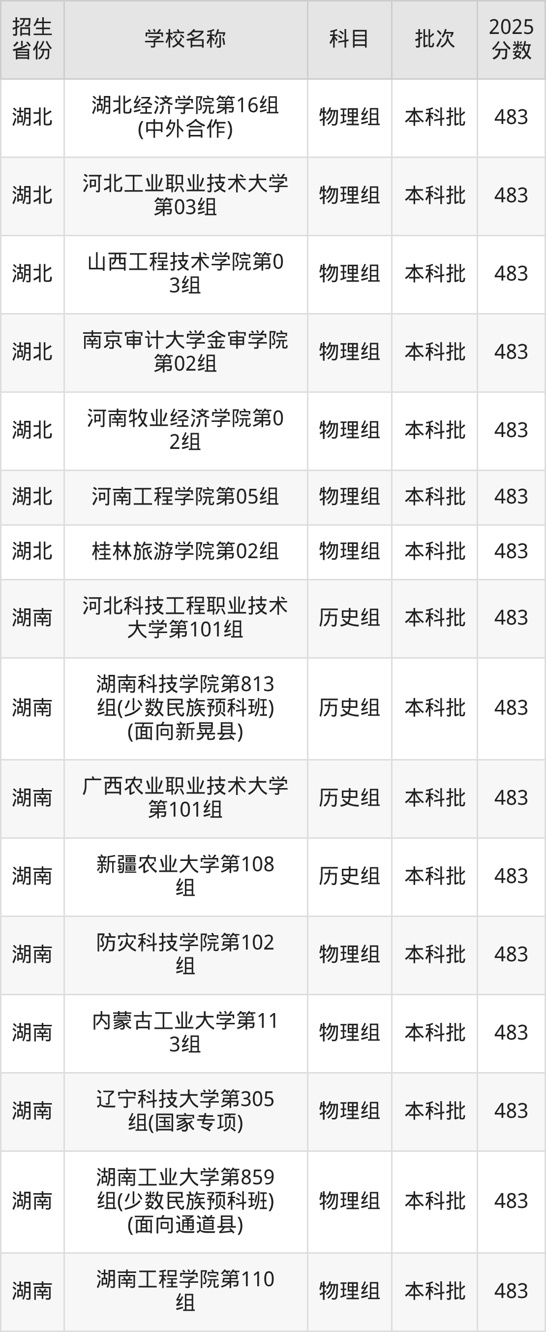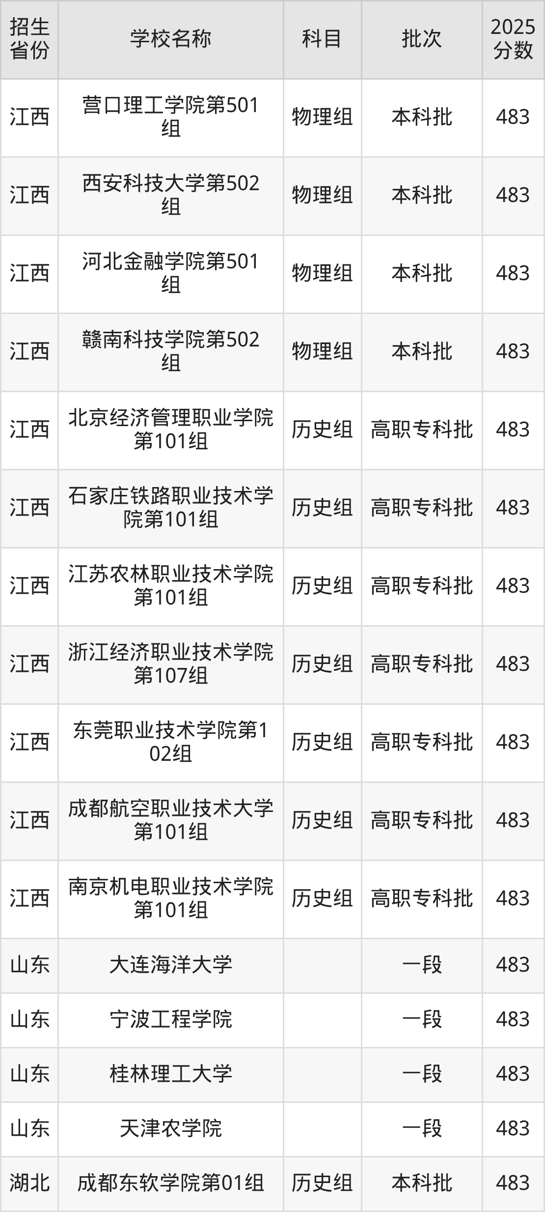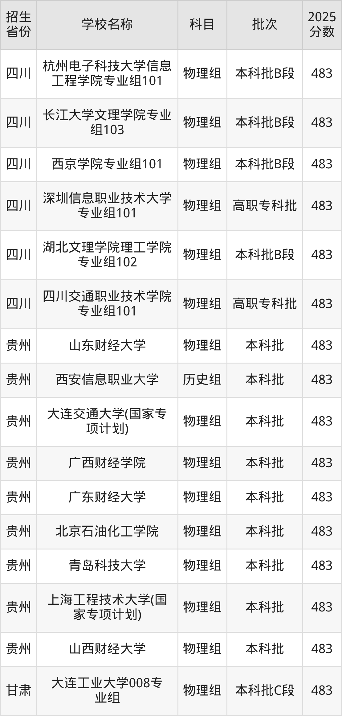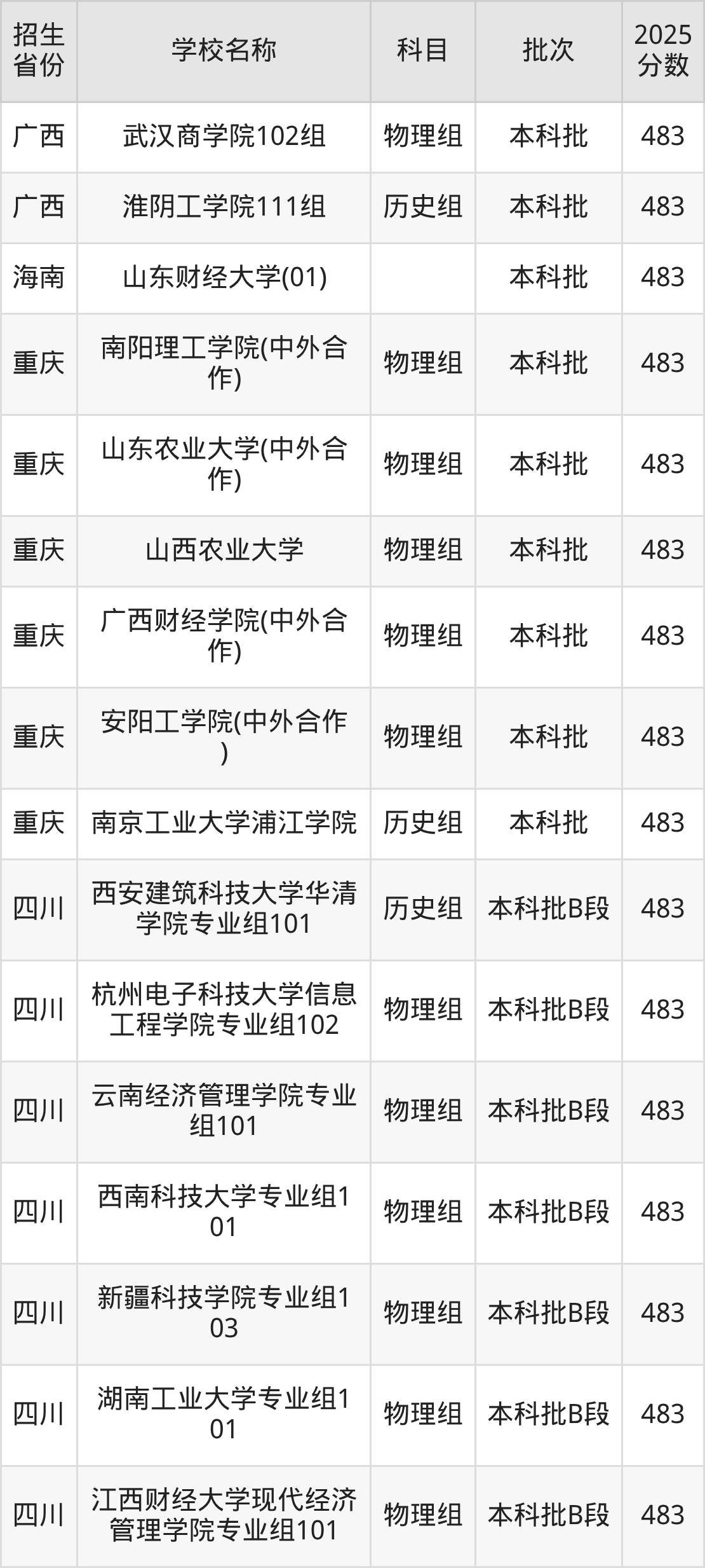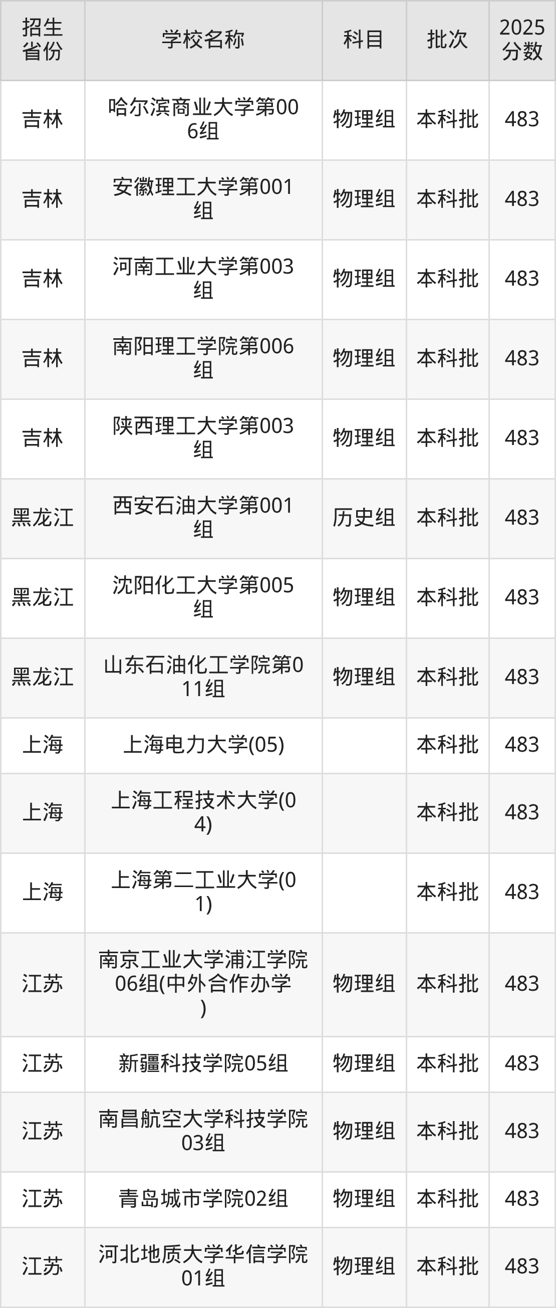 筛选全国各省2025年录取分数线为483分的理科大学如下: