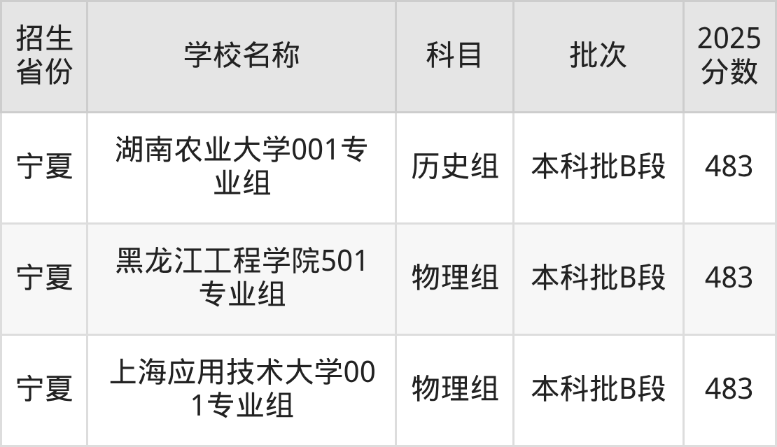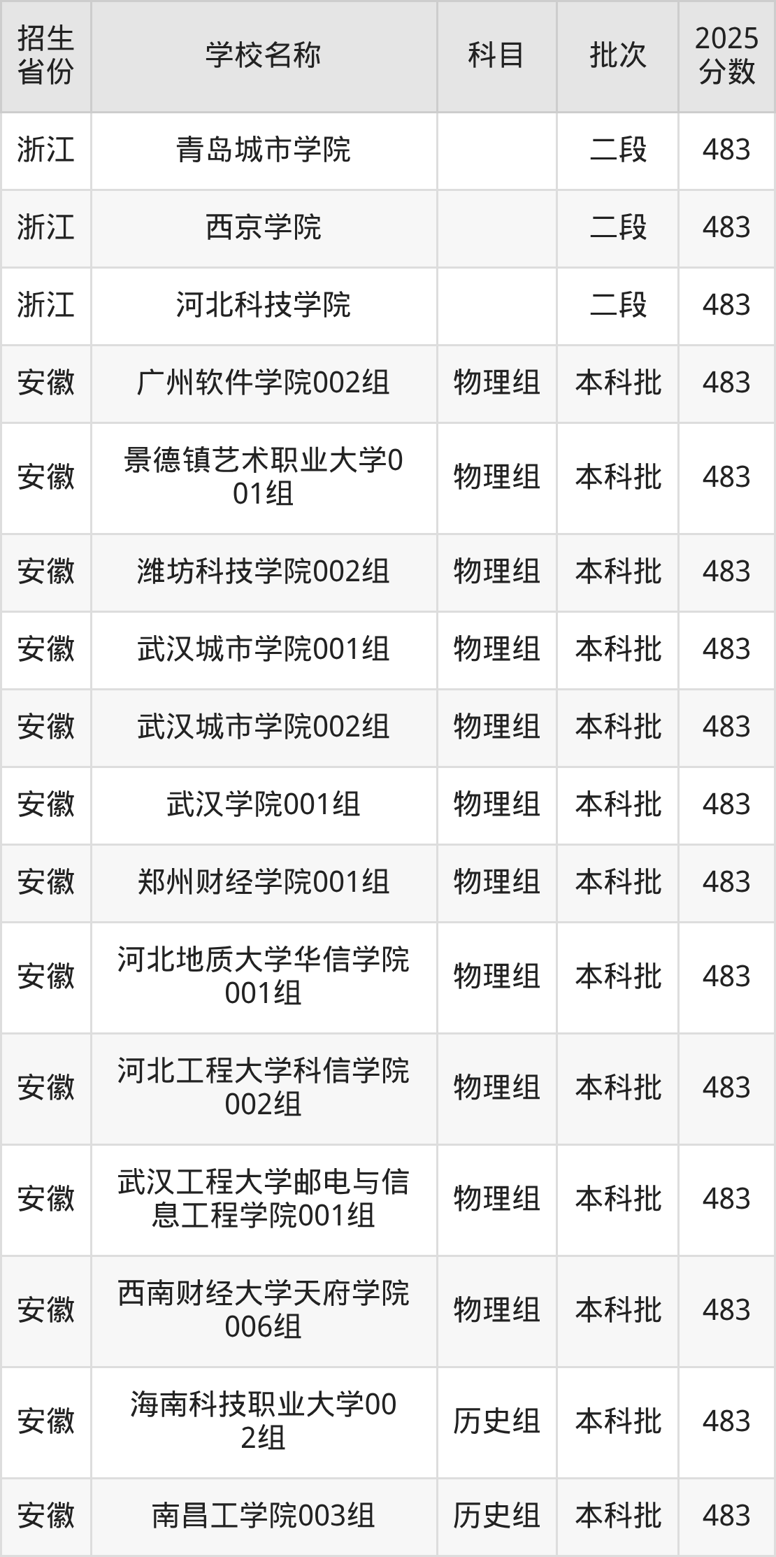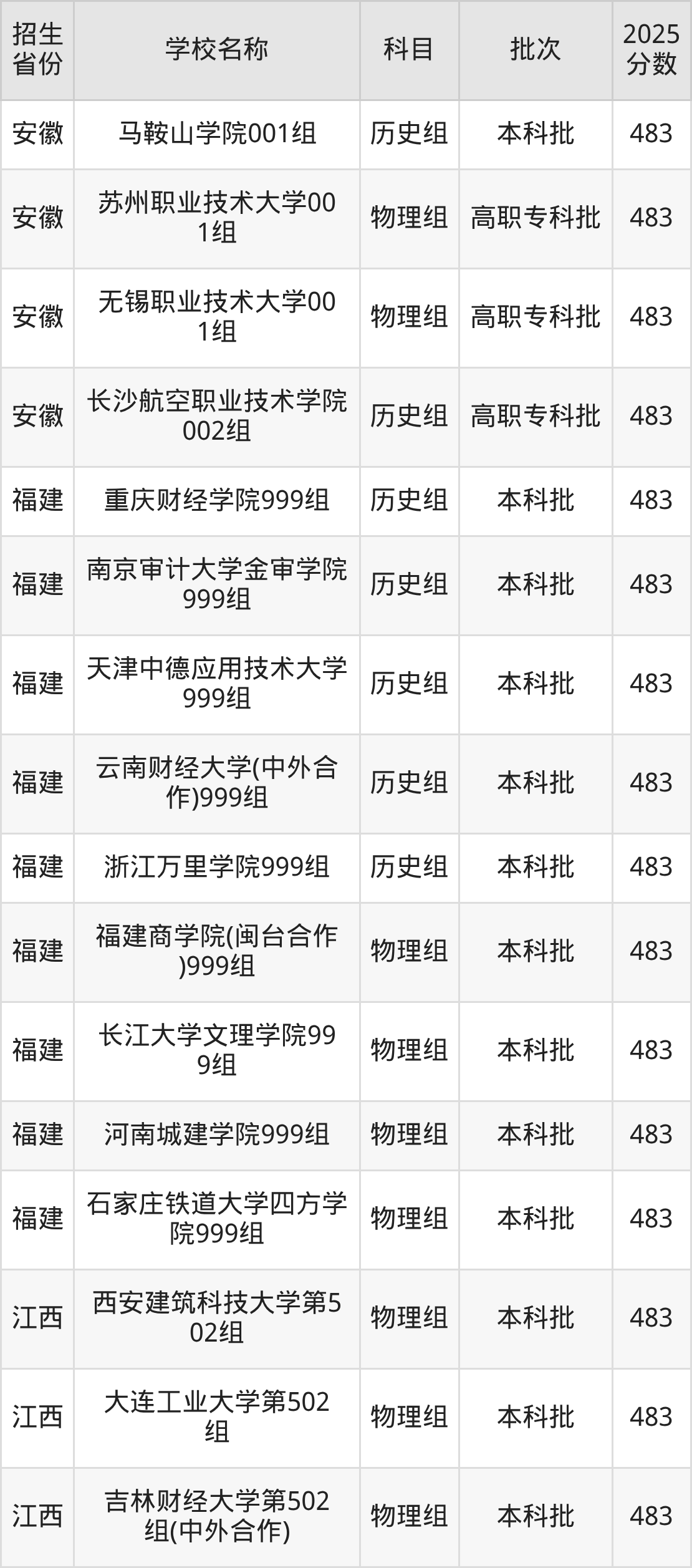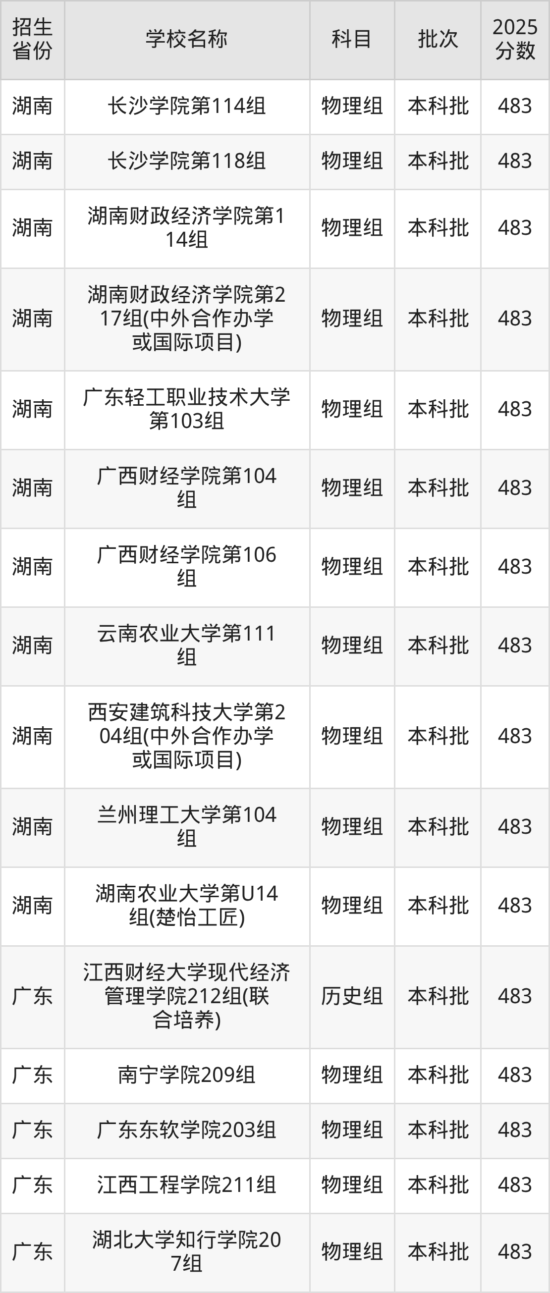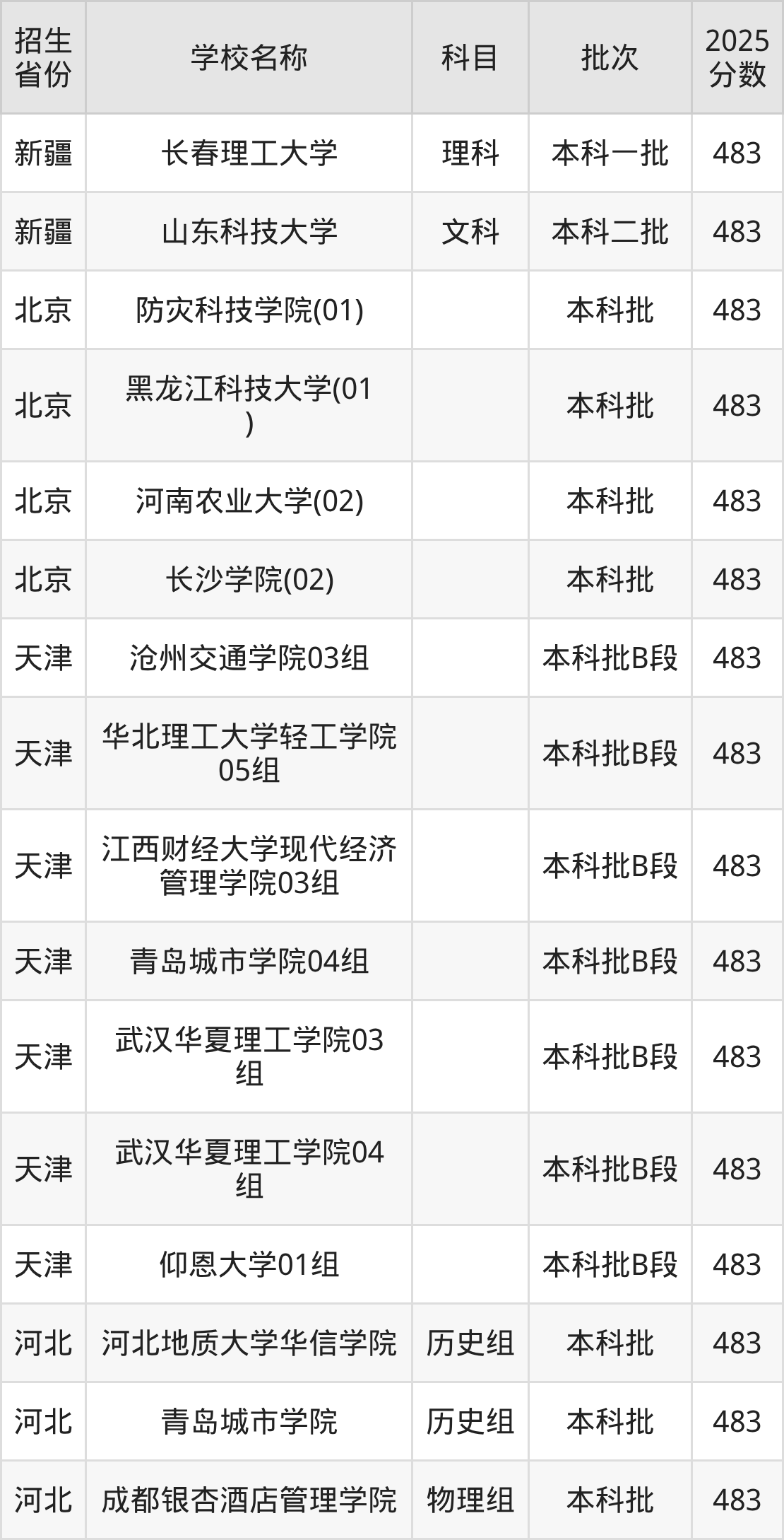 筛选全国各省2025年录取分数线为483分的理科大学如下: