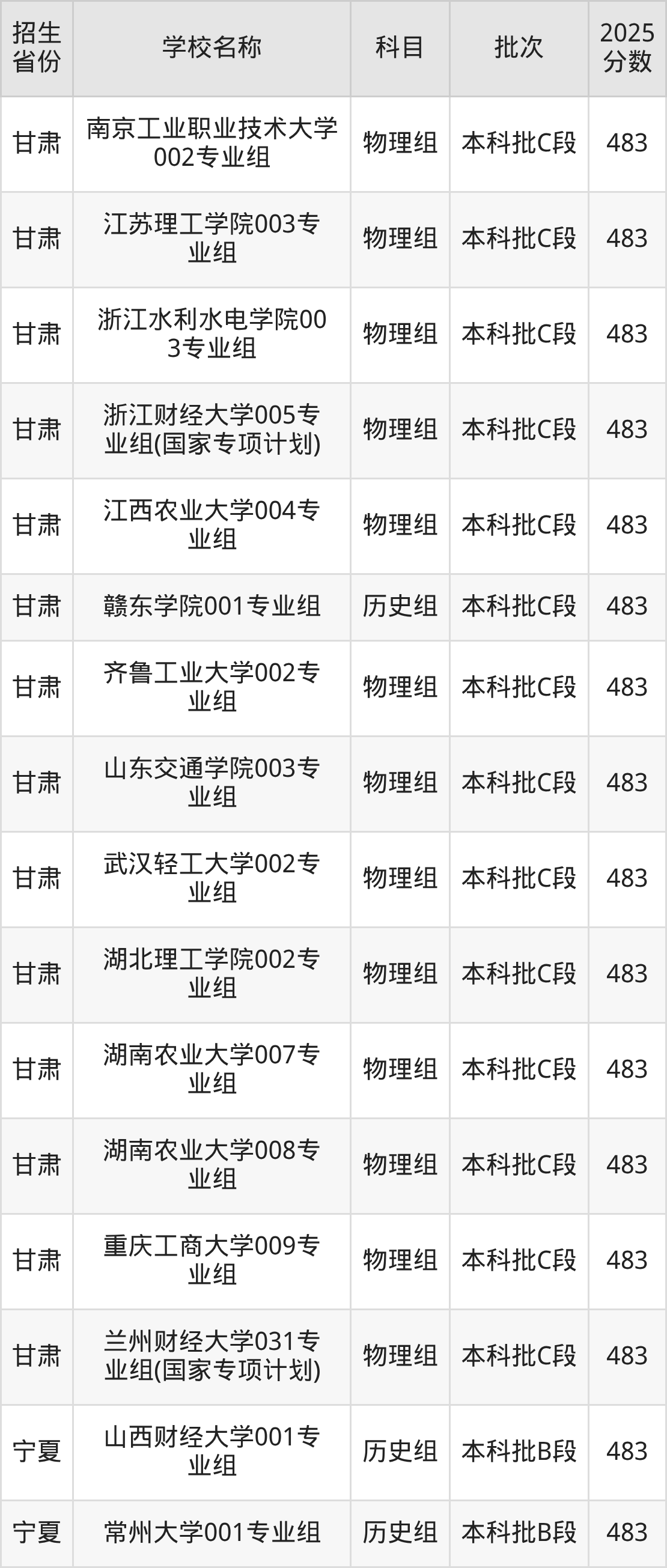 甘肃省历史组分数线是483分的理科大学有:赣东学院。