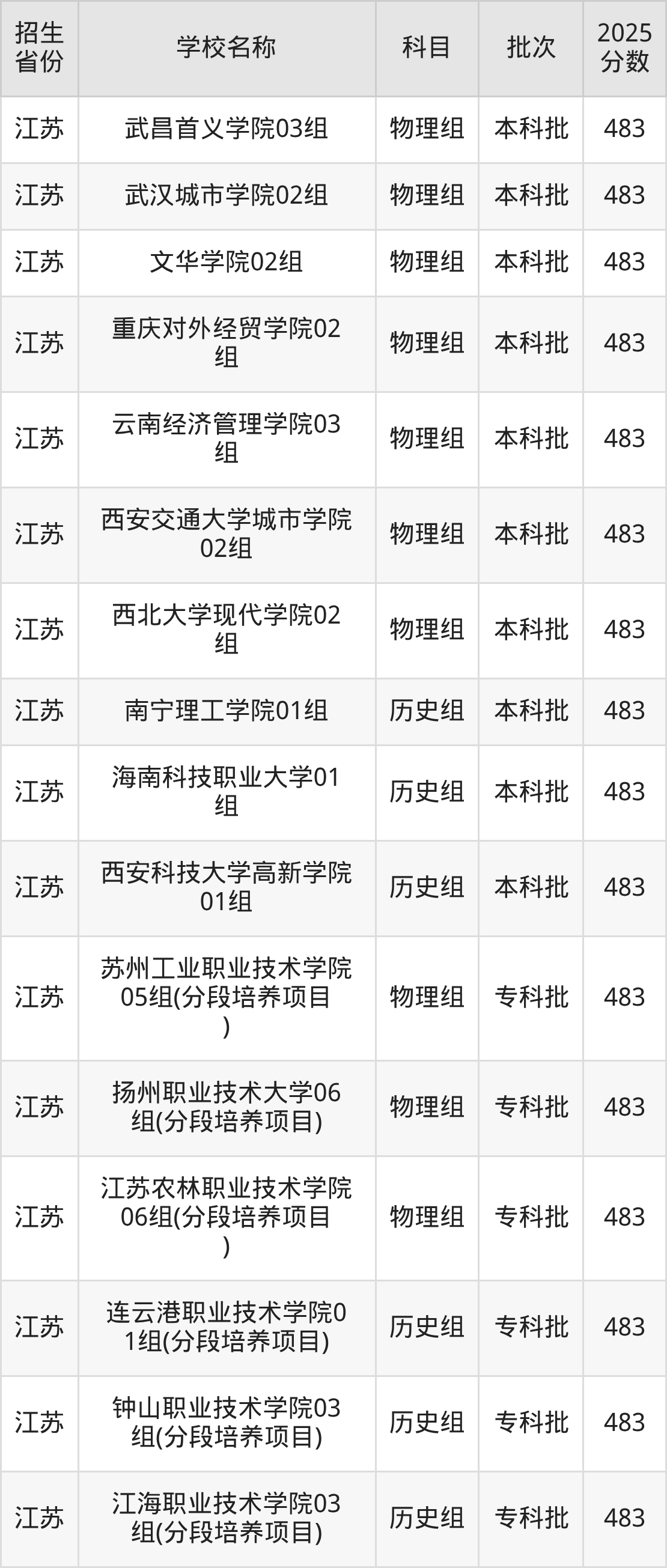 江苏省历史组分数线是483分的理科大学有:南宁理工学院、海南科技职业大学、西安科技大学高新学院、连云港职业技术学院、钟山职业技术学院、江海职业技术学院。