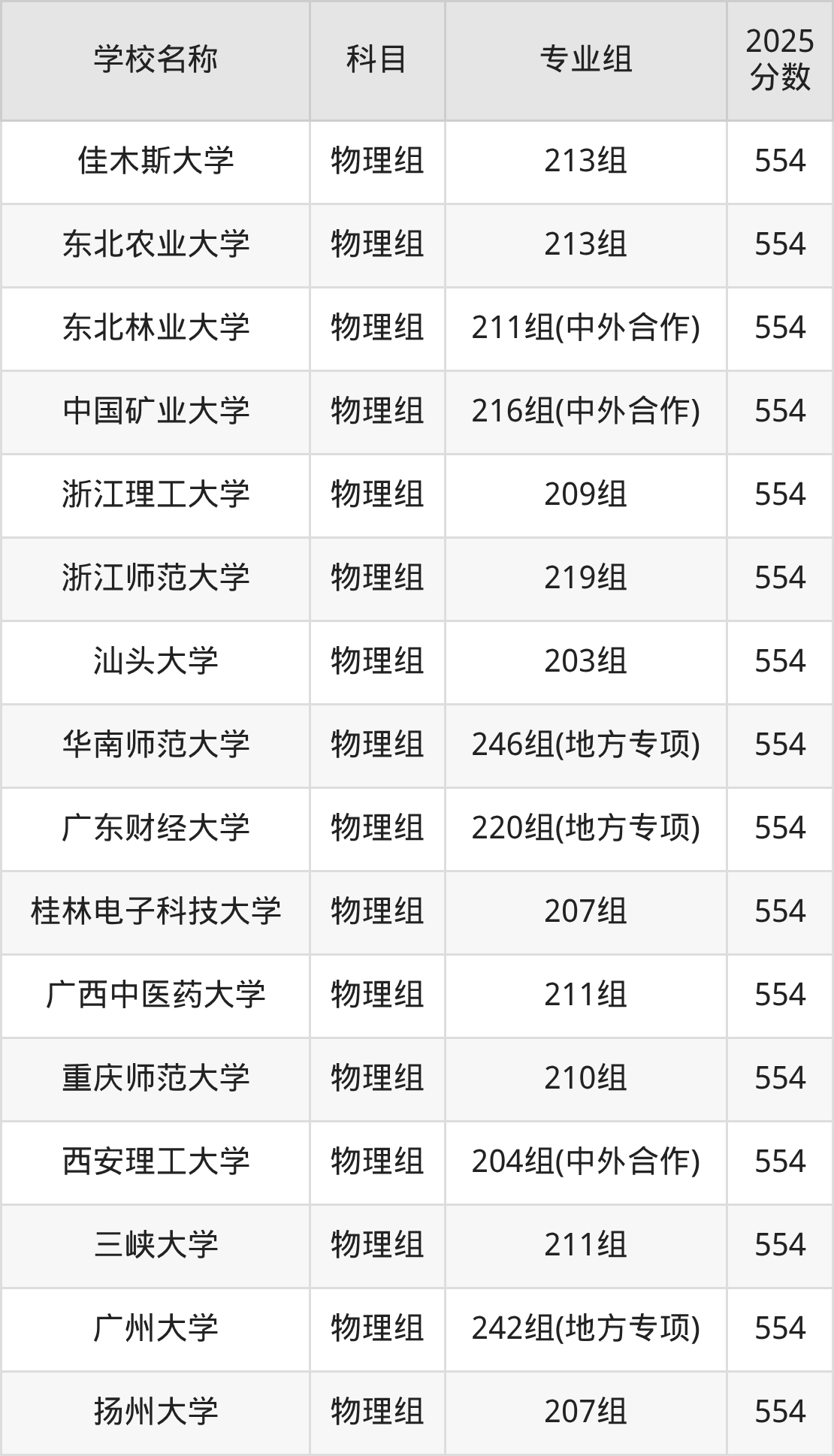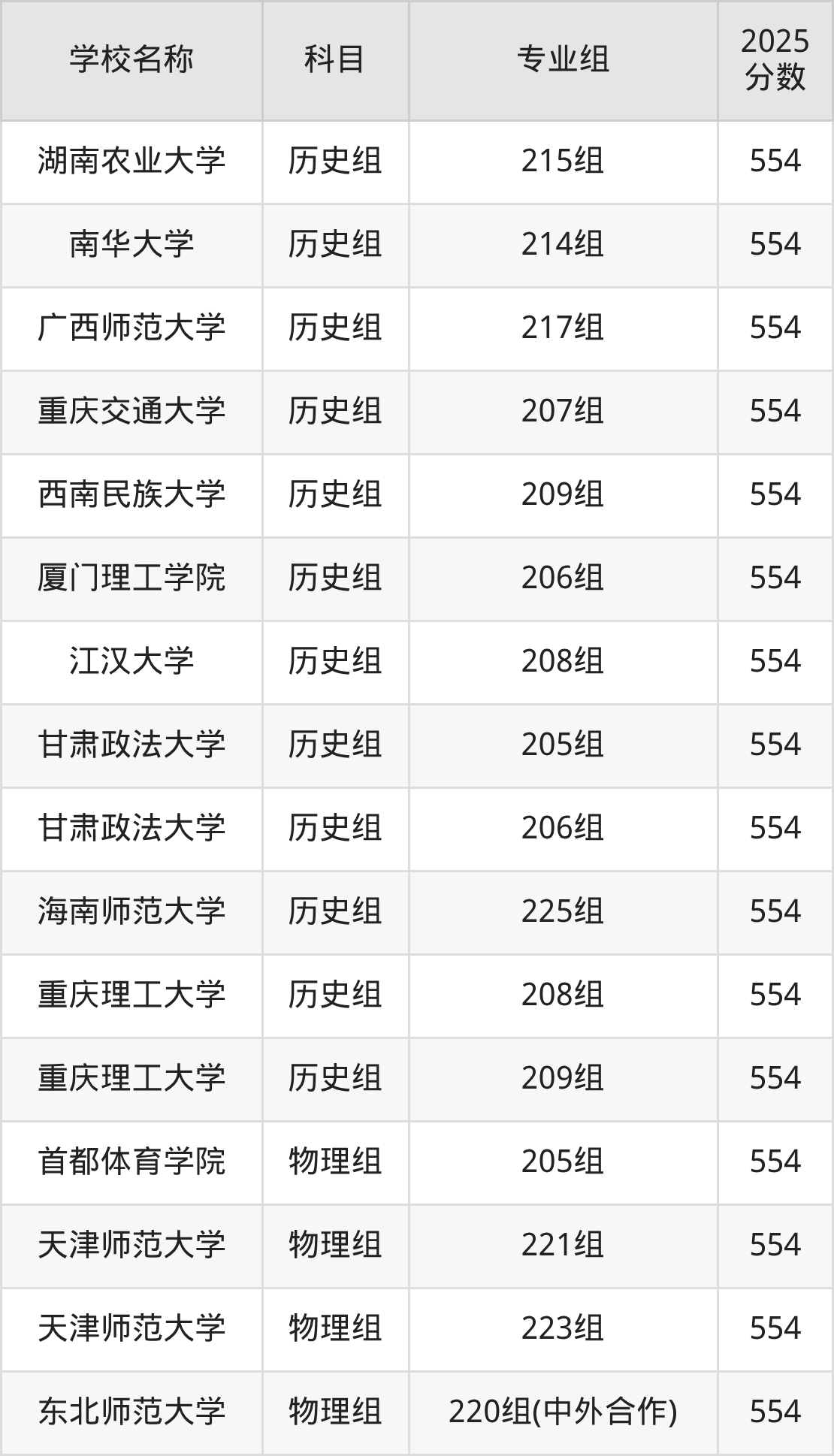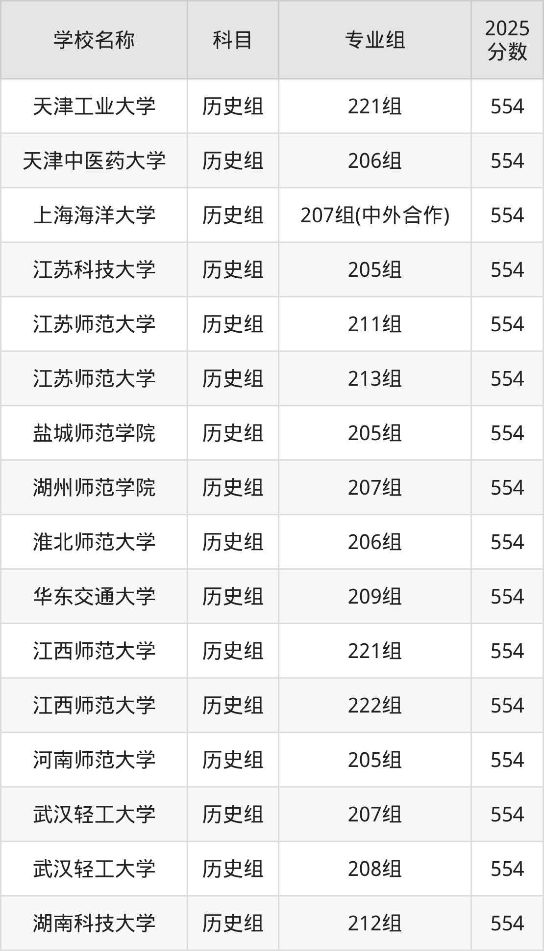 广东高考录取分数线在554分左右的公办院校专业组一共有51个,其中历史组有:天津工业大学(554分)、天津中医药大学(554分)、上海海洋大学(554分),物理组有:首都体育学院(554分)、天津师范大学(554分)、东北师范大学(554分)。
